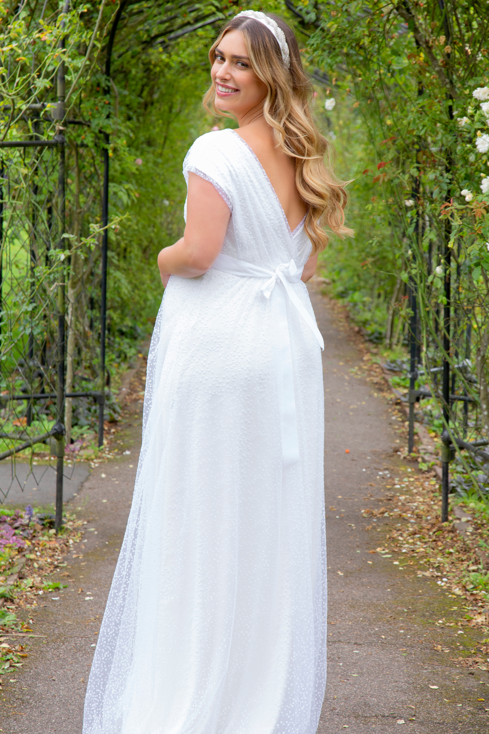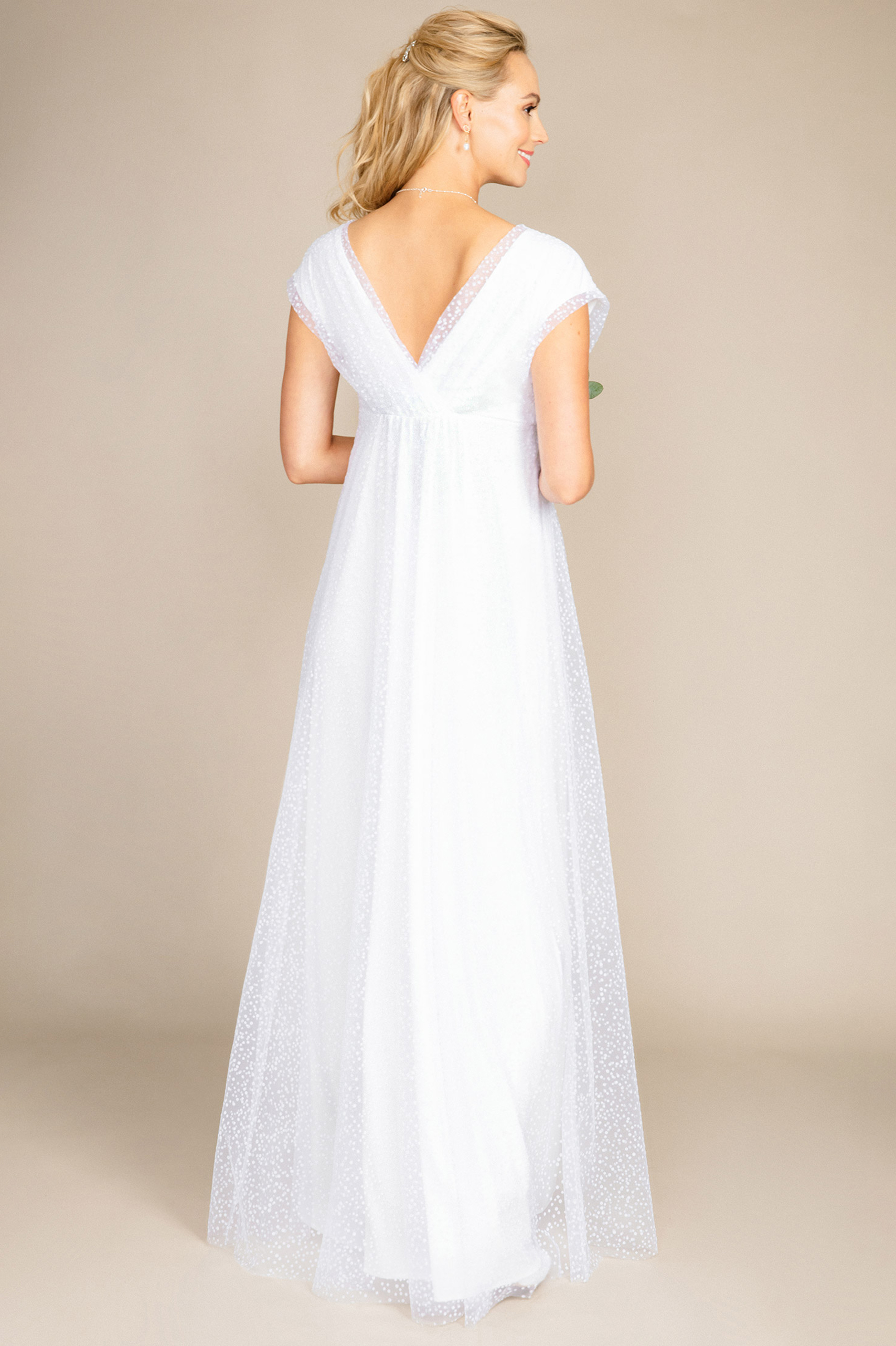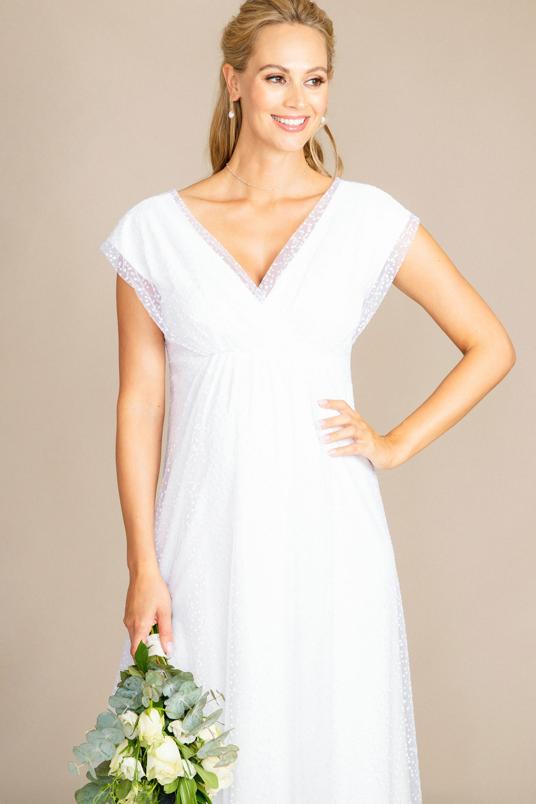 Langes Umstandsbrautkleid mit eleganter Tüll-Spitze mit kleinem Punkte Print und passendem Unterkleid. Die transparente Spitze und das feminine Design mit überschnittenen Schultern und Cache-Coeur Ausschnitt verwandeln die Robe in ein exklusives Traumkleid für deine Hochzeit. Dank der elastischen Taillennaht und dem locker schwingendem Rock hat dein Babybauch ausreichend Platz um zu wachsen. Auch stillen an deinem großen Tag ist kein Problem! Einfach den schönen Cache-Coeur Auschnitt zur Seite schieben und du erhälst einen schnellen und einfachen Stillzugang. Das Kleid kommt ohne Schärpe. Farbe: elfenbein
