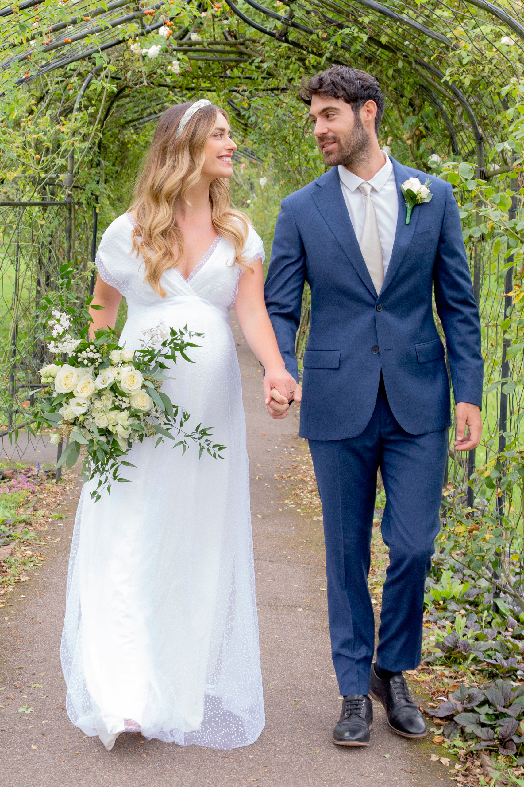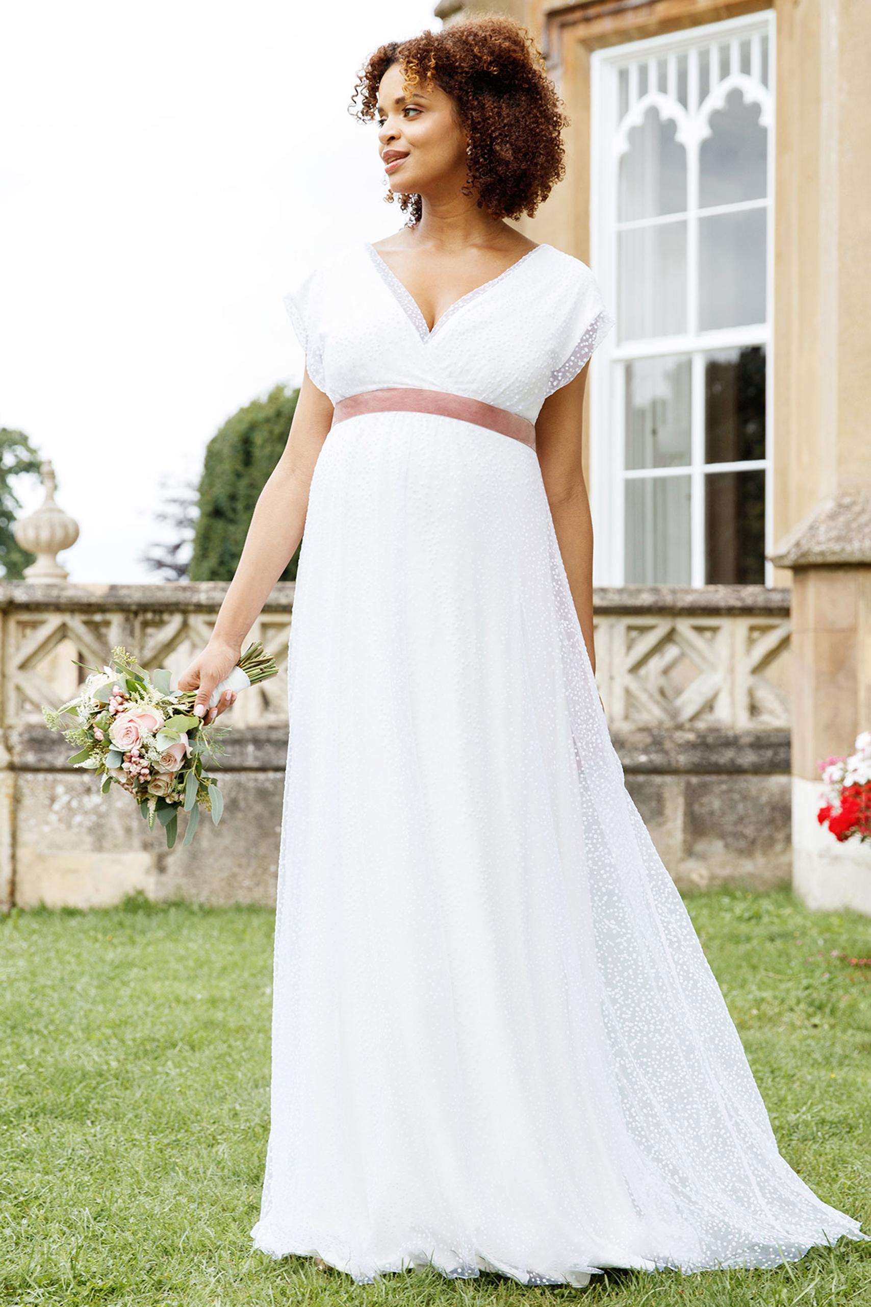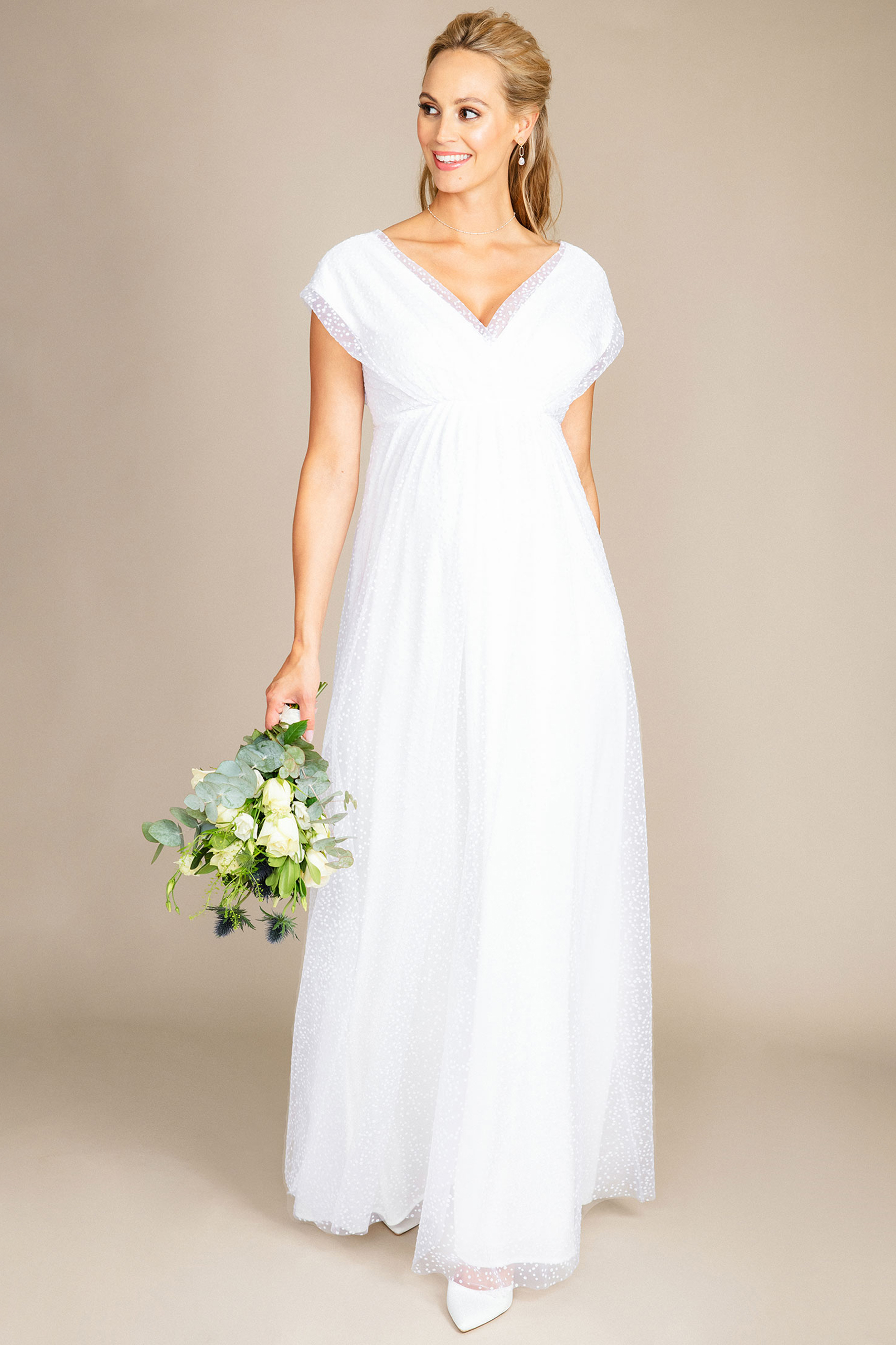 Langes Umstandsbrautkleid mit eleganter Tüll-Spitze mit kleinem Punkte Print und passendem Unterkleid. Die transparente Spitze und das feminine Design mit überschnittenen Schultern und Cache-Coeur Ausschnitt verwandeln die Robe in ein exklusives Traumkleid für deine Hochzeit. Dank der elastischen Taillennaht und dem locker schwingendem Rock hat dein Babybauch ausreichend Platz um zu wachsen. Auch stillen an deinem großen Tag ist kein Problem! Einfach den schönen Cache-Coeur Auschnitt zur Seite schieben und du erhälst einen schnellen und einfachen Stillzugang. Das Kleid kommt ohne Schärpe. Farbe: elfenbein