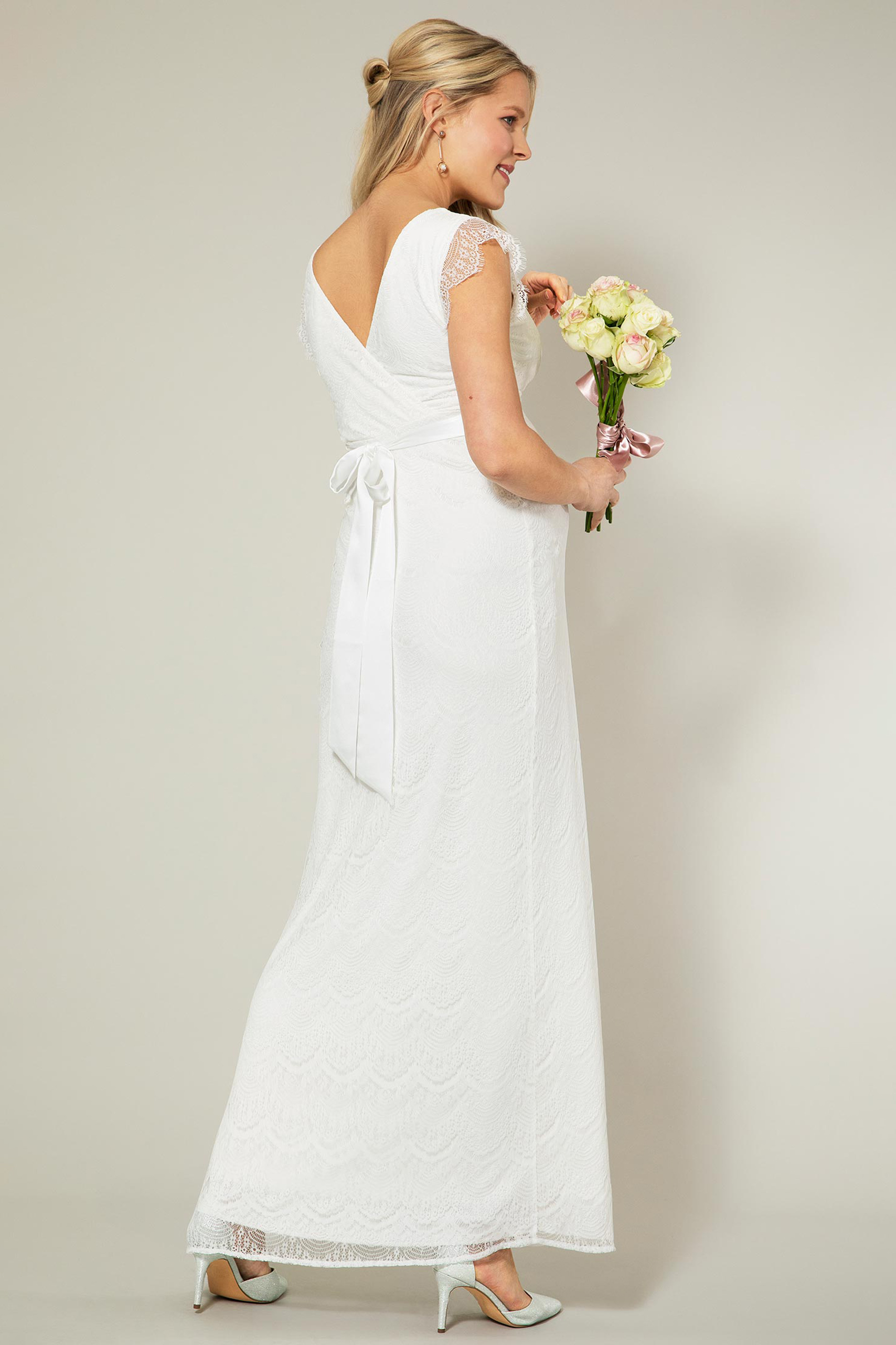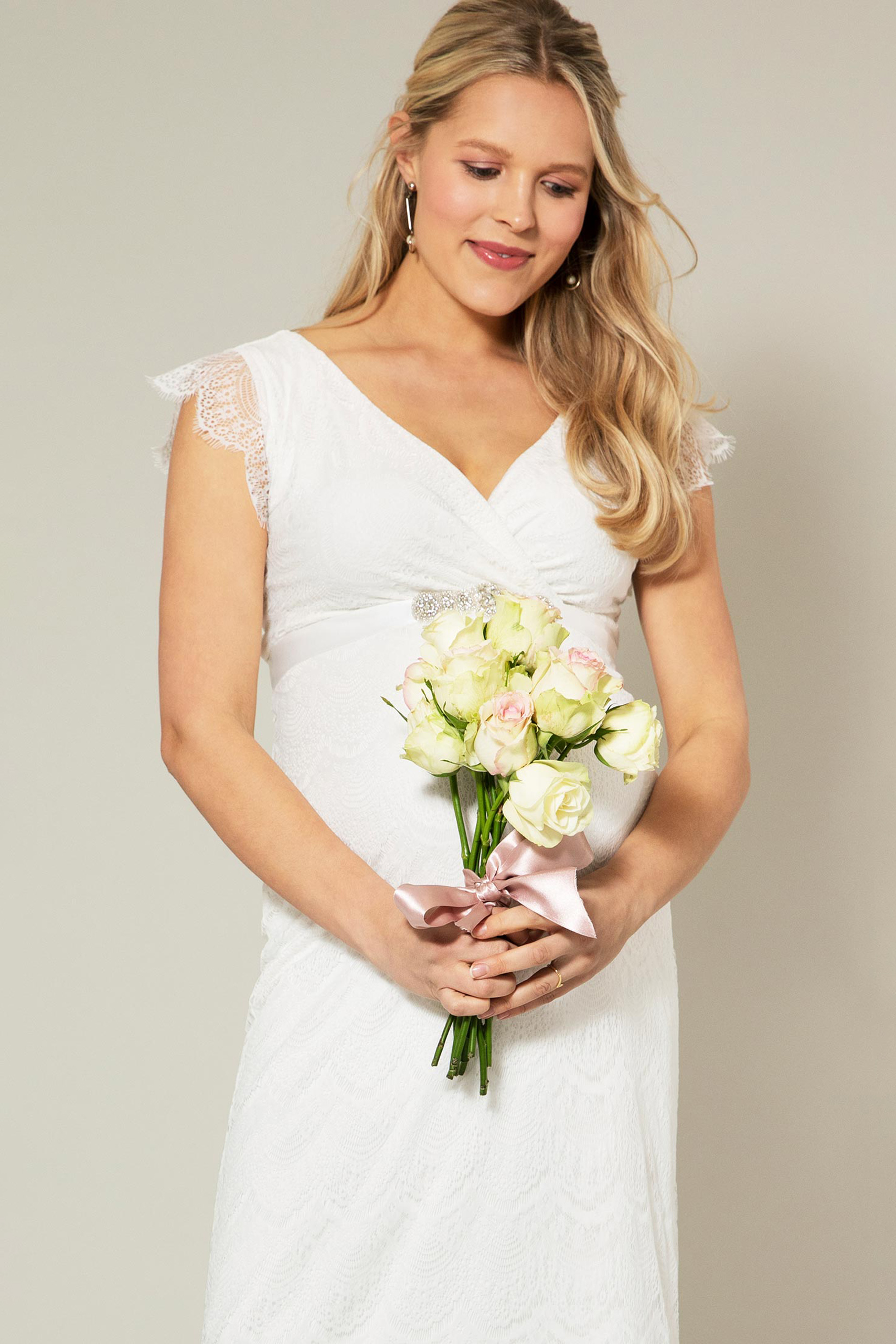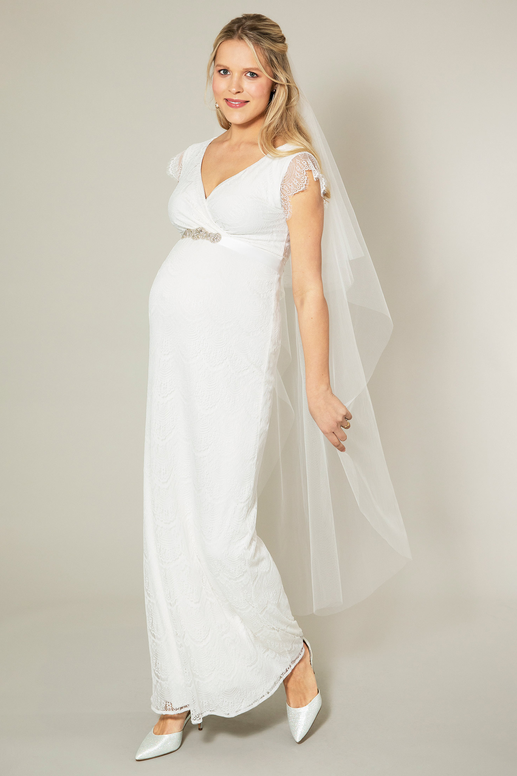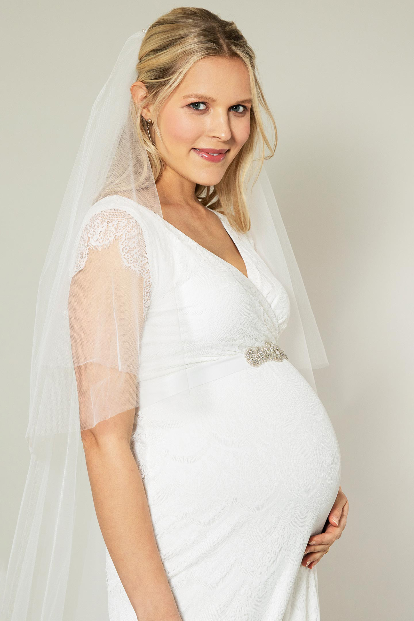 Figurbetontes Umstandsbrautkleid aus Spitze mit Cache-Coeur-Ausschnitt und kurzen, transparenten Ärmeln. Die Empire Line kann mit einer zusätzlichen Schärpe betont werden. Farbe: elfenbein