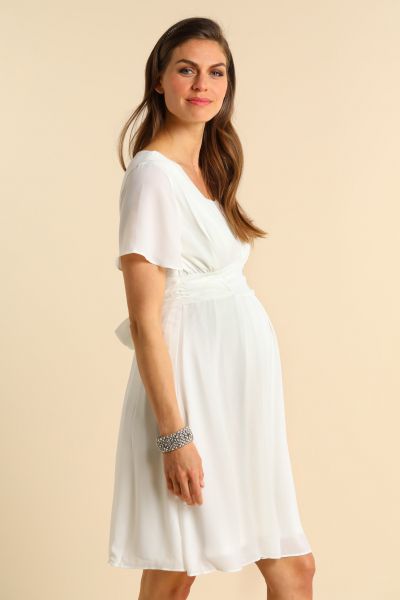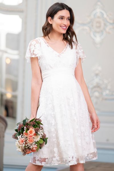 Bist du ein Fan von kurzen Brautkleidern? Mit unseren kurz geschnittenen Umstandskleidern aus floraler Spitze oder mit femininem Spitzenbustier lässt sich ebenfalls ein romantischer Vintage-Look kreieren. Über unseren klassischen Modellen aus weichem, fließenden Stoff kannst du als Kontrast ein locker sitzendes Spitzencape tragen. Zu einem kurzen Hochzeitskleid mit Spitze passen aufwändige Flechtfrisuren und Blumenkränze oder voluminöses, offenes Haar mit Vintage Spange. Antike Ohrringe in Weiß oder Rosé sind tolle Hingucker!