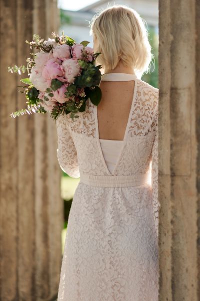 Sehr beliebt sind zum Beispiel unsere langen Umstandsbrautkleider mit floraler Spitze mit aufregendem Rückenausschnitt oder besonderen Spitzenärmeln. Zu diesen Brautkleidern lassen sich edle und verspielte Haargestecke mit Blumen und Perlen kombinieren sowie eine schöne Flechtfrisur. Satin Schärpen oder eine Schärpe mit Schmucksteinen besetzt sorgen für eine besonders schöne Empire Linie. Diese darf bei einer Vintage Hochzeitsfeier extra elegant betont werden.