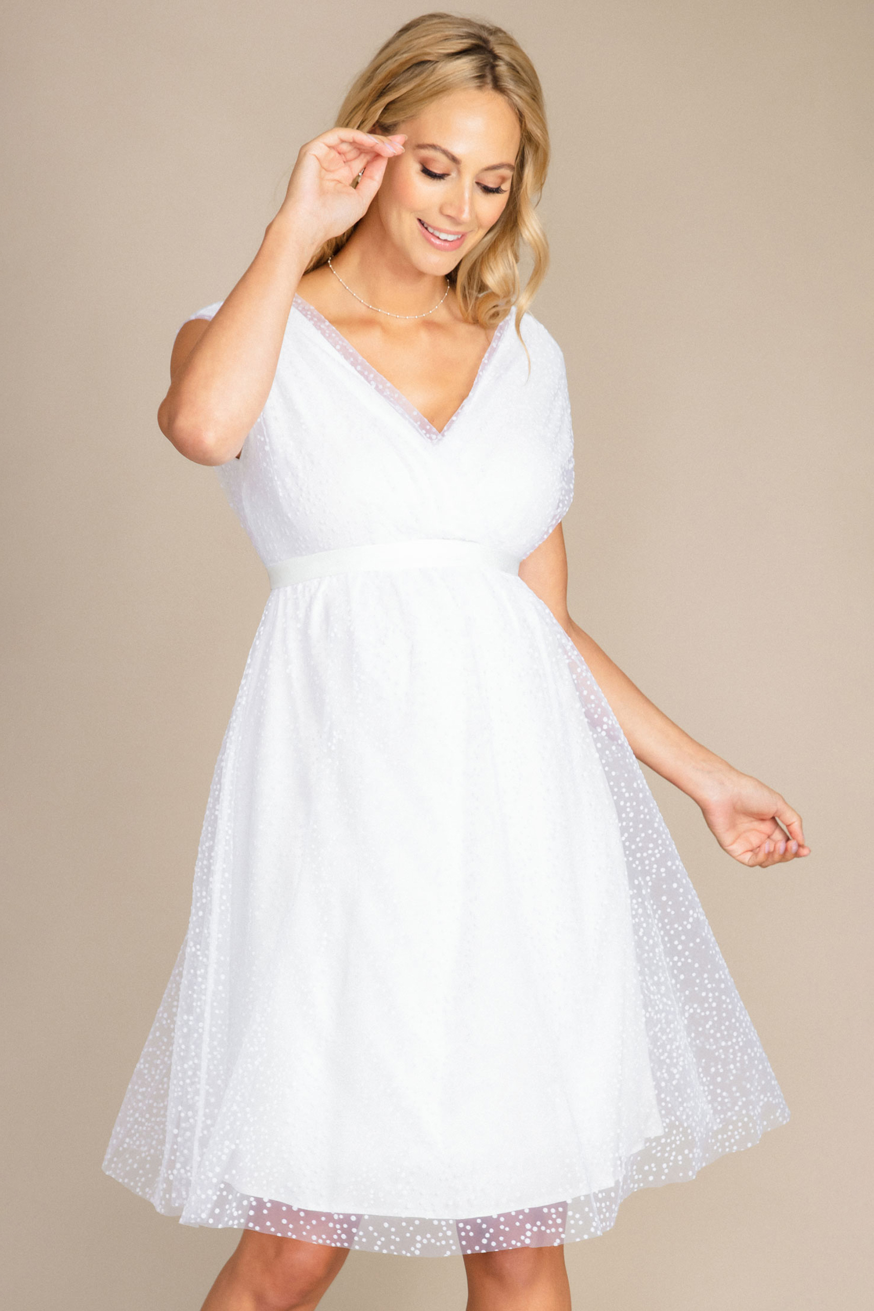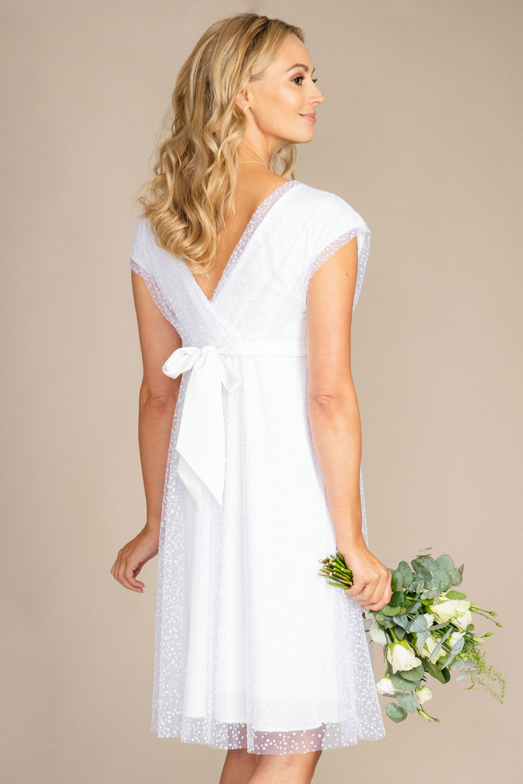 Kurzes Umstandsbrautkleid mit eleganter Tüll-Spitze mit kleinem Punkte Print und passendem Unterkleid. Die transparente Spitze und das feminine Design mit überschnittenen Schultern und Cache-Coeur Ausschnitt und Rockteil in A-Linie, machen das Brautkleid zu einem besonderen Highlight. Dank der elastischen Taillennaht und dem leicht ausgestelltem Rock, passt dir das Kleid, egal in welcher Schwangerschaftswoche du bist. Das wunderschöne Kleid dient gleichzeitig auch als Still-Brautkleid. Einfach den schönen Cache-Coeur Auschnitt zur Seite schieben und du erhältst einen schnellen und einfachen Stillzugang. Das Kleid kommt ohne Schärpe. Farbe: elfenbein