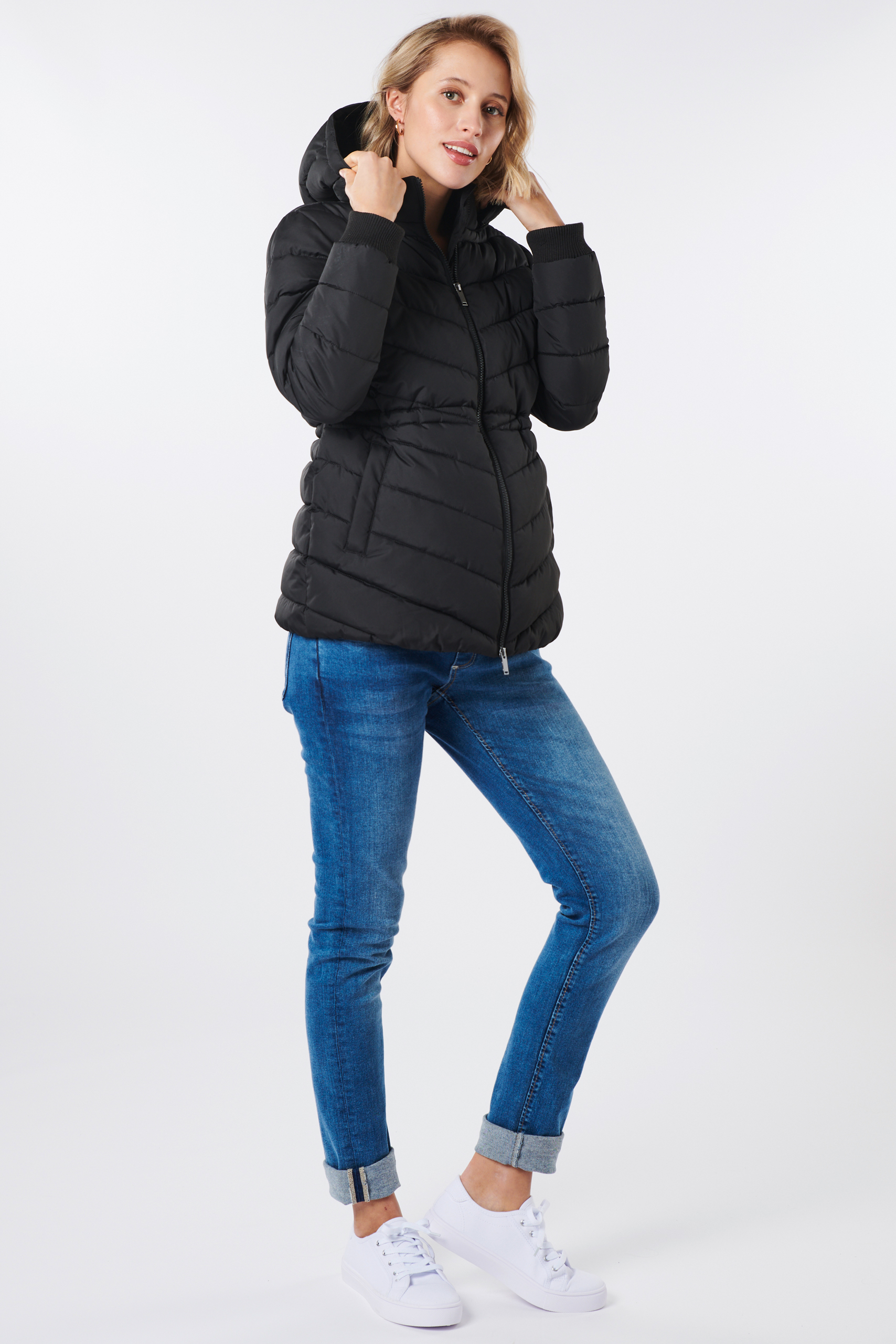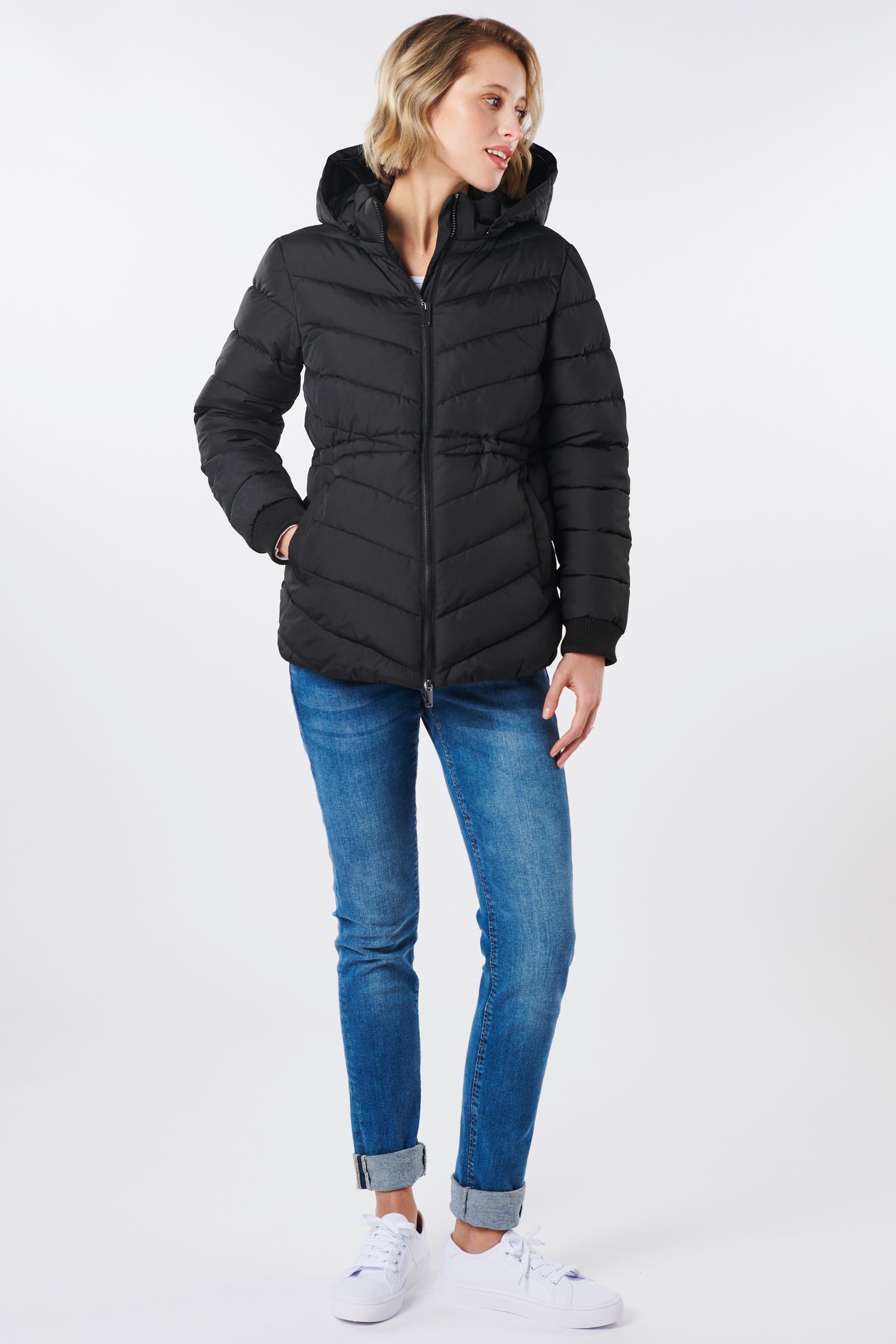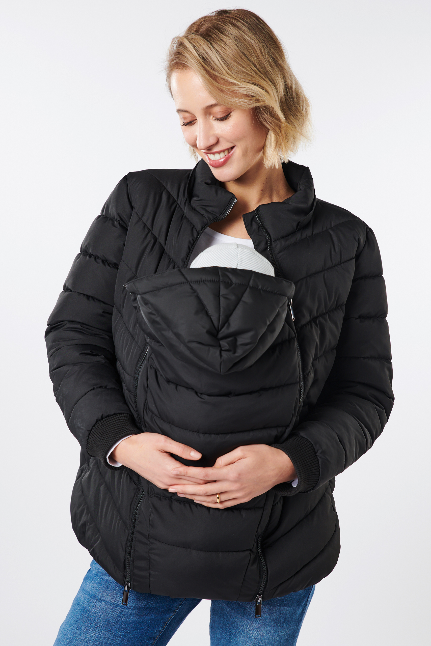 Eco 3 in 1 Umstandsjacke modern gesteppt, mit extra Babytrageeinsatz für nach der Geburt. Die Steppjacke aus recyceltem Nylon hat einen gepflegt sportlichen Look mit bequemen Ärmel-Bündchen, seitlichen Eingriffstaschen und einer praktisch abnehmbare Kapuze. Dank einem verstellbaren, elastischen Kordelzug kannst du die Jacke perfekt an deine Silhouette anpassen, egal ob mit oder ohne Babybauch. Um dein Baby kuschelig nah bei dir zu tragen, kannst du den gefütterten Babytrageeinsatz ganz unkompliziert einzippen. Die Jacke ist der ideale Begleiter für Herbst- und Winterwetter und wurde entwickelt, um sie während der Schwangerschaft, mit Babytrageinsatz und lange danach zu tragen. Farbe: schwarz