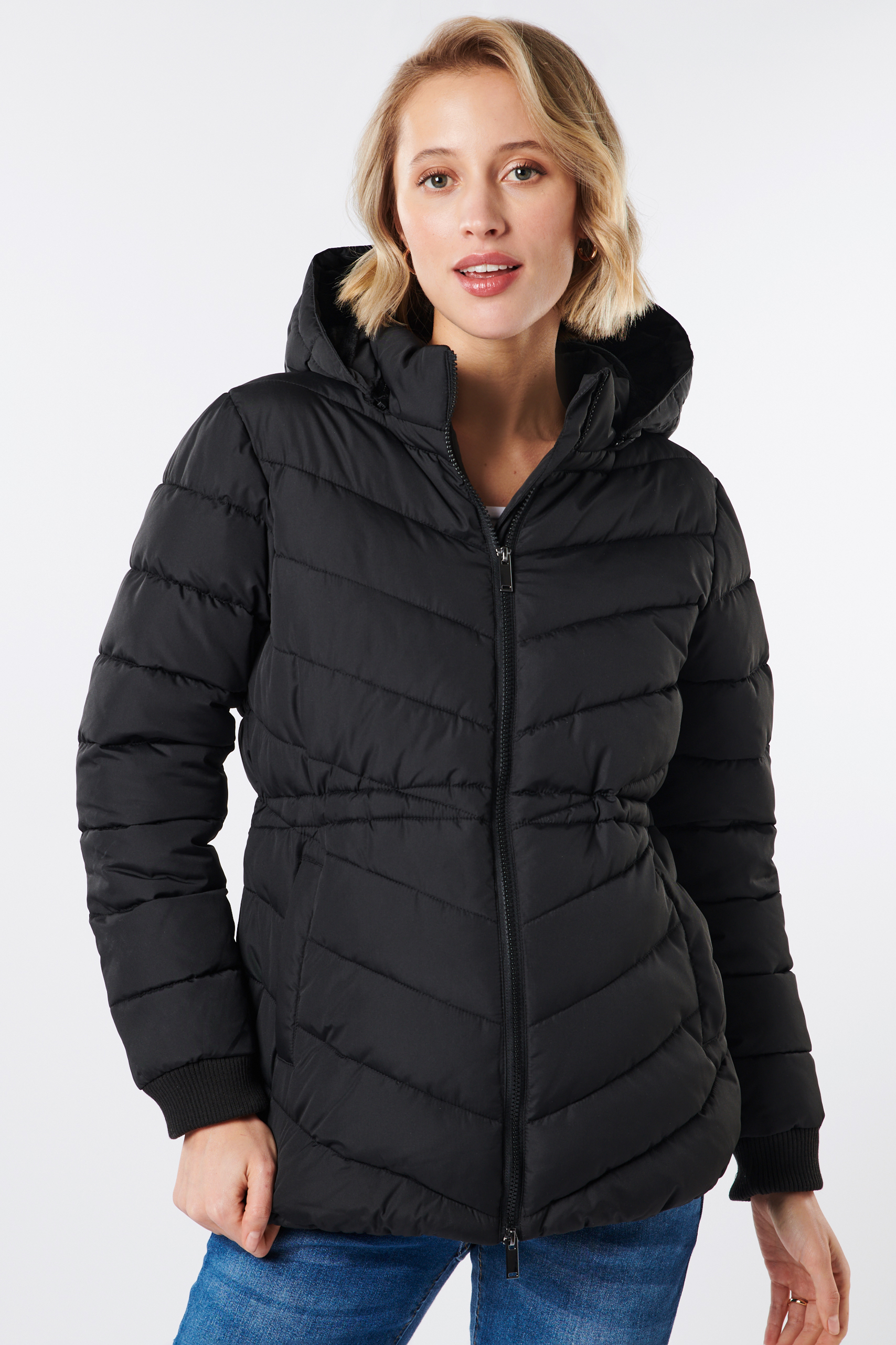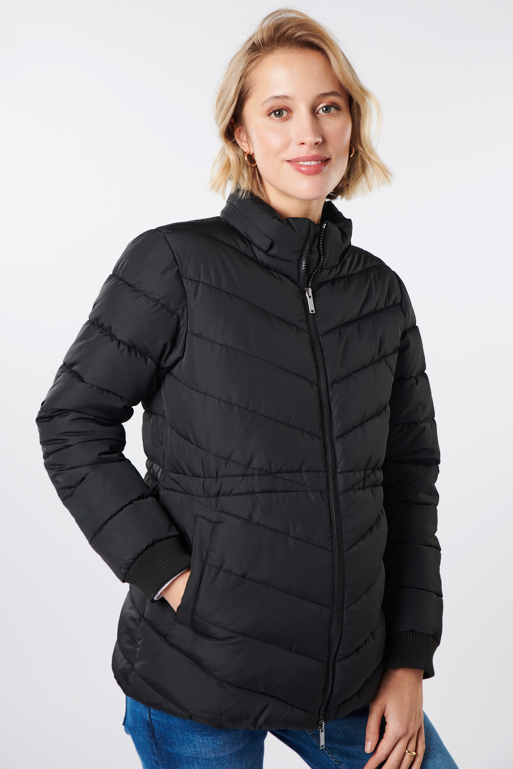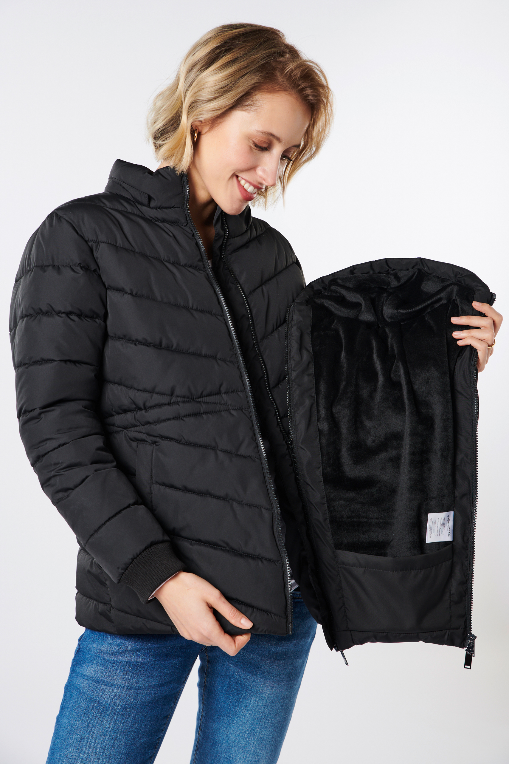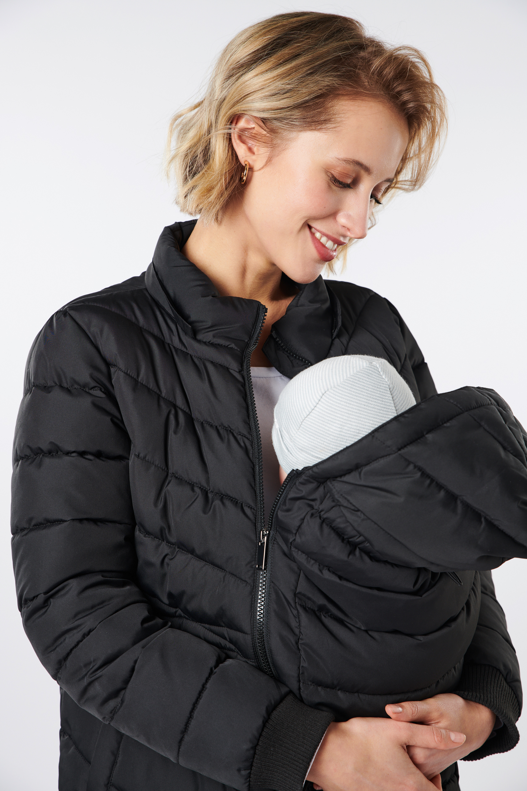 Eco 3 in 1 Umstandsjacke modern gesteppt, mit extra Babytrageeinsatz für nach der Geburt. Die Steppjacke aus recyceltem Nylon hat einen gepflegt sportlichen Look mit bequemen Ärmel-Bündchen, seitlichen Eingriffstaschen und einer praktisch abnehmbare Kapuze. Dank einem verstellbaren, elastischen Kordelzug kannst du die Jacke perfekt an deine Silhouette anpassen, egal ob mit oder ohne Babybauch. Um dein Baby kuschelig nah bei dir zu tragen, kannst du den gefütterten Babytrageeinsatz ganz unkompliziert einzippen. Die Jacke ist der ideale Begleiter für Herbst- und Winterwetter und wurde entwickelt, um sie während der Schwangerschaft, mit Babytrageinsatz und lange danach zu tragen. Farbe: schwarz