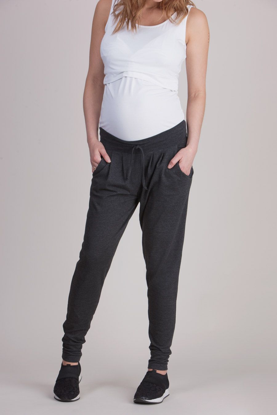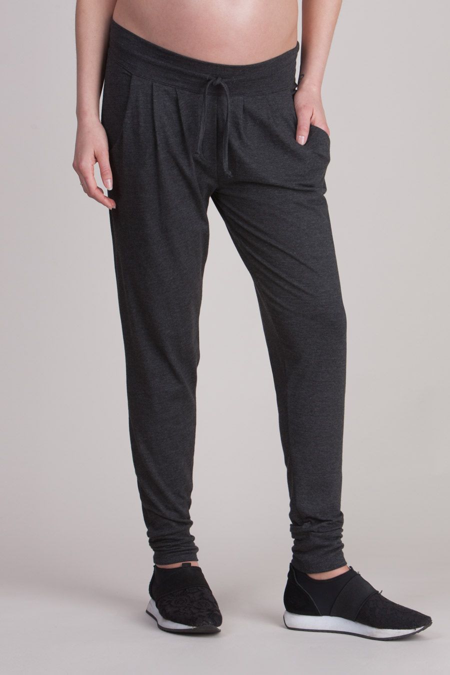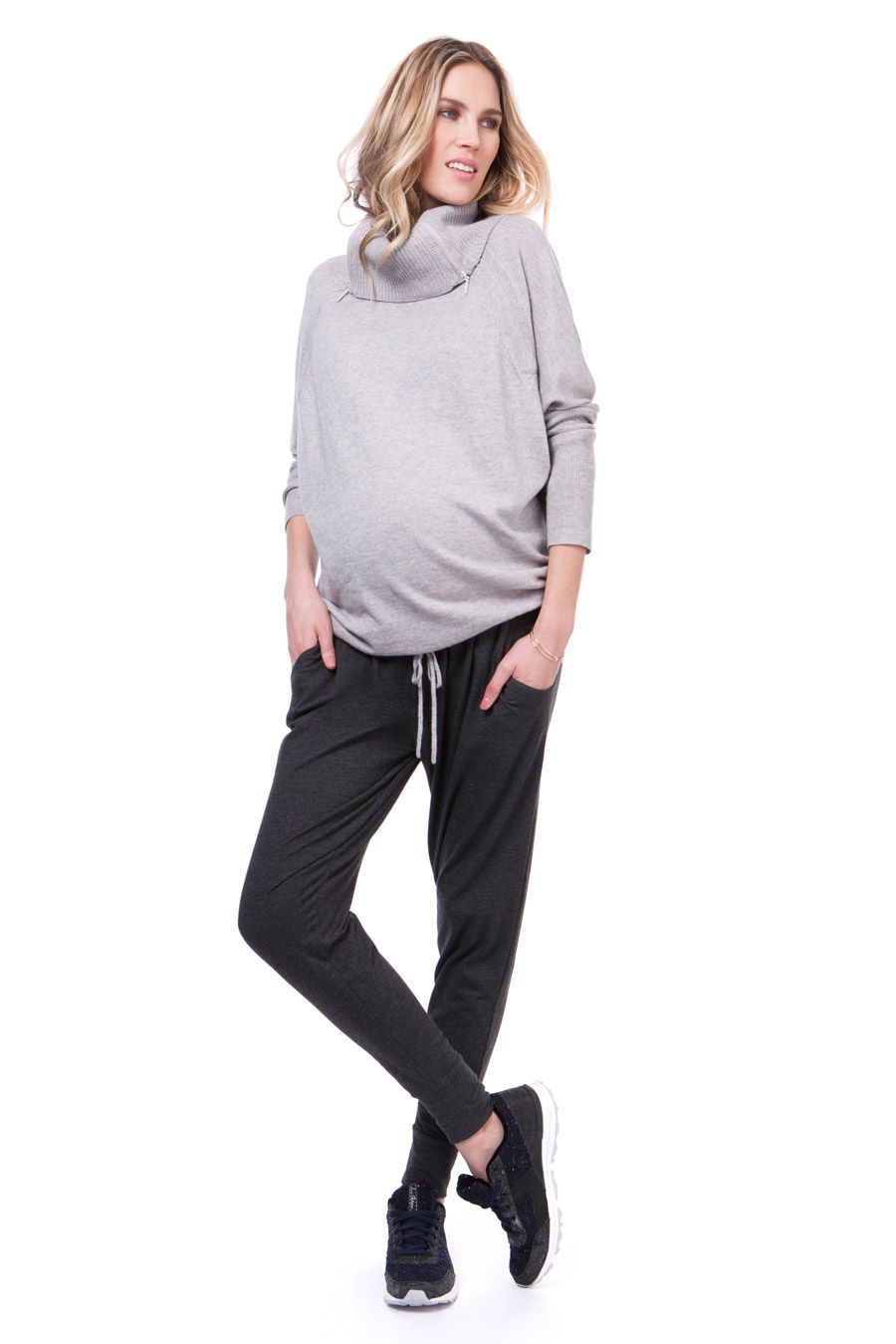 Lockere Lounge-Umstandshose mit eng geschnittenen Beinabschlüssen, Eingrifftaschen und Tunnelzug am Unterbauchband. Aus softem Sweatstoff mit weichem Baumwoll-Futter.
