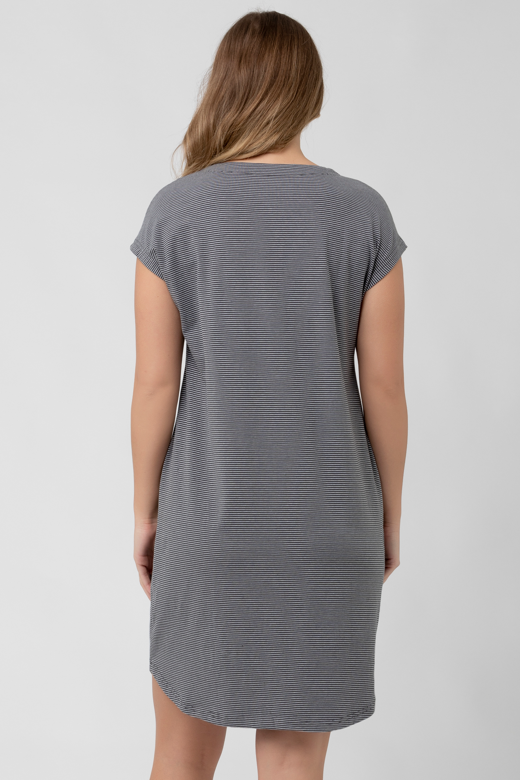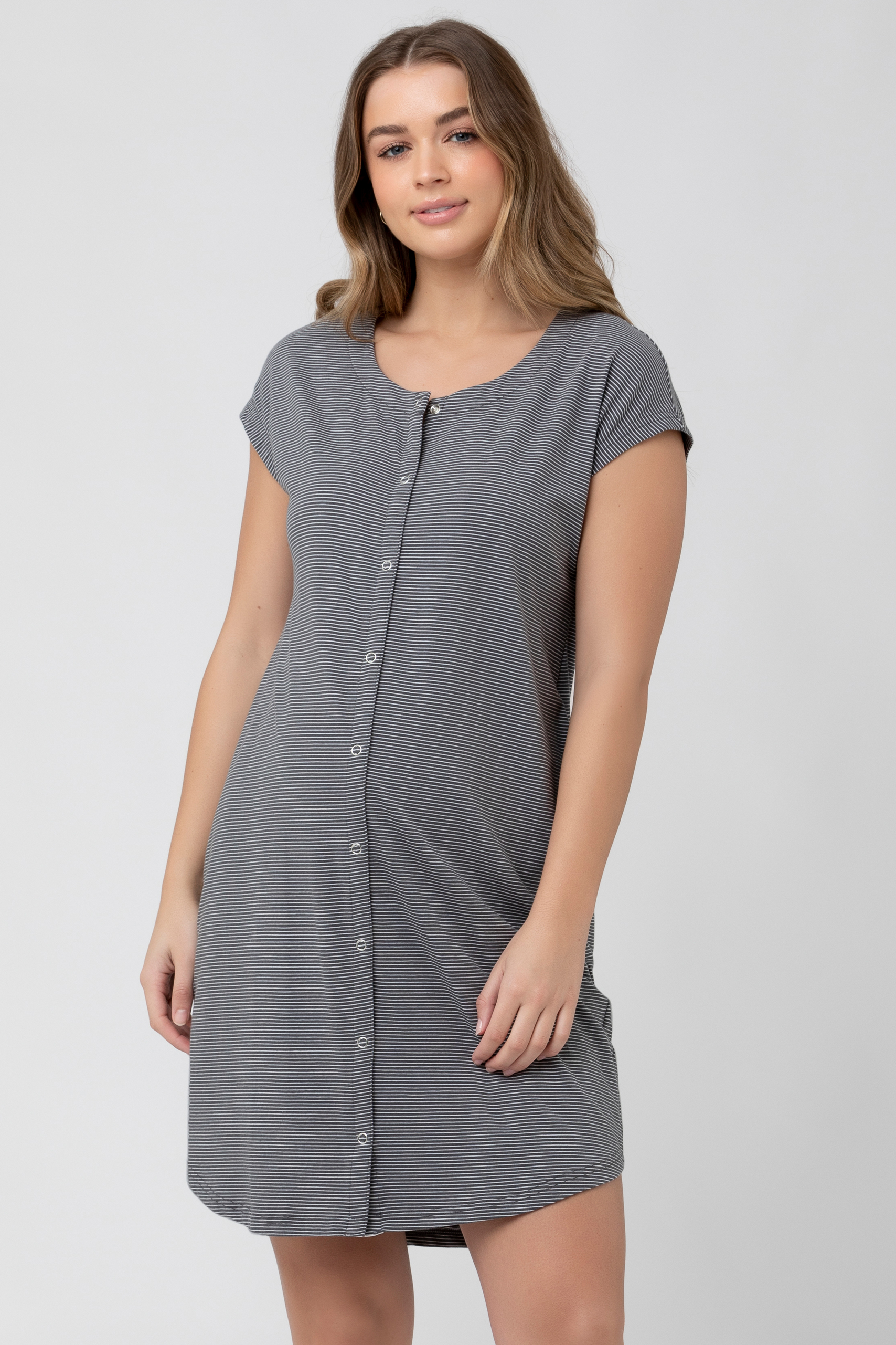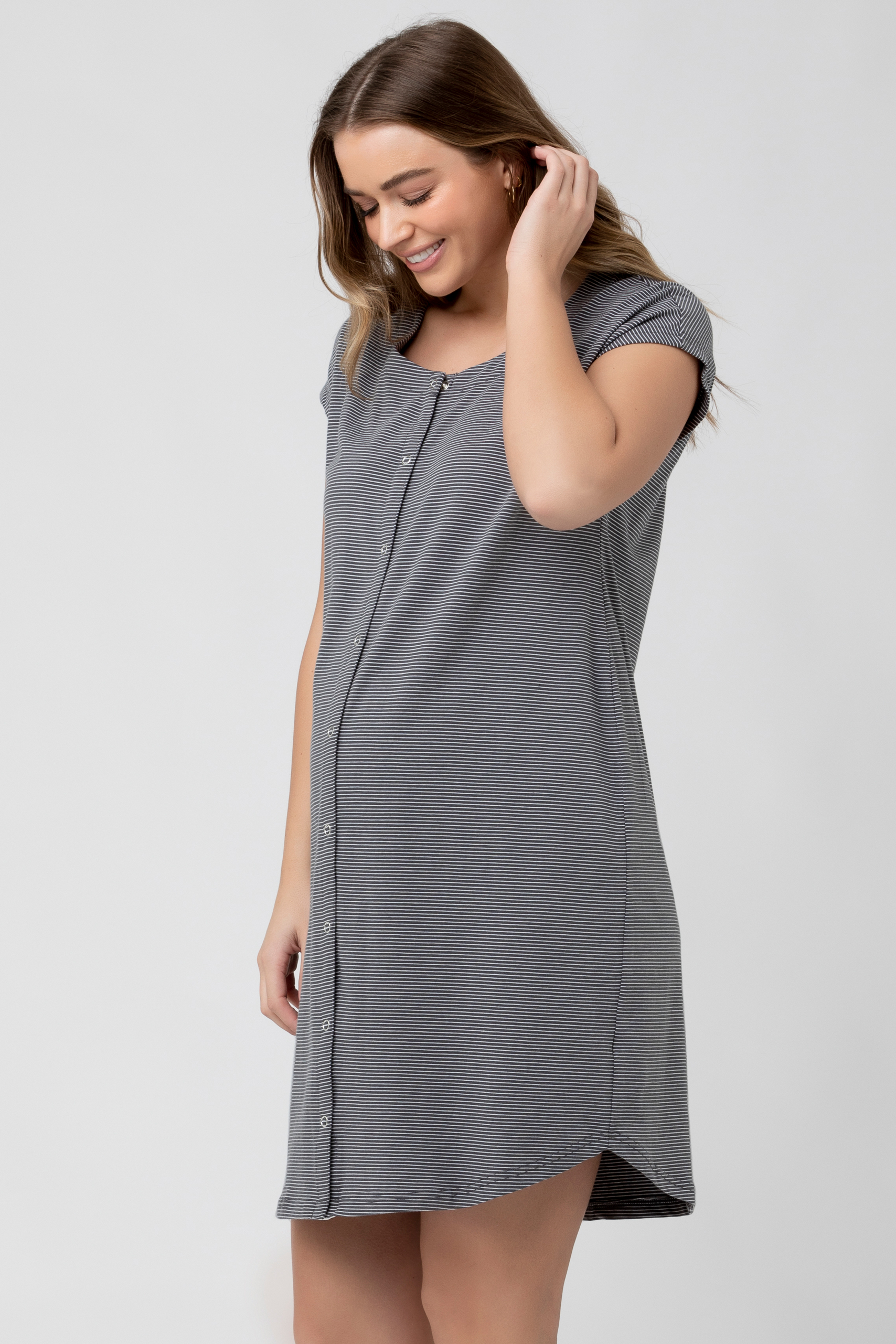 Organic Umstands- und Stillnachthemd aus weicher Bio-Baumwolle mit kurzen Ärmeln und durchgehender Knopfleiste. Nach der Geburt erhältst du über diese einen schnellen und einfachen Stillzugang und kannst so jederzeit nachts problemlos stillen. Farbe: grau/weiß