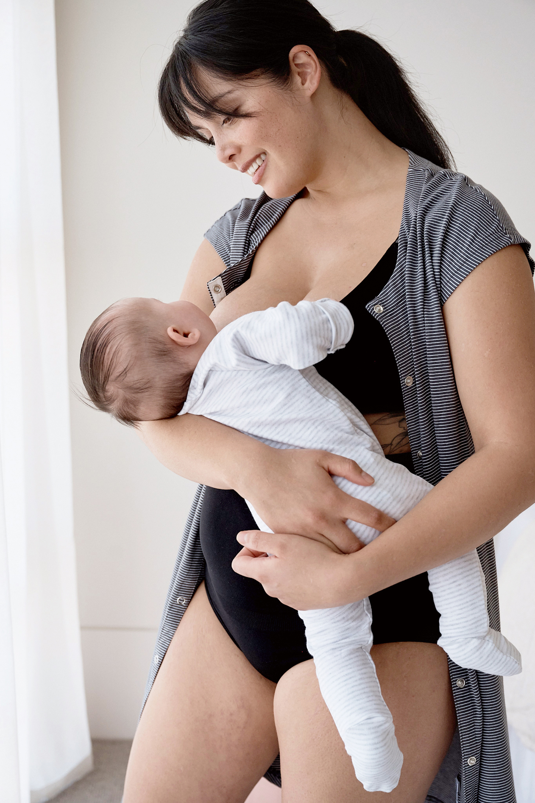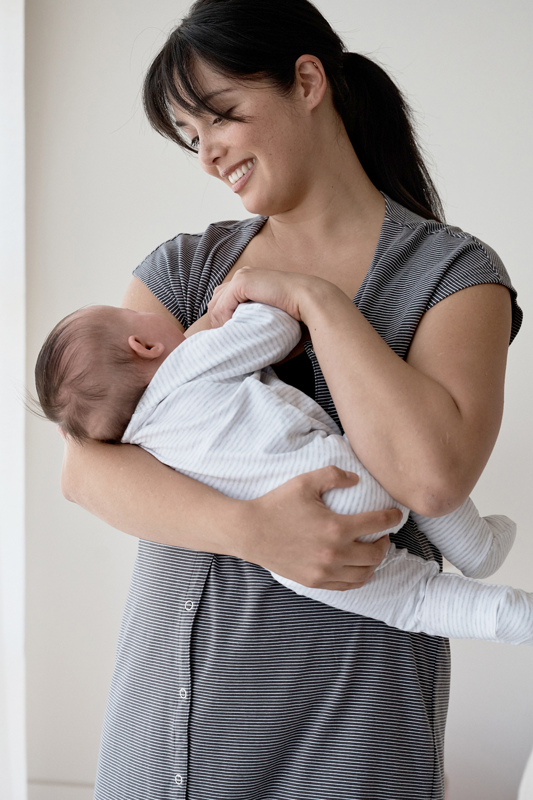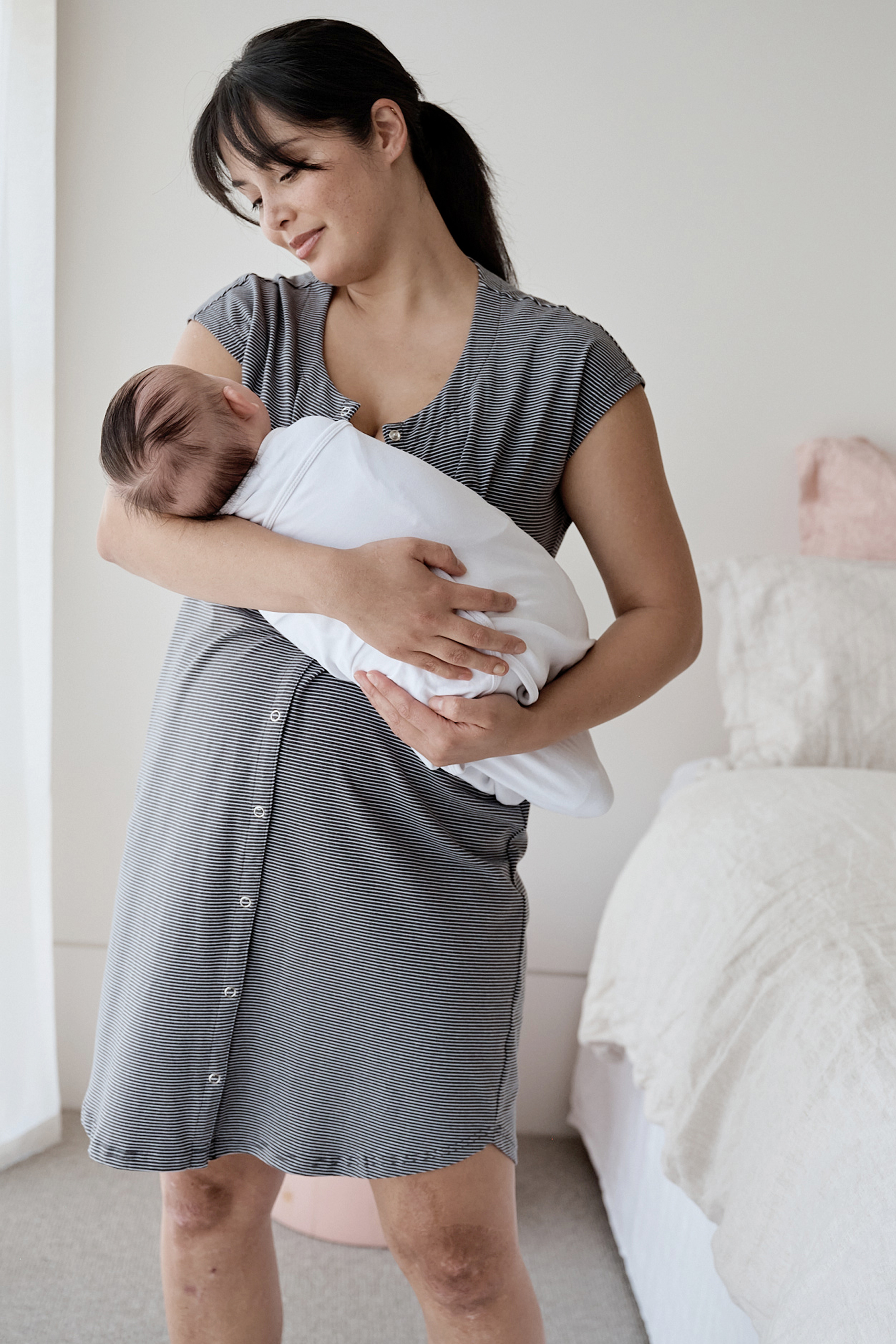 Organic Umstands- und Stillnachthemd aus weicher Bio-Baumwolle mit kurzen Ärmeln und durchgehender Knopfleiste. Nach der Geburt erhältst du über diese einen schnellen und einfachen Stillzugang und kannst so jederzeit nachts problemlos stillen. Farbe: grau/weiß