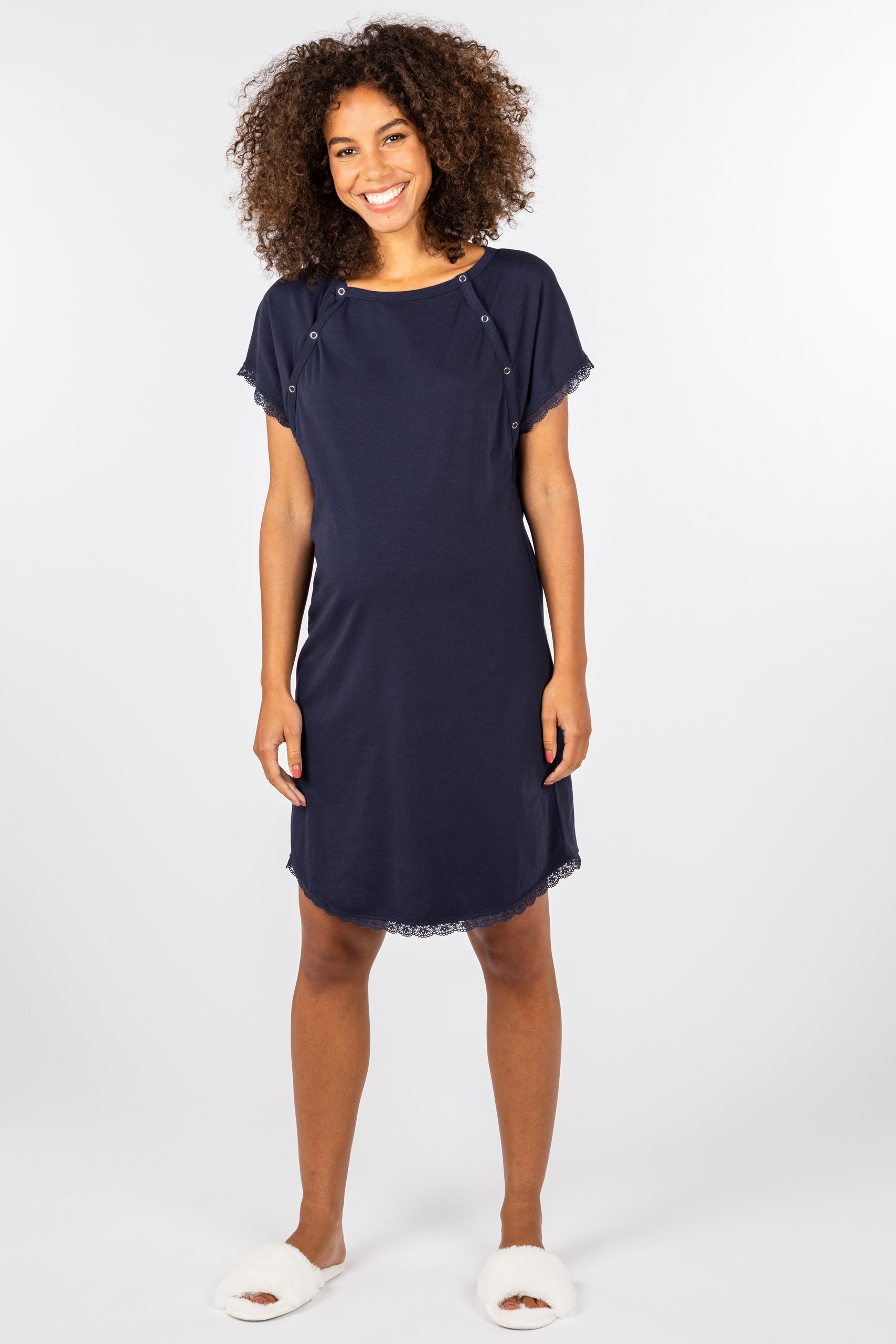 Geburtskleid und Stillnachthemd mit Baby Bonding Funktion aus Bio-Baumwolle. Die praktischen Druckknöpfe in der hinteren Mitte vom Rücken ermöglichen einen einfachen Zugang im Krankenhaus ohne umständliches Hochkrempeln oder Ausziehen, Bsp. beim Legen einer PDA. Die beiden seitlichen Knopfleisten vorne am Ausschnitt ermöglichen einen schnellen Stillzugang sofort nach der Geburt, sowie direkten Hautkontakt mit deinem Baby. Einfach beide Seiten öffnen, dein Baby auf die Brust legen und das erste magische Kennenlernen genießen. Auch nach der Geburt kannst du das praktische Geburtskleid einfach als Stillnachthemd nutzen, einfach ein idealer Begleiter für alle New Moms. Farbe: navy