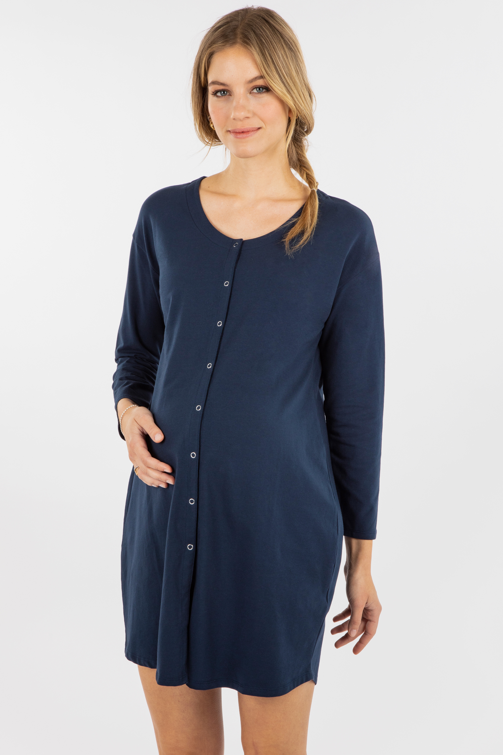 Umstands- und Stillnachthemd aus Bio-Baumwolle mit langen Ärmeln und durchgehender Knopfleise. Das elastische Material bietet deinem wachsendem Babybauch genügend Platz zu jeder Phase deiner Schwangerschaft. Dank der durchgehender Knopfleiste mit praktischen Druckknöpfen, kannst du später wunderbar darin stillen. Farbe: navy