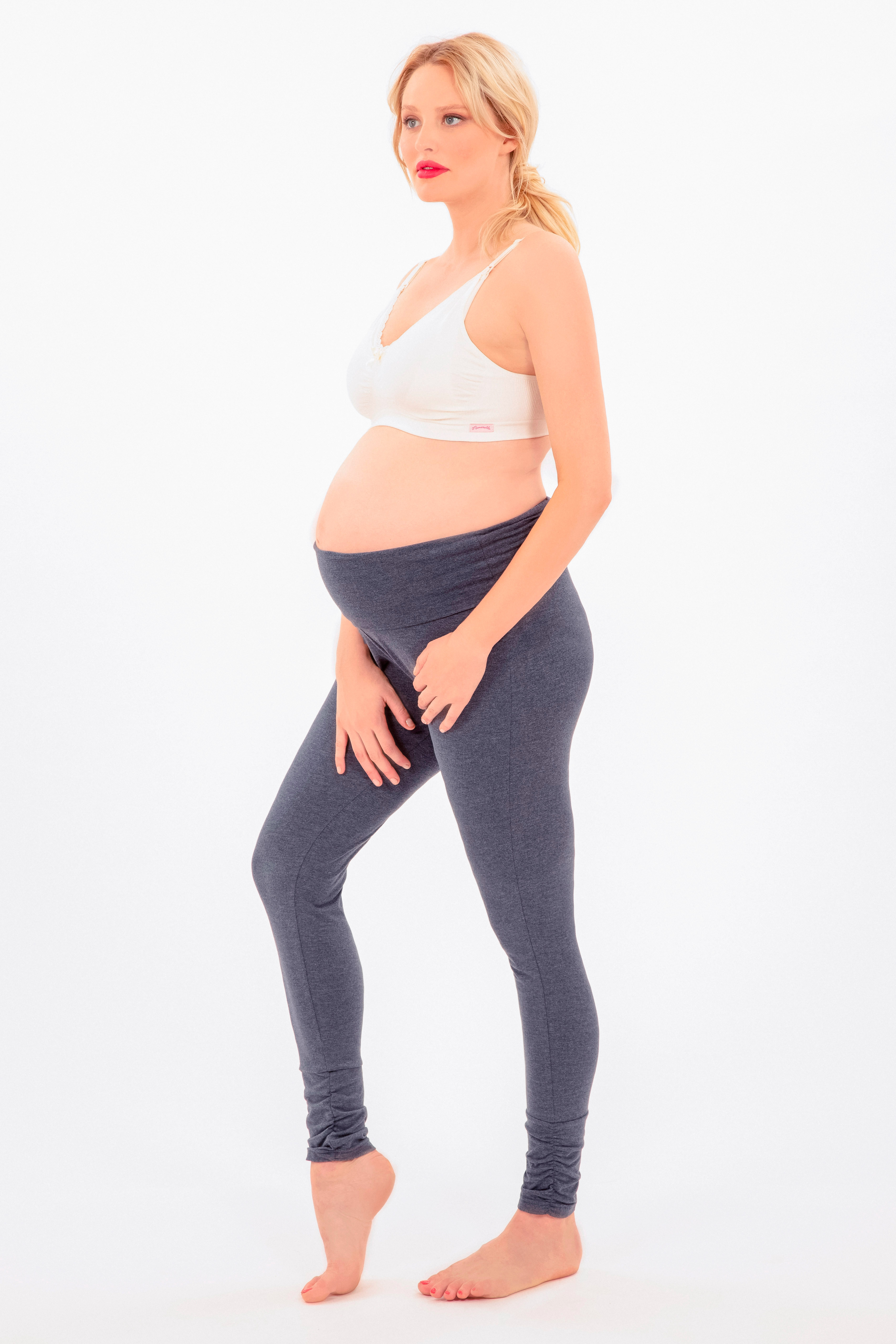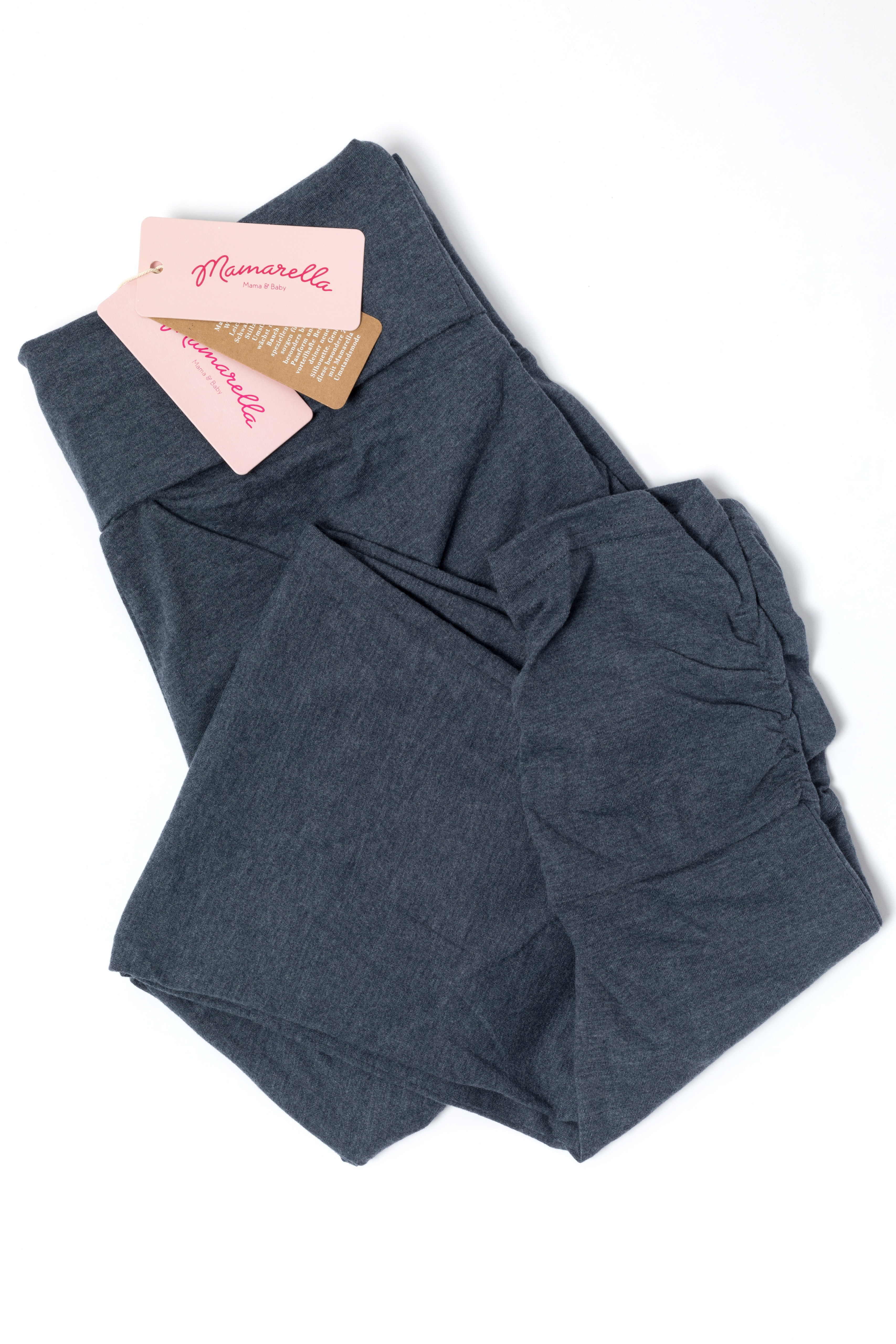 Lounge- und Pyjama Umstandsleggings mit weichem Bauchband und Raffungsdetails am Beinende. Der Bund kann sowohl über als auch unter dem Bauch getragen werden. Farbe: blau melange