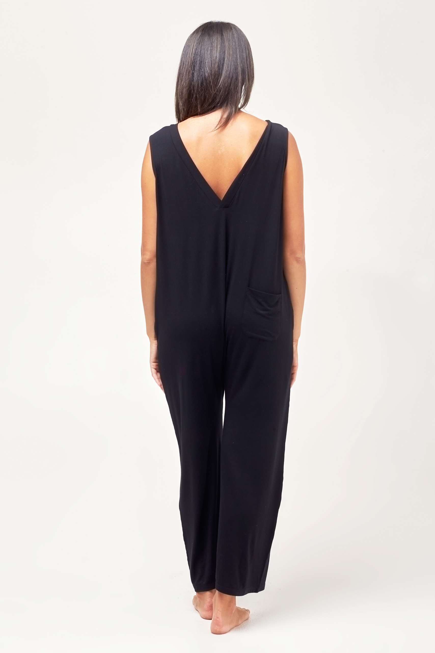 Ultrabequemer Umstands-Jumpsuit mit Seitentaschen aus Bambus-Viskose für die Schwangerschaft und Stillzeit. Der weite Schnitt und das weiche, dehnbare Material stellen sicher, dass dein Babybauch bequem darin wachsen kann. Nach der Geburt kannst du dein Baby über integrierte Stillöffnungen ganz unkompliziert stillen. Farbe: schwarz