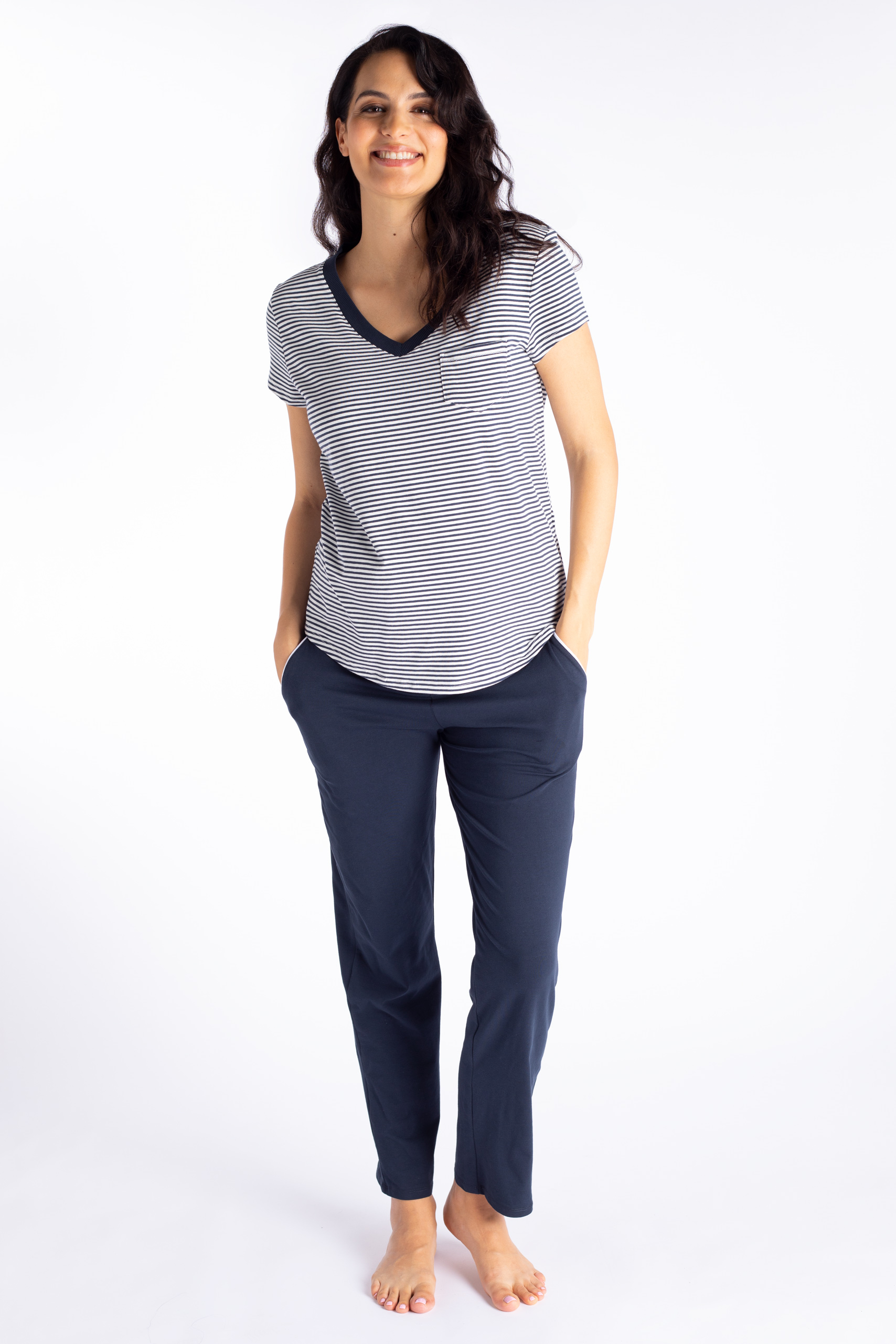 Pyjama Umstandshose aus GOTS zertifizierter, hautfreundlicher Bio-Baumwolle aus unserer Mix & Match Casual Nightwear Kollektion. Die locker geschnittene Hose hat zwei Seitentaschen und ein breites, dehnbares Bauchband, der deinem Bauch genügend Platz zum Wachsen lässt und ihm sanften Support gibt. Auch nach der Geburt wirst du die ultrabequemen Hose noch eine ganze Weile liebend gern weitertragen, egal ob nachts zum Schlafen oder beim Relaxen am Tag. Farbe: navy