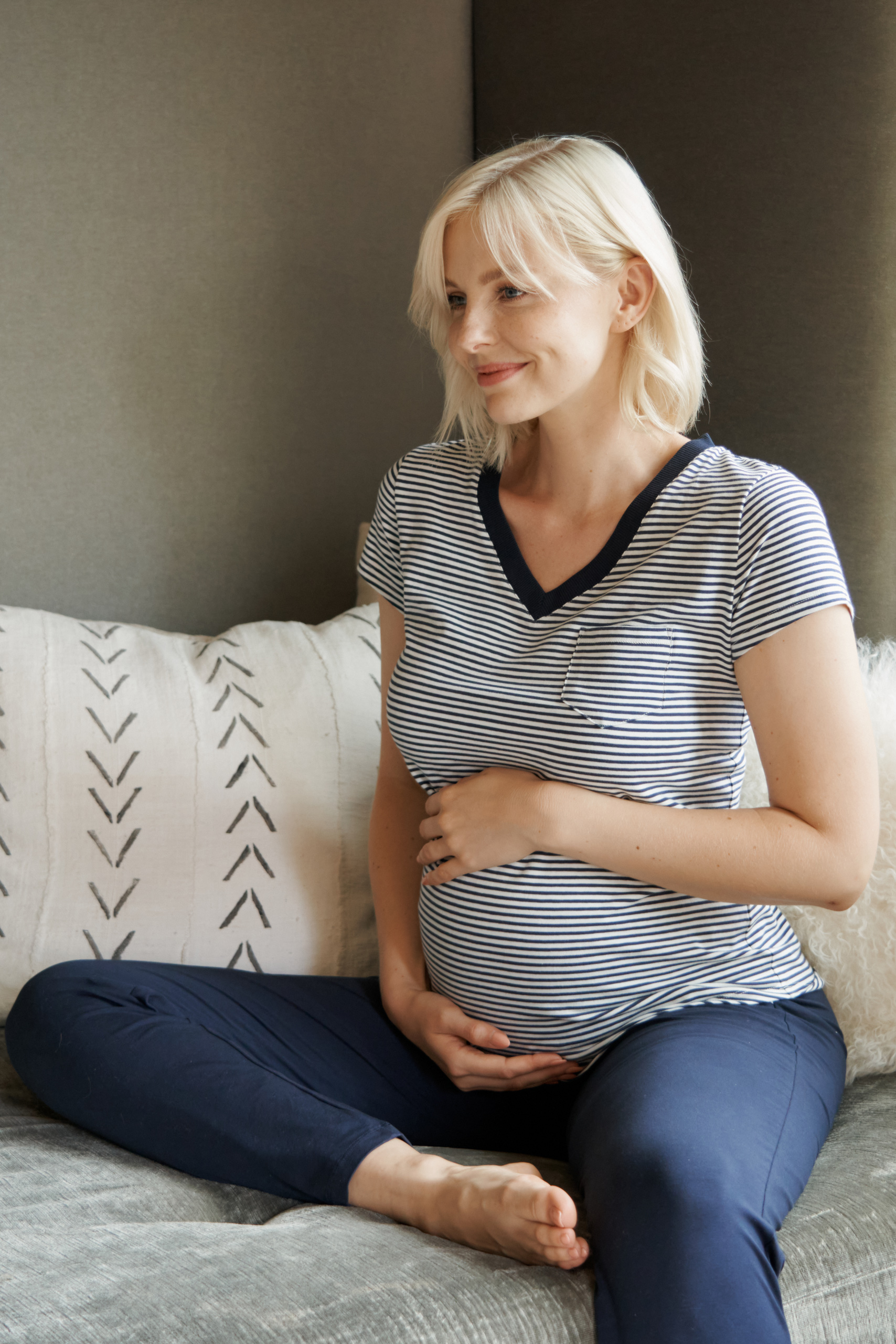 Passform-Info: Unser blondes Studio-Model Ida ist 176cm groß und auf den Fotos in der 37. SSW. Sie trägt die Hose in Größe S.