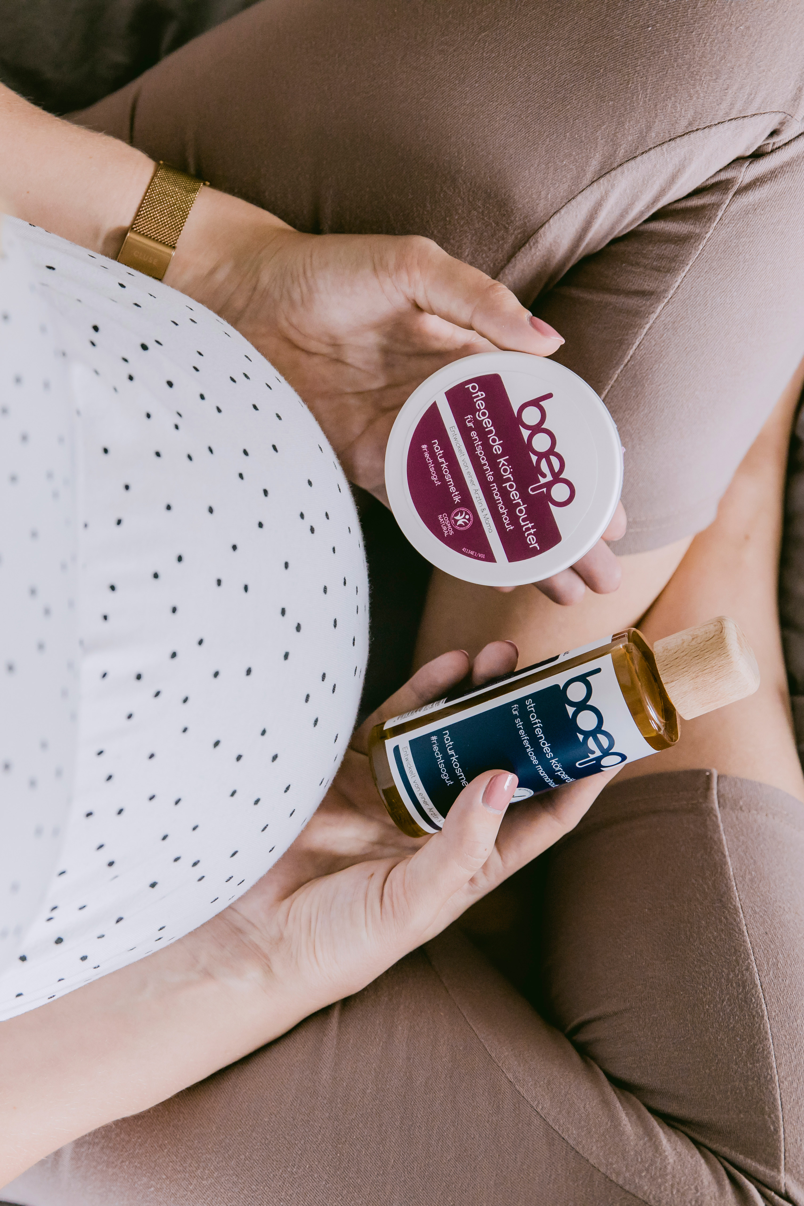 Straffendes Körperöl, speziell für beanspruchte Haut während und nach der Schwangerschaft. Ein klinisch-dermatologischer Anwendungstest bestätigt, dass das natürliche Körperöl die Elastizität der Haut verbessert und bei regelmäßiger Anwendung für straffere und glattere Haut sorgt. Natürliche Öle und Algenextrakte spenden viel Feuchtigkeit und pflegen deine Haut optimal. Das Körperöl pflegt mit Olivenöl aus kontrolliert biologischem Anbau und unterstützt die Spannkraft Deiner Haut, so dass Dehnungsstreifen während der Schwangerschaft bestmöglich vorgebeugt werden kann. Das zart duftende Öl wird in einer recyclebaren Glasflasche mit besonderem Holzdeckel verschickt. Inhalt: 125ml