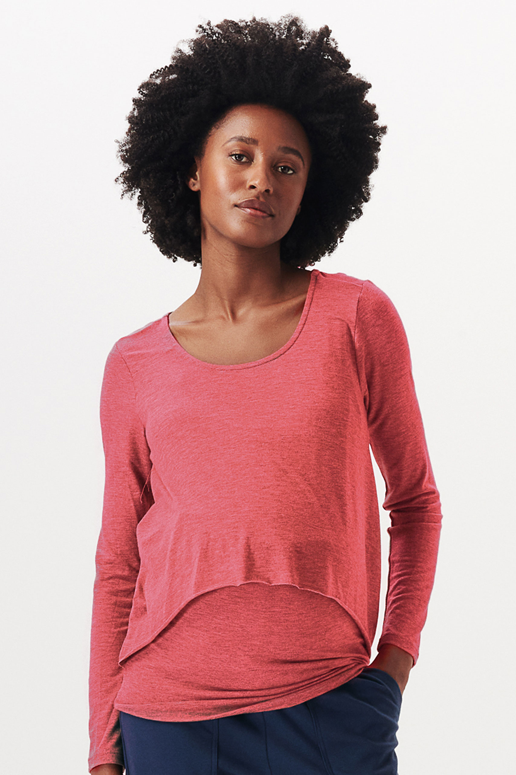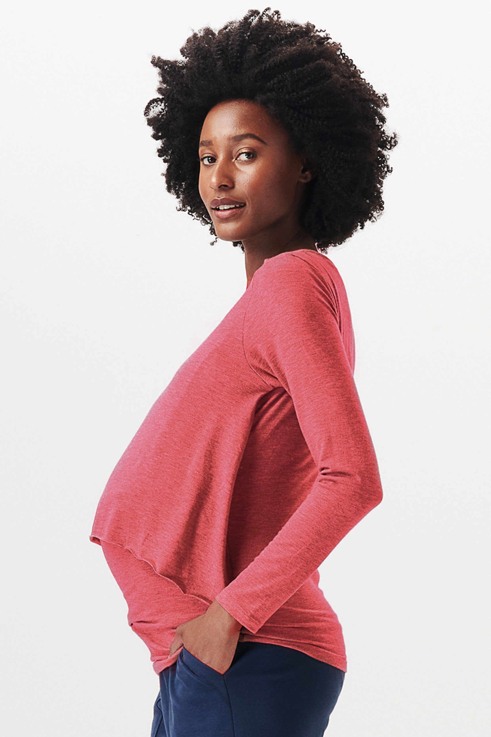 Eco Double Layer Umstands- und Stillshirt aus schönem Melange-Garn aus recyceltem Polyester. Das Shirt eignet sich perfekt für deine casual Looks während der Schwangerschaft und Stillzeit. Nach der Geburt kannst du dein Baby schnell und einfach stillen, indem du die obere Stofflage nach oben schiebst. Farbe: rot