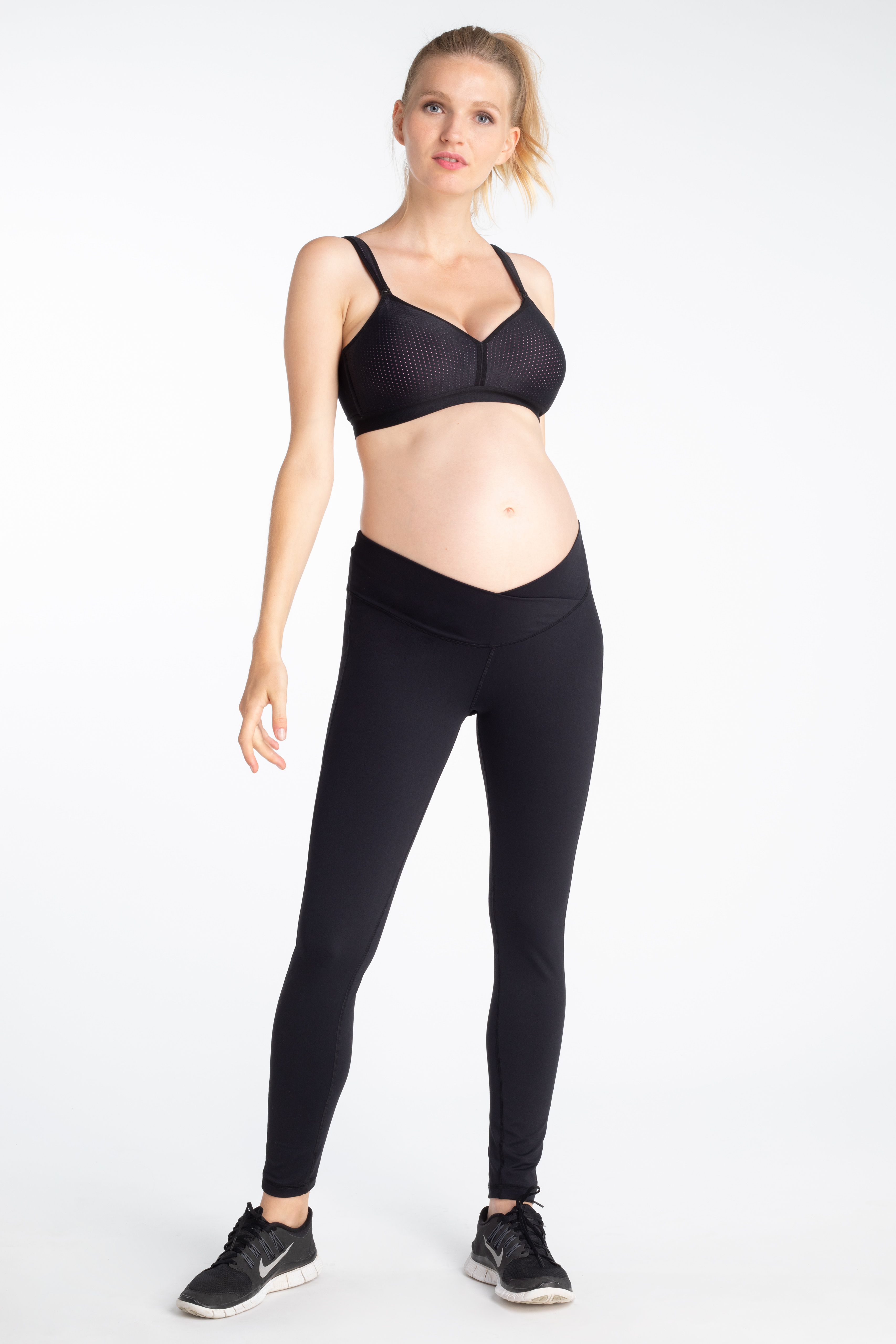 Unser Model Nele ist 179cm groß und auf den Fotos in der 33. SSW. Sie trägt die Leggings in Gr. S/M und dazu den Sport Mesh Umstands und Still BH >> in Gr. S.