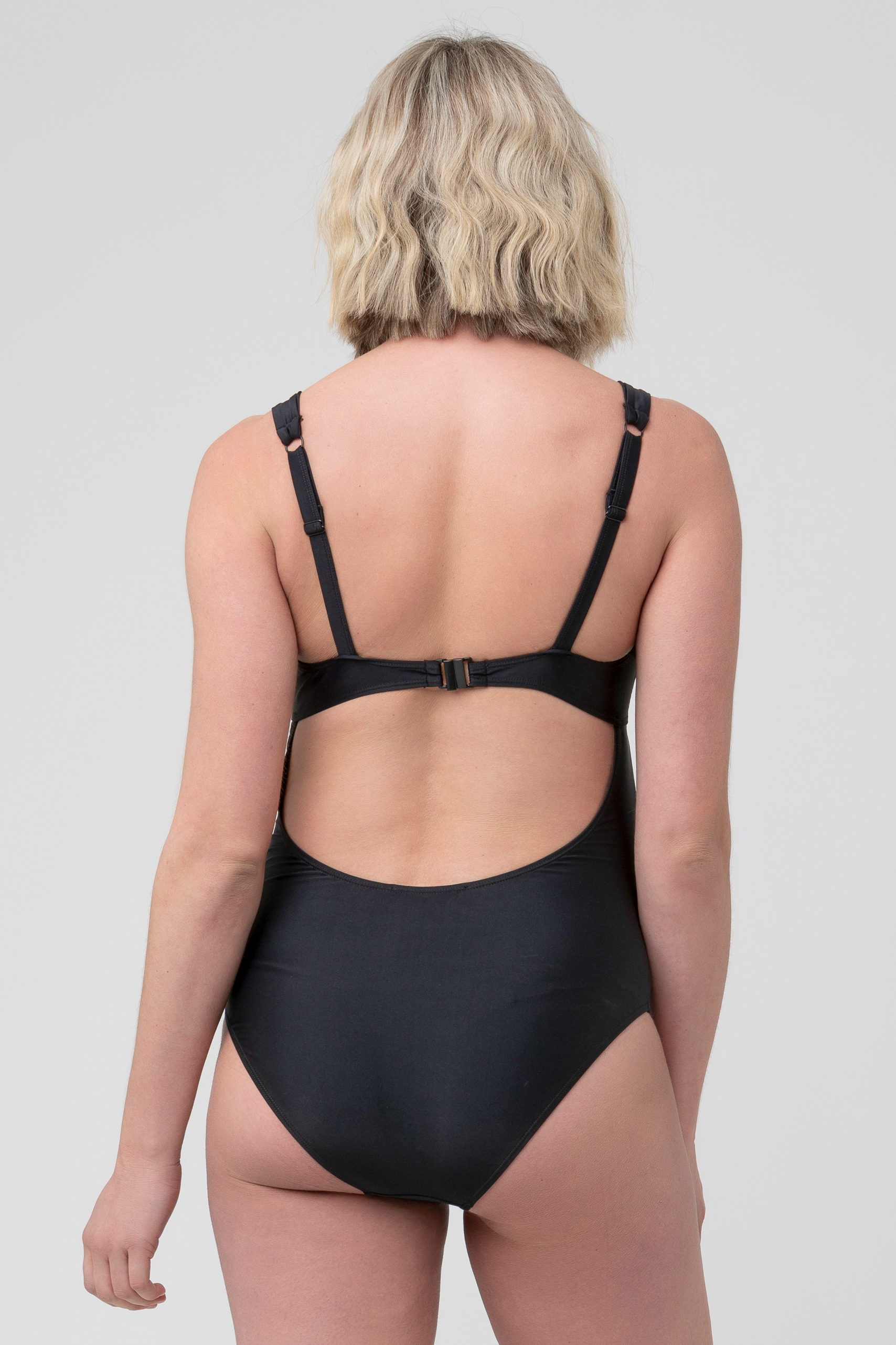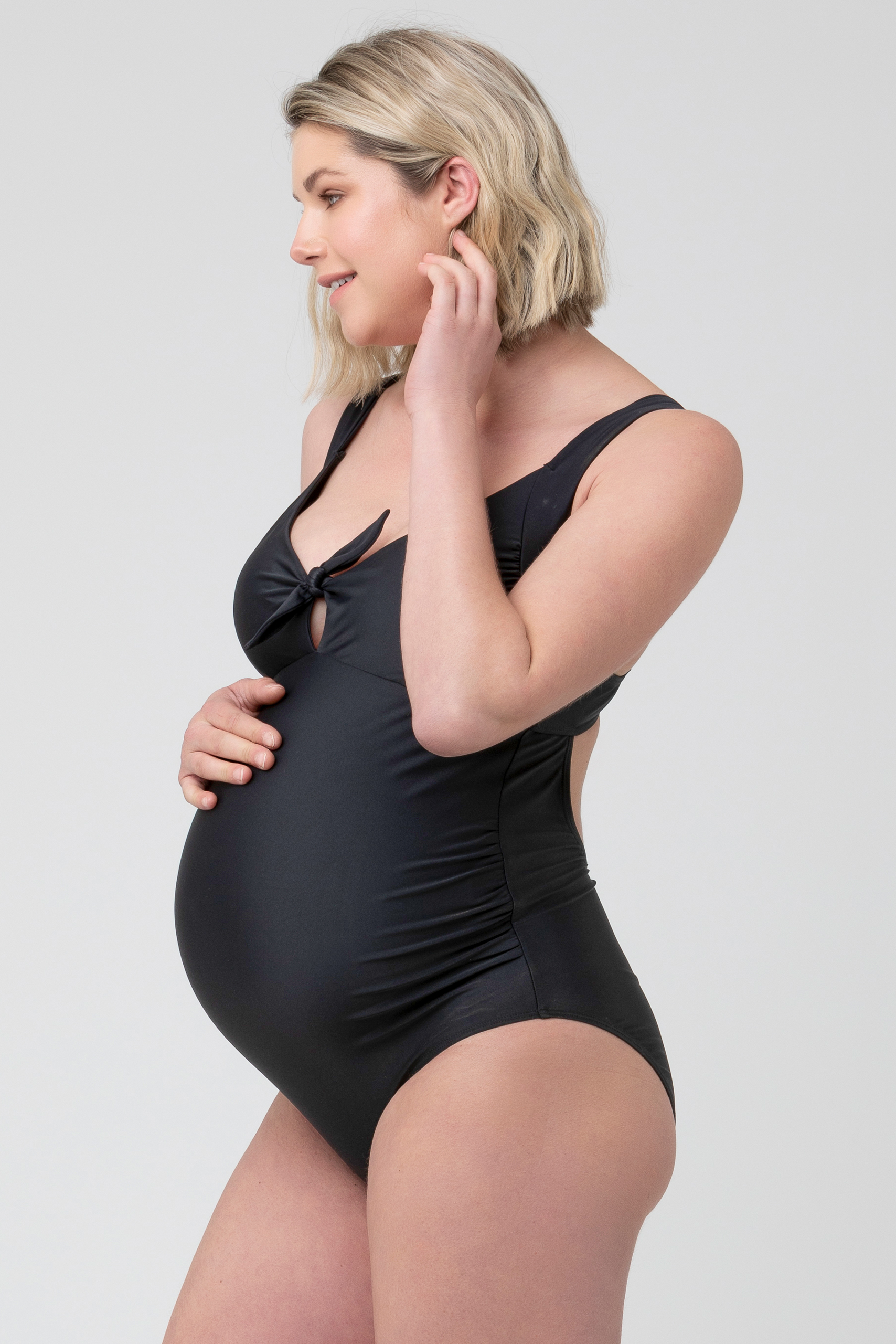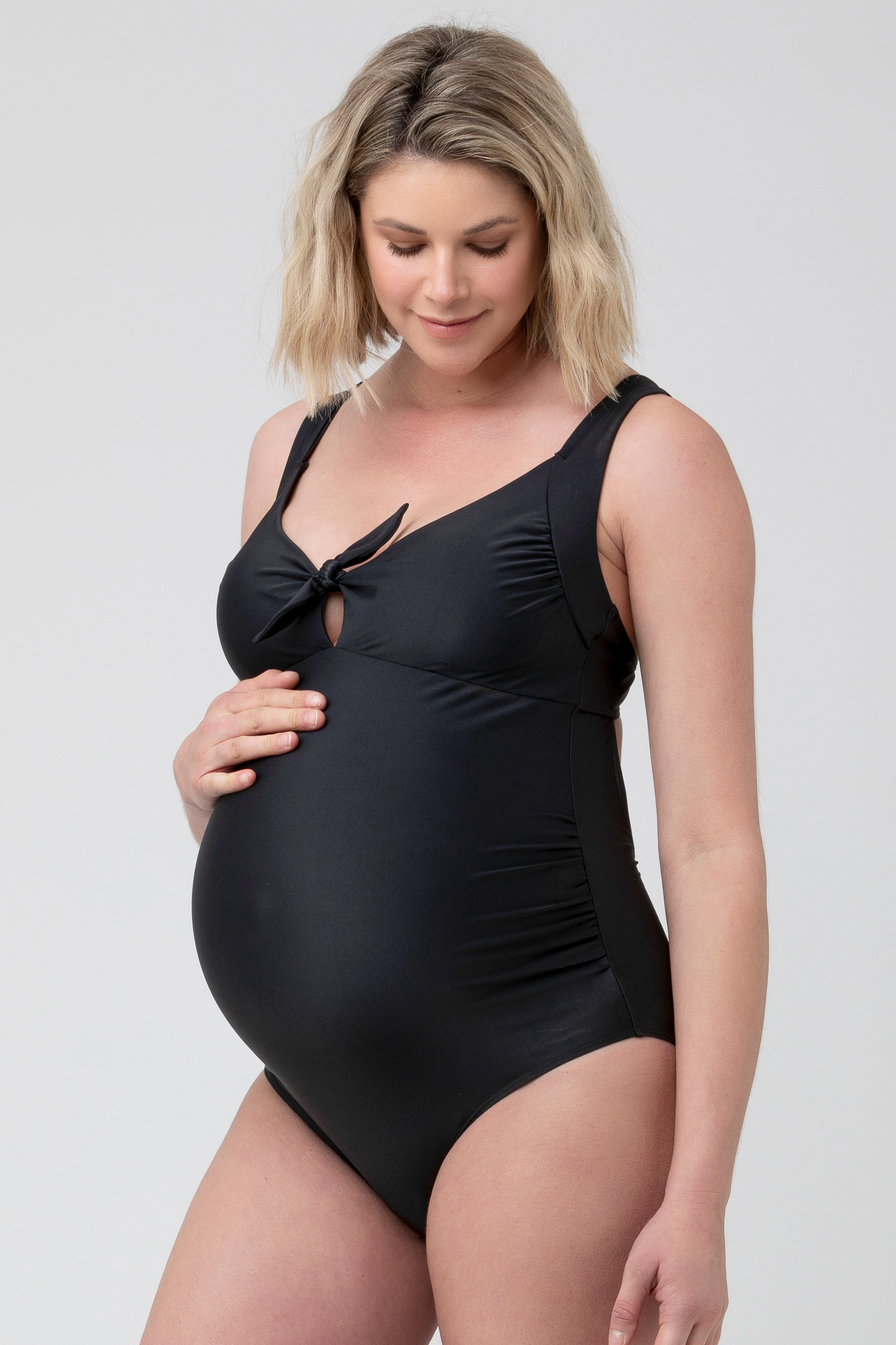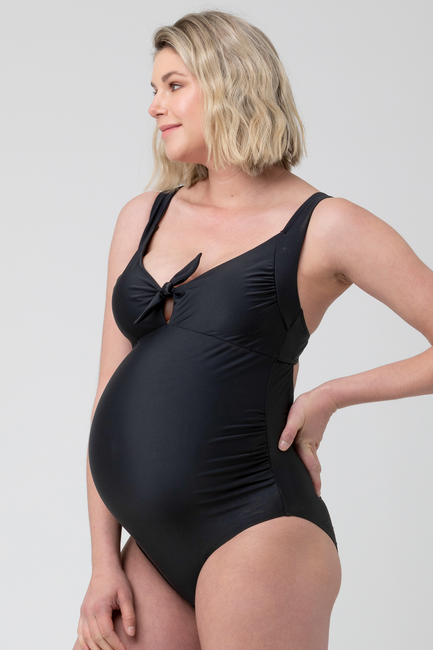 Umstandsbadeanzug mit Bindedetail, herausnehmbaren Brustpolstern und verstellbare Träger. Durch die Raffung an der Taille passt sich der Badeanzug perfekt an deine Silhouette an. Der raffinierte Rückenausschnitt ist tief ausgeschnitten und bietet gleichzeitig guten Halt für deine Oberweite. Farbe: schwarz