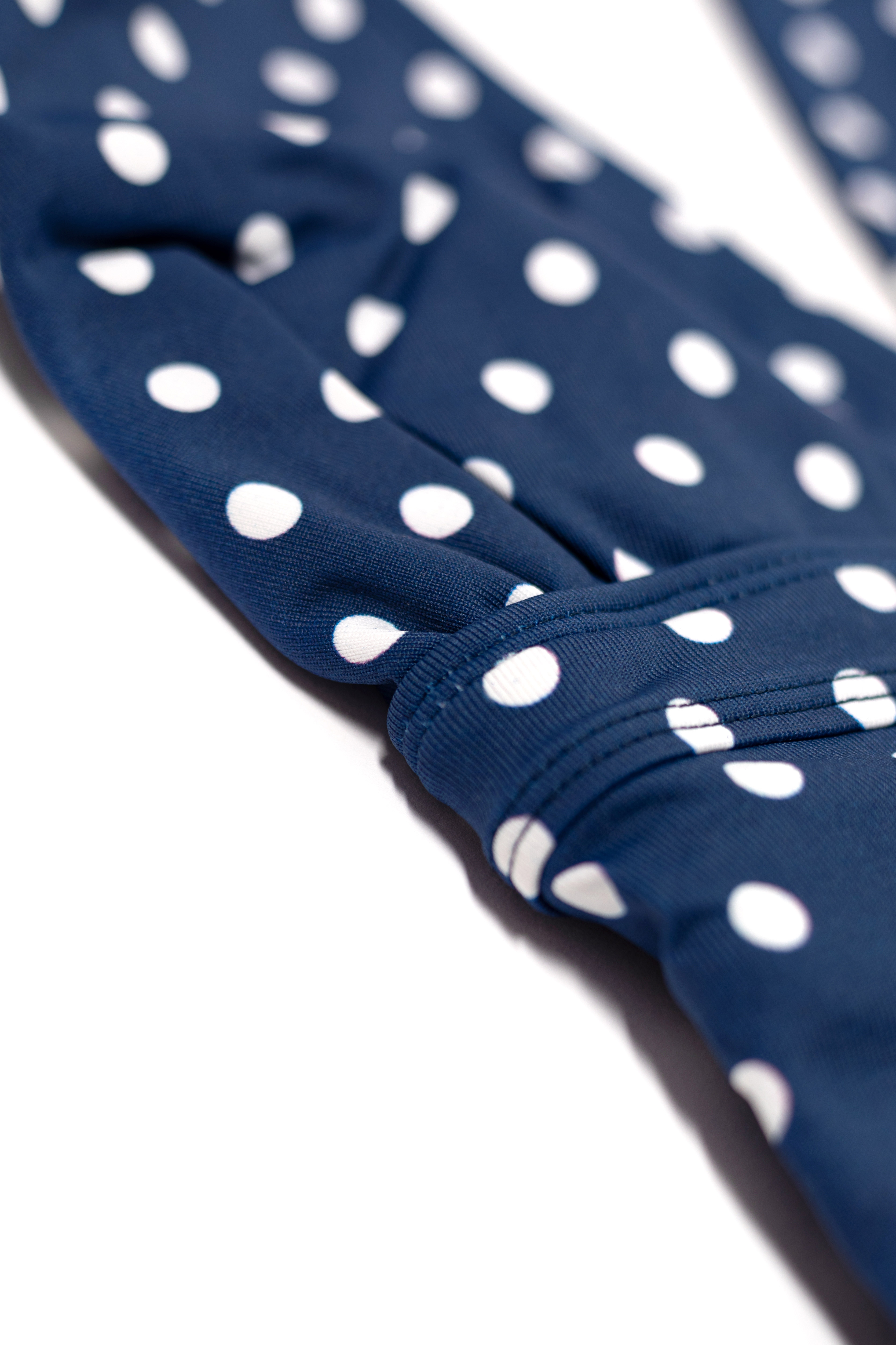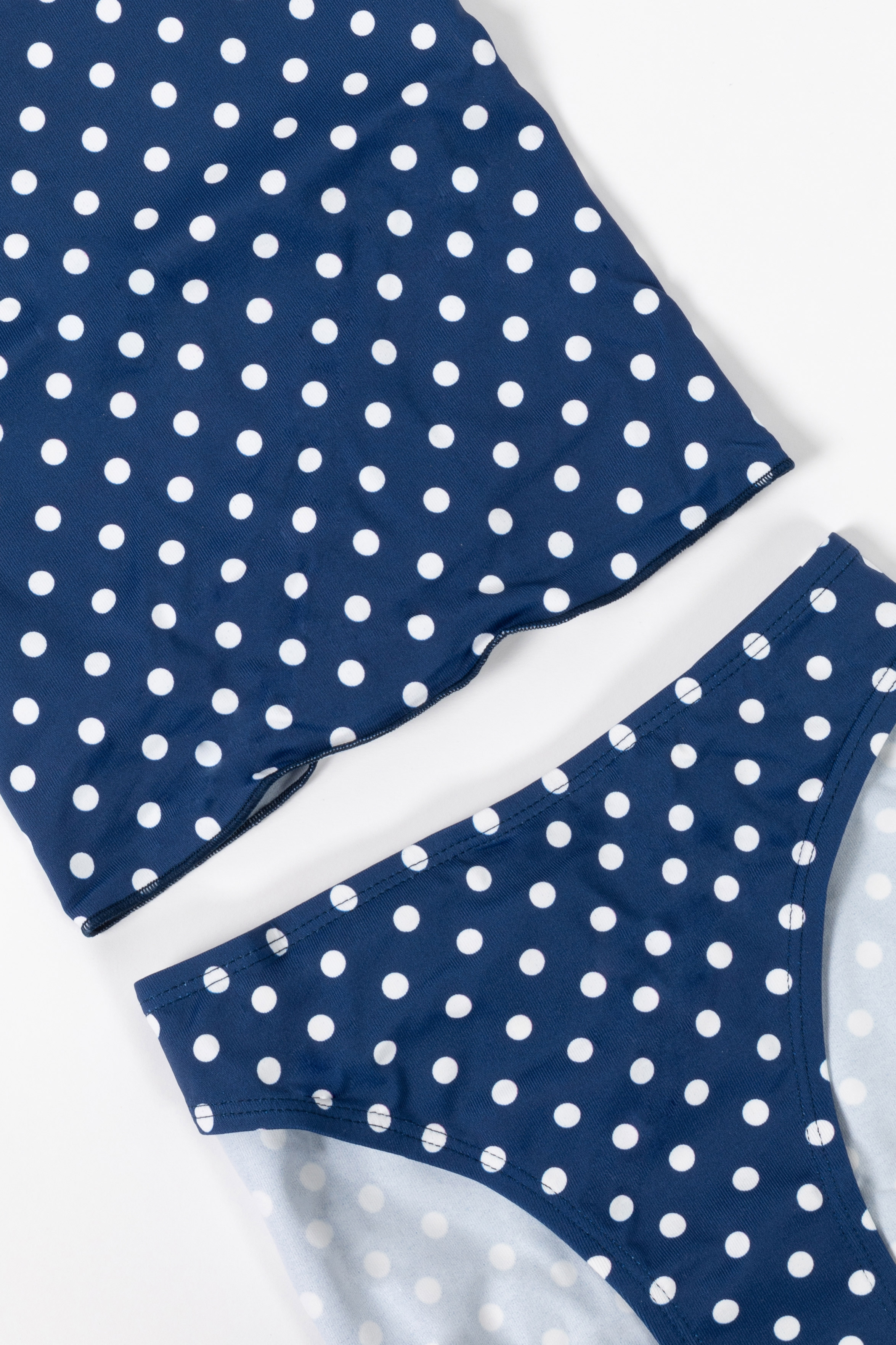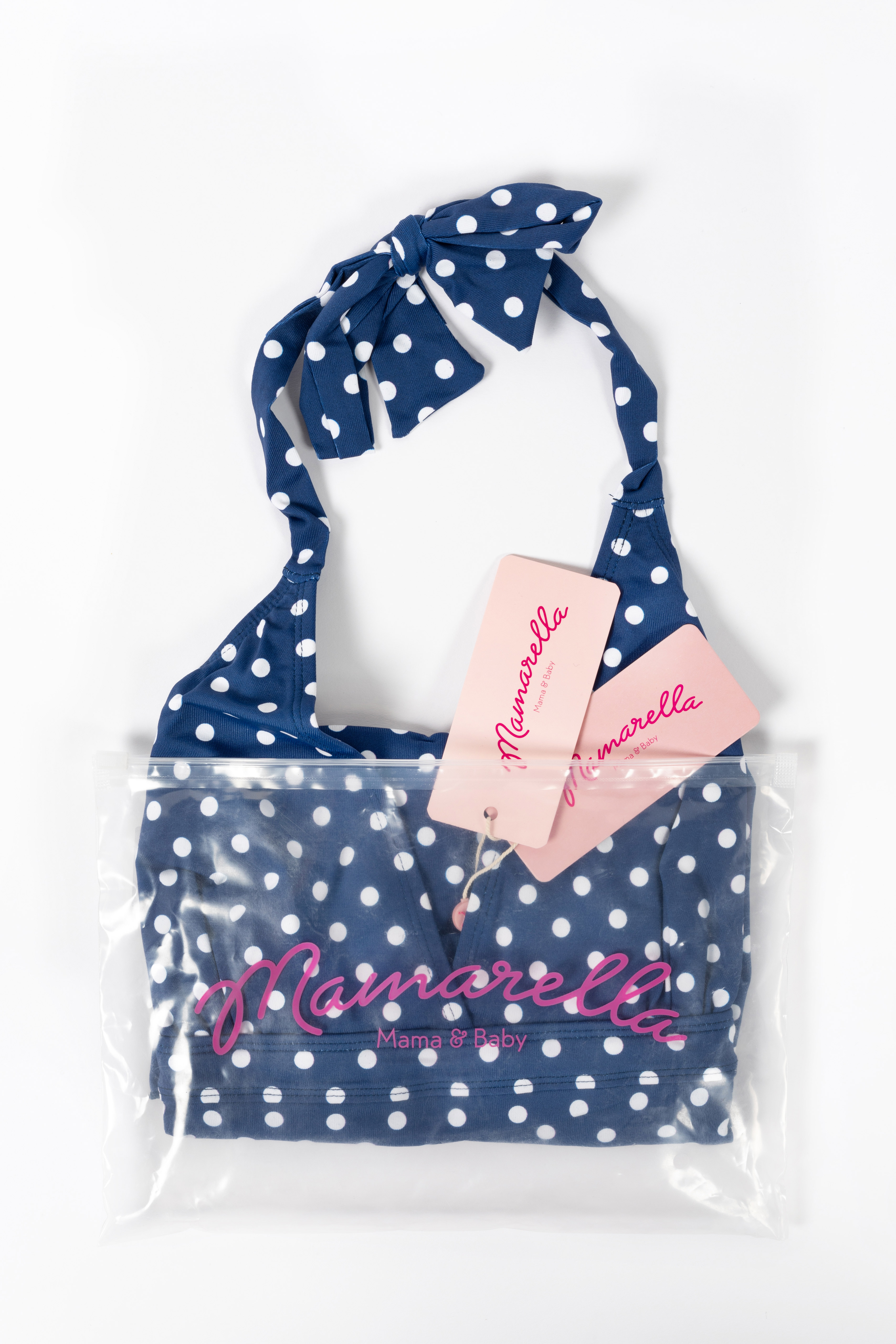Umstandstankini mit Polka-Dot-Print und Neckholdertop, das im Nacken geknotet wird. Der Zweiteiler besteht aus einem figurbetonenden Top mit abgenähter Empire Linie sowie einem bequemem Unterbauchhöschen. Farbe: blau/weiß