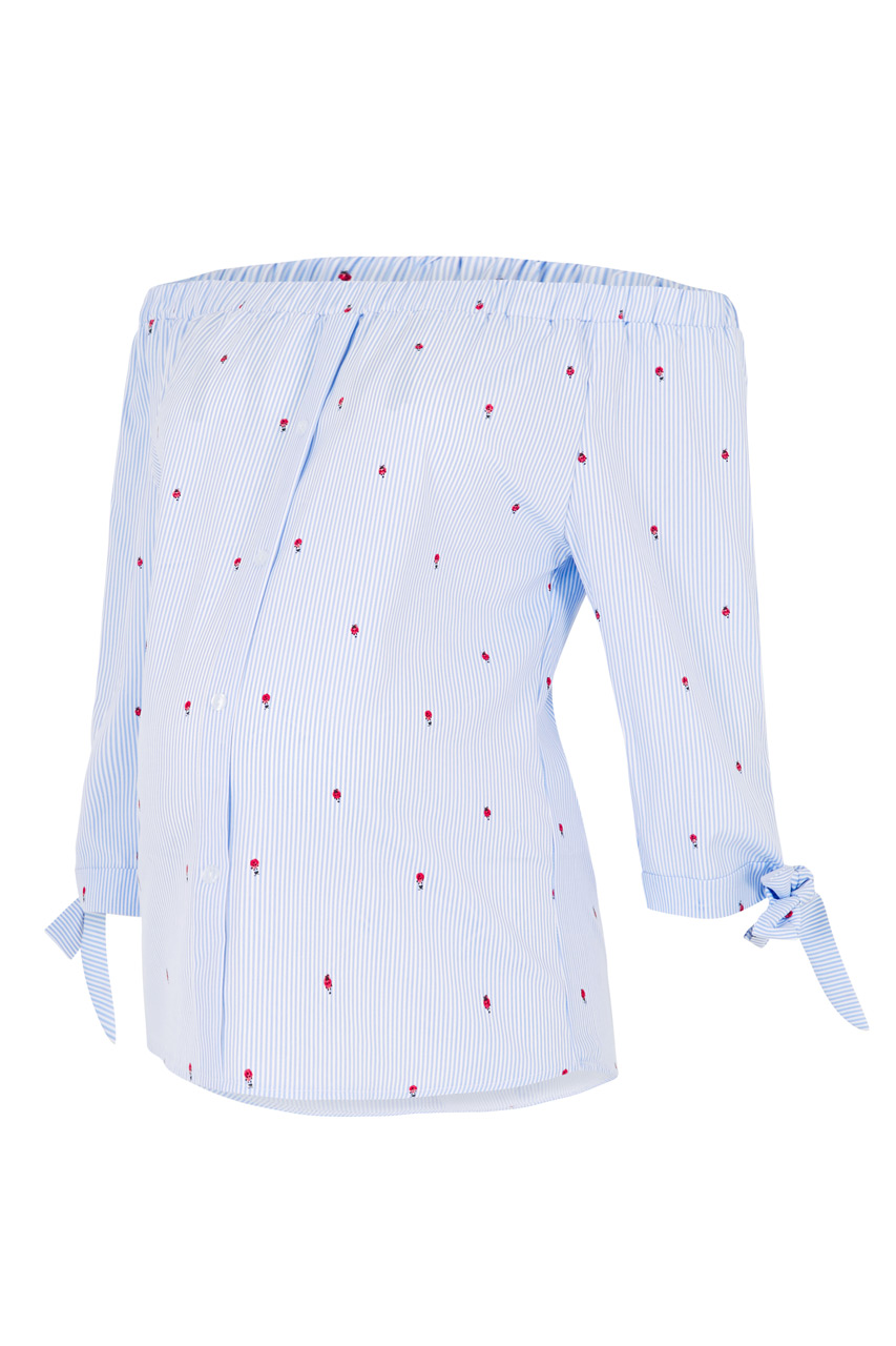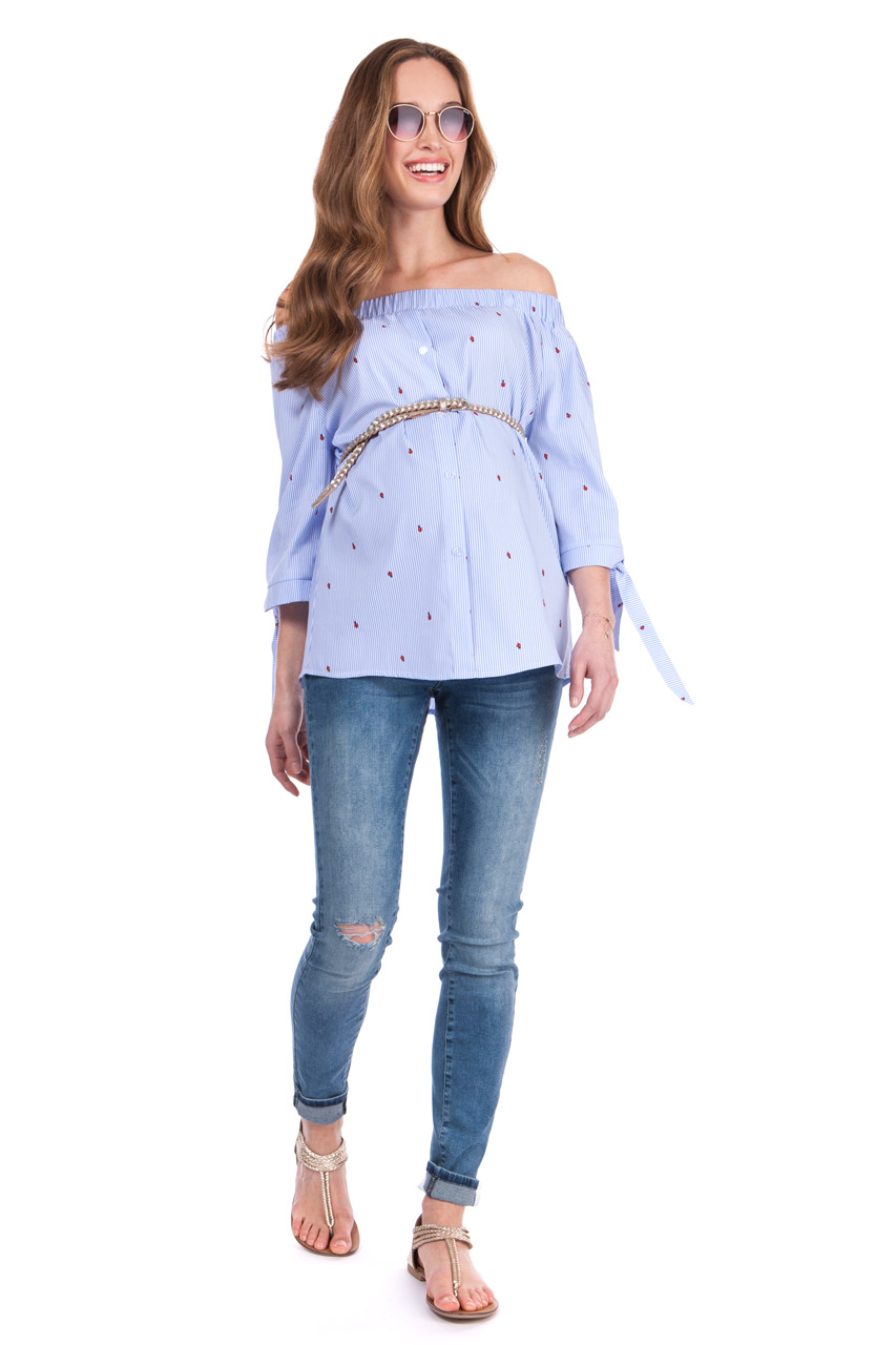 Off Shoulder Umstandsbluse mit abnehmbaren Trägern in blau-weißem Streifendesign mit Marienkäfern. Der Baumwoll-Stretch-Stoff und der elastische Ausschnitt sind besonders komfortabel. Der untere Teil lässt deinem Bauch genügend Platz zum Wachsen. Der Gürtel ist separat erhältlich. Farbe: blau/weiß