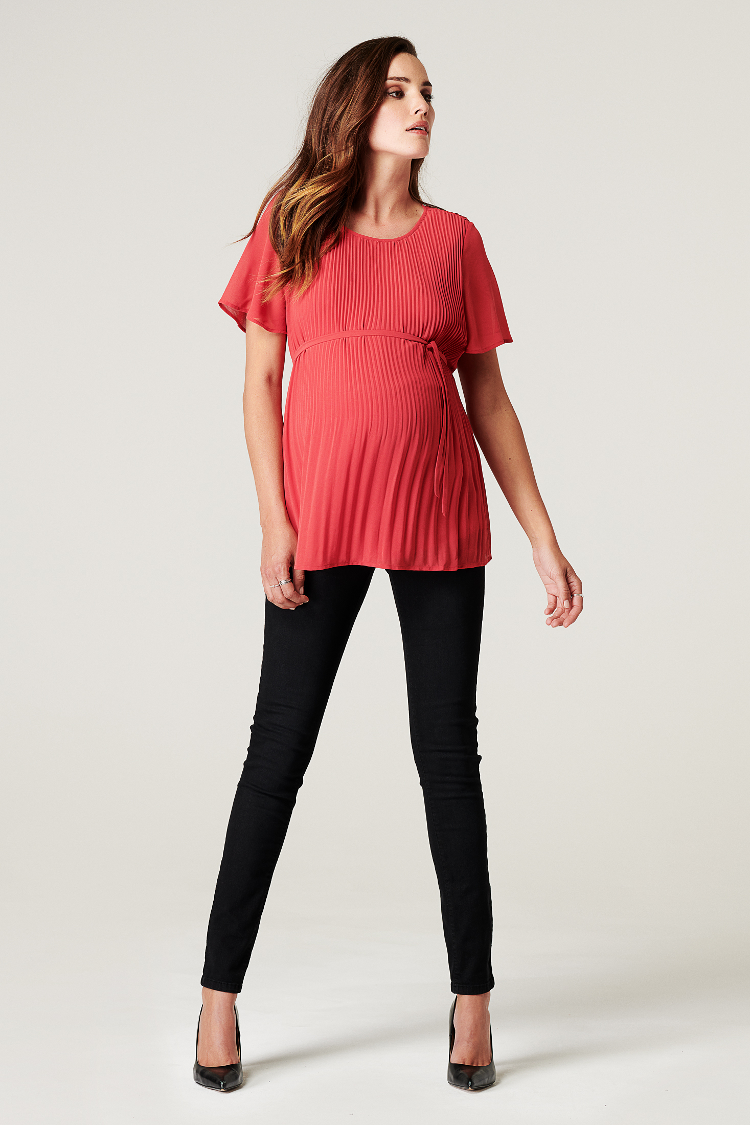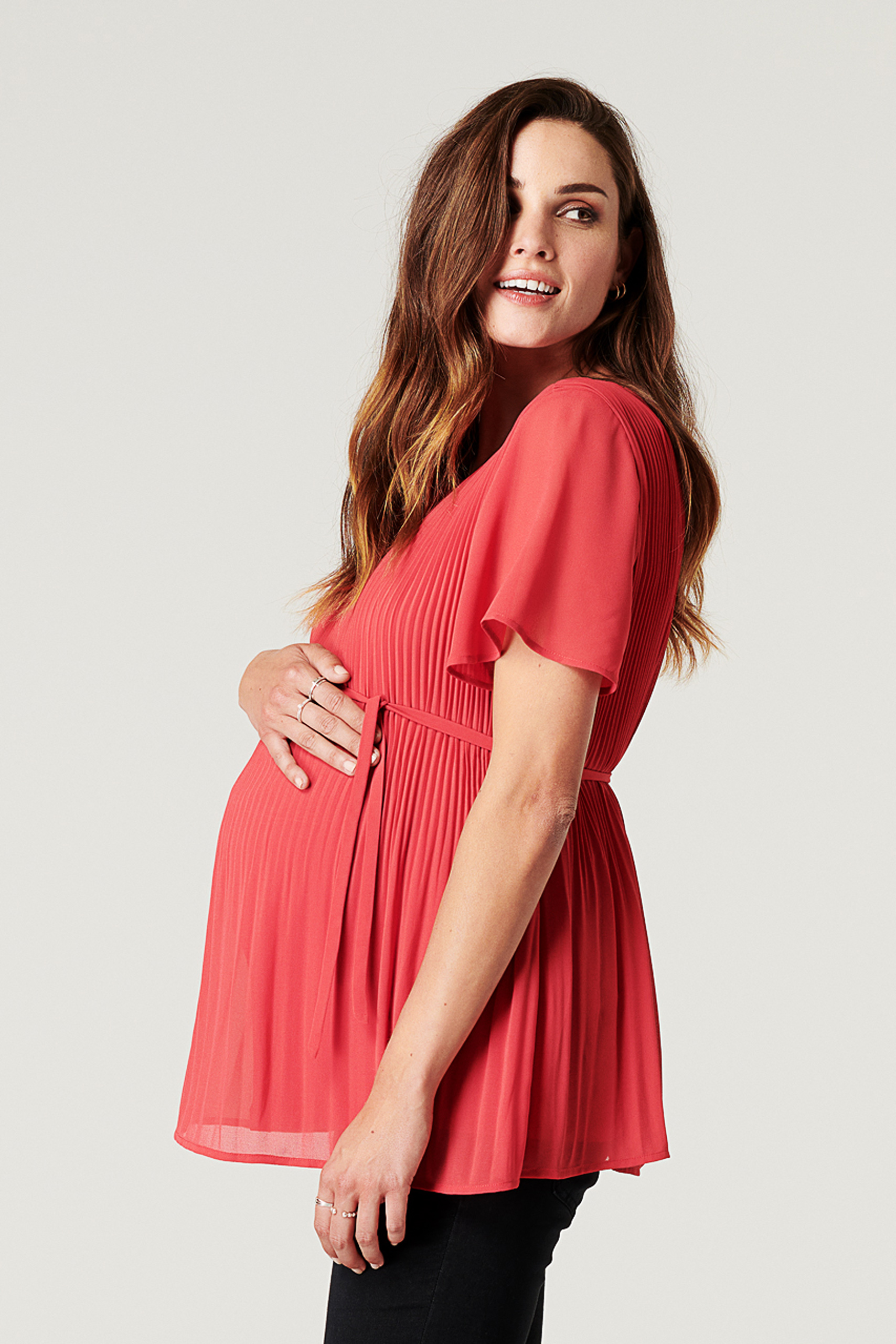 Umstandsbluse aus recyceltem Material mit kurzen Flügelärmeln und Plissees. Der besondere Schnitt der Bluse stellt sicher, dass dein Bauch in allen Schwangerschaftswochen genügend Platz darin findet. Eine Bindung unter der Brust schafft eine schöne Silhouette und betont deinen Babybauch. Farbe: rot
