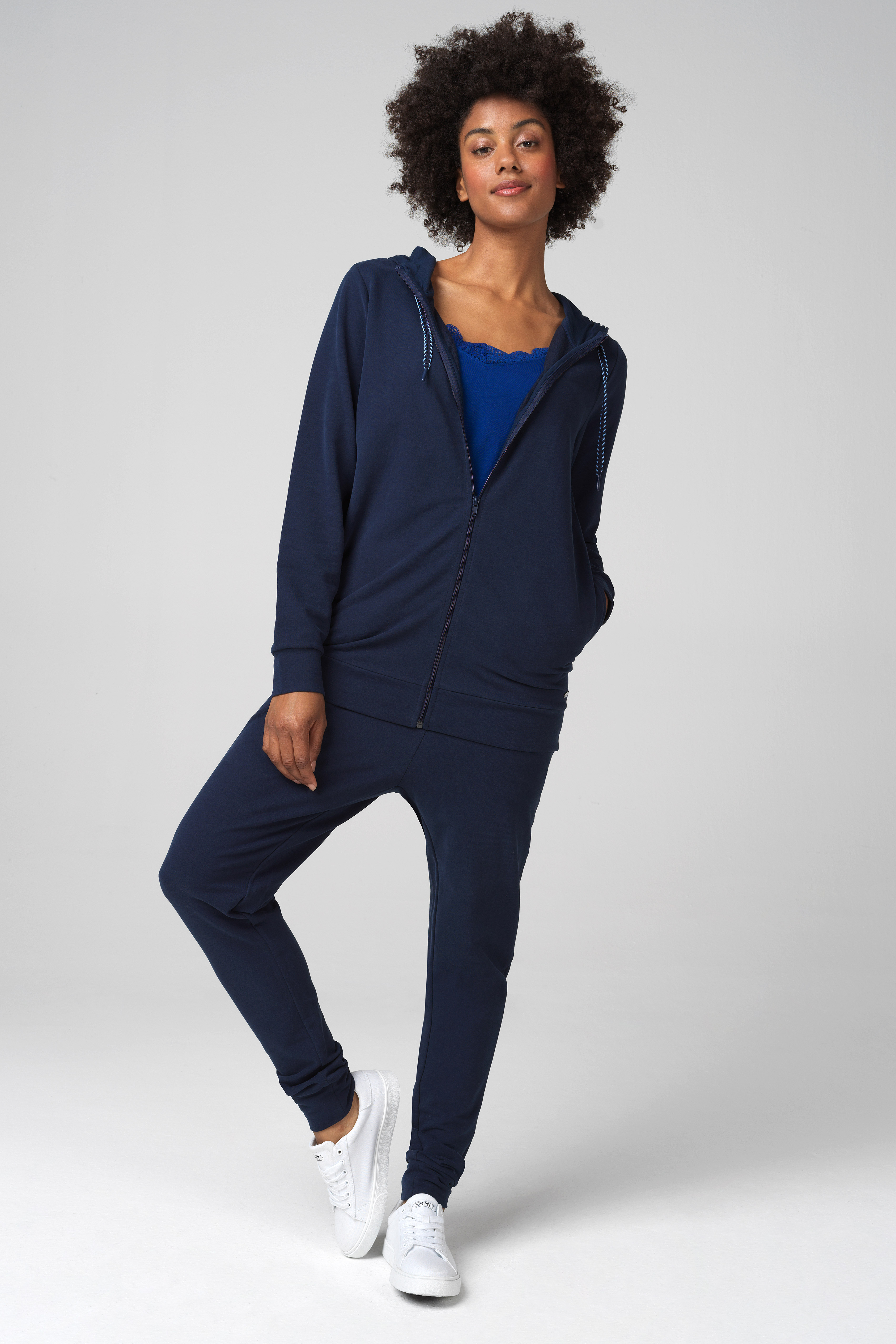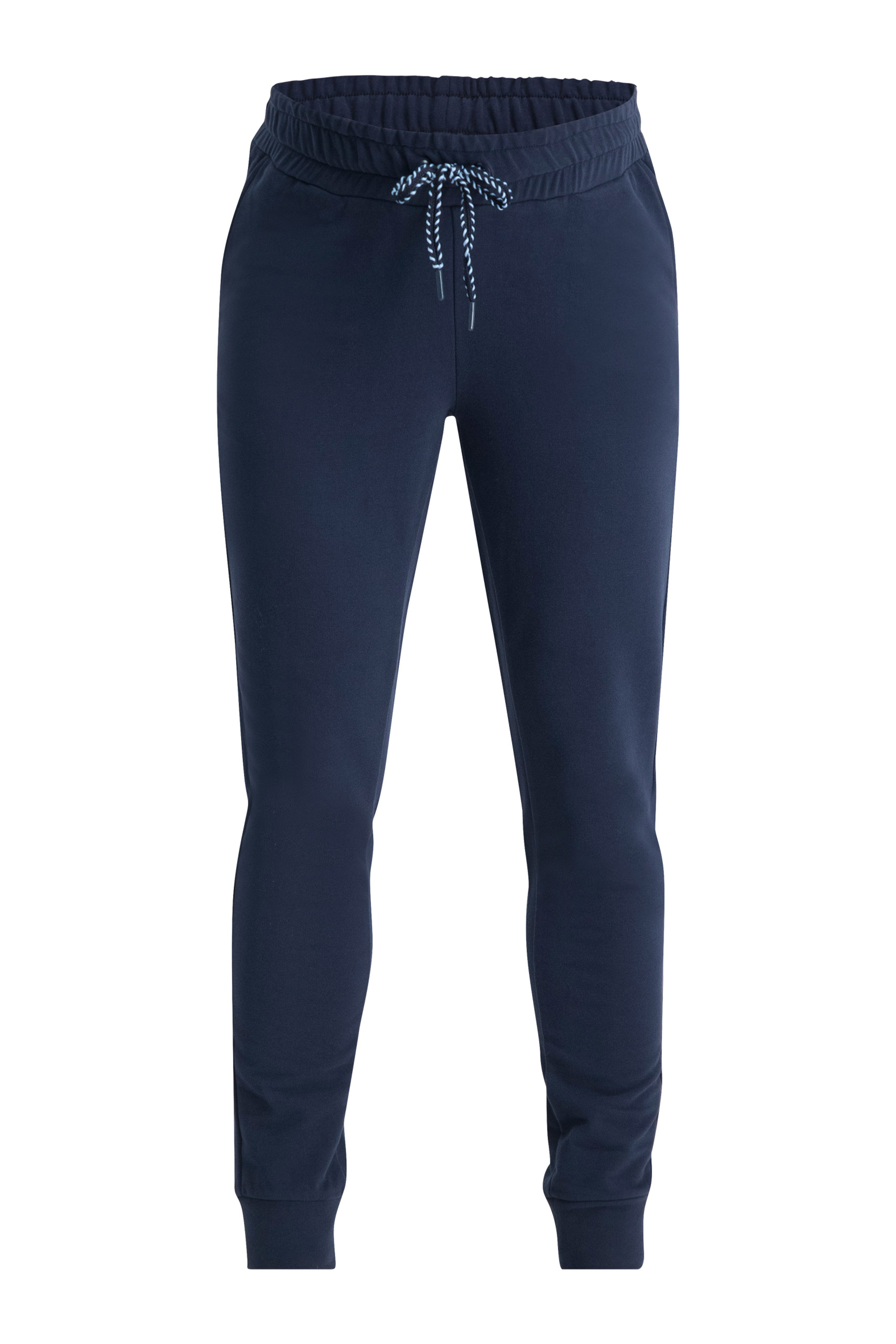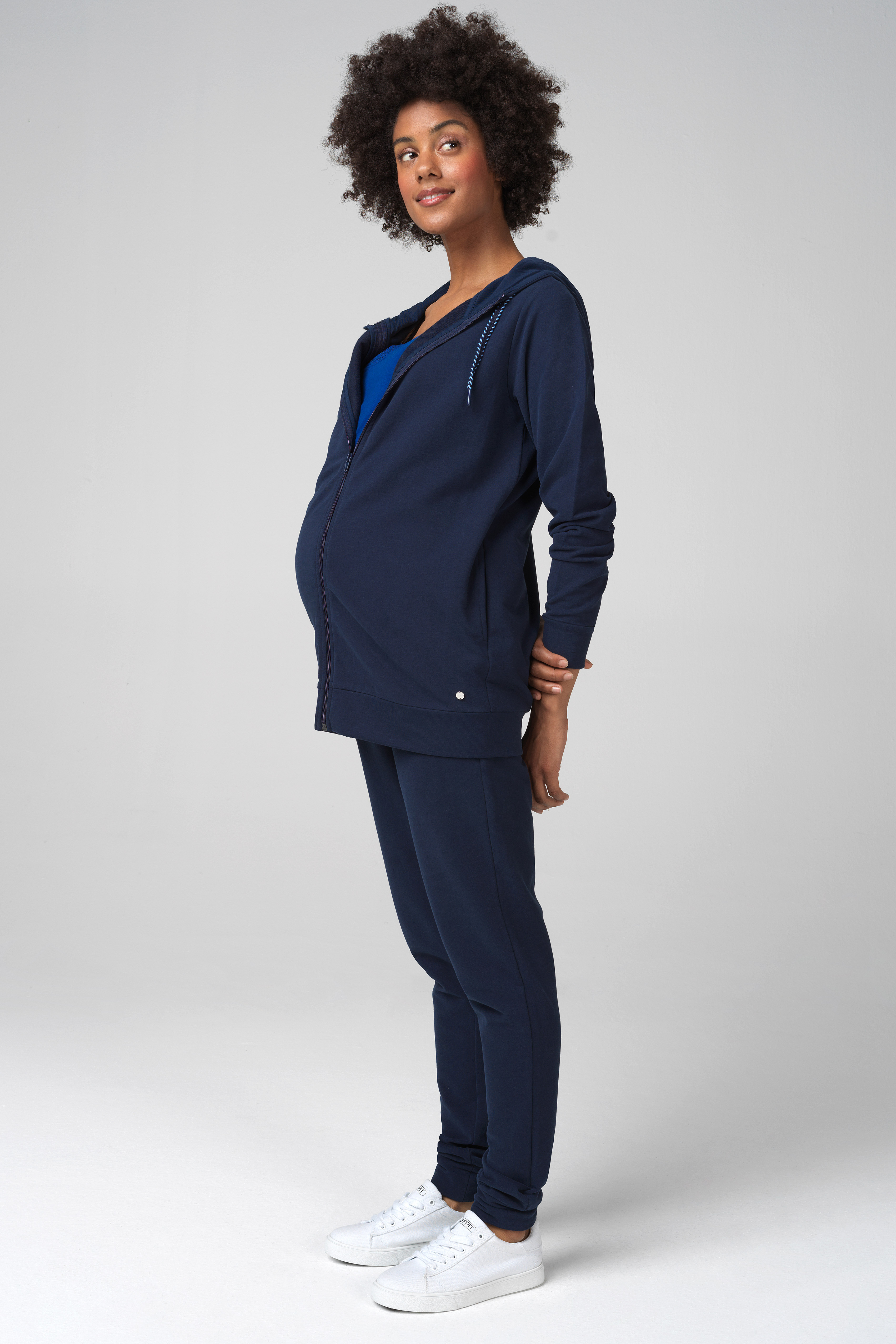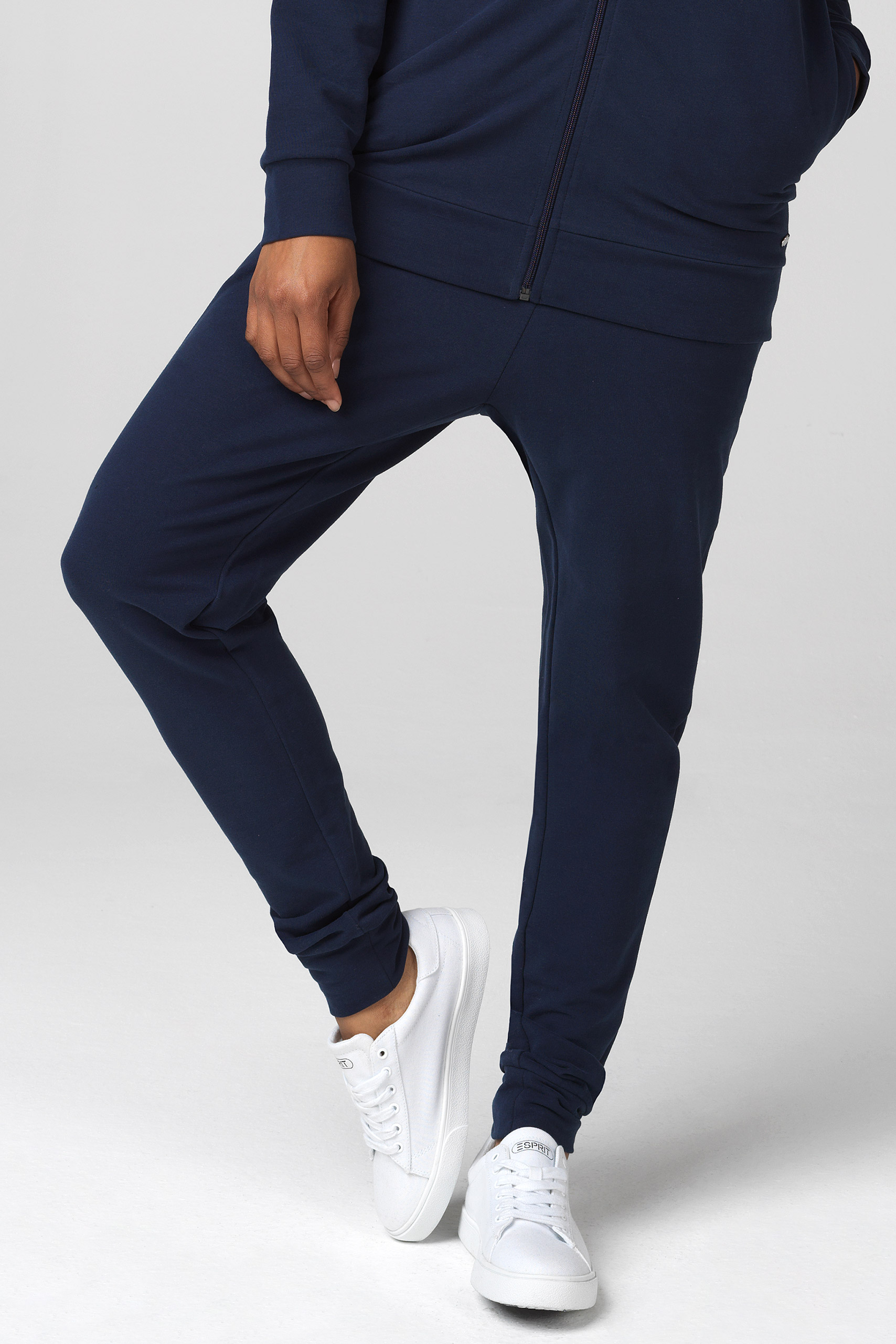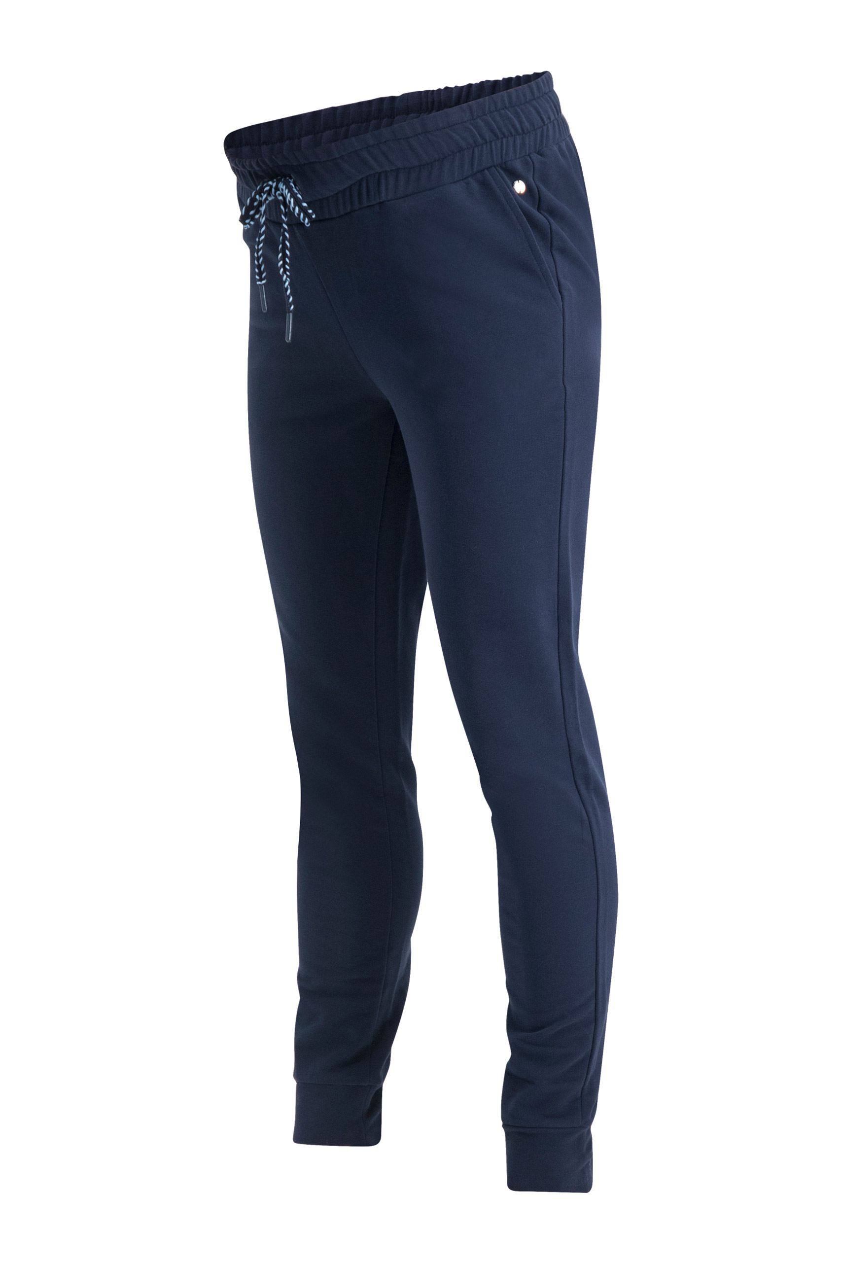 Umstands- und Loungehose aus weichem Sweatstoff mit schmalem Bein, Bündchen und Eingrifftaschen. Der elastische und verstärkte Bund mit Tunnelzug passt sich ideal an deinen wachsenden Bauch während der gesamten Schwangerschaft an. Auch nach der Geburt ein wunderbares Piece für deinen bequemen Everyday Look. Farbe: navy