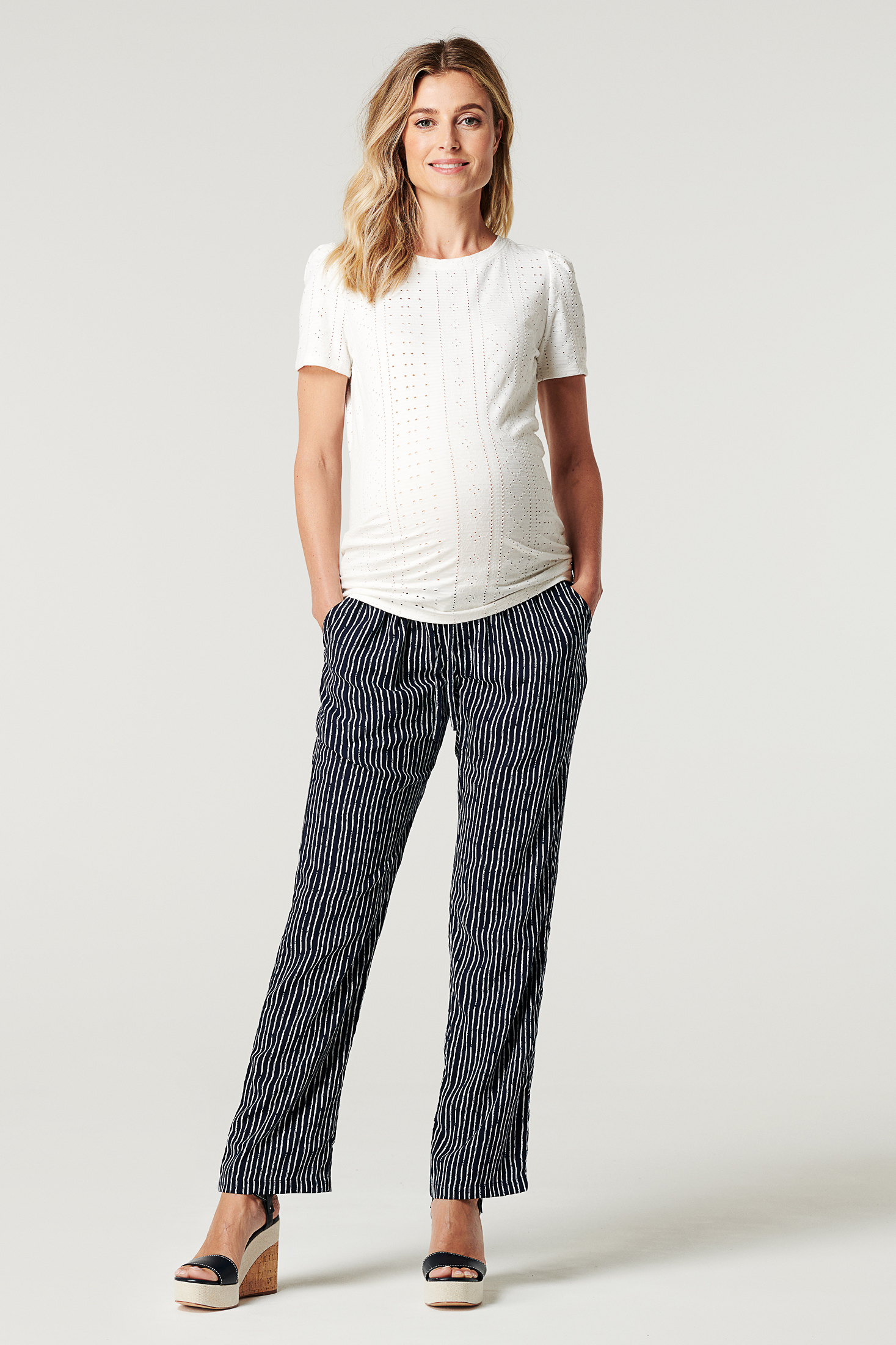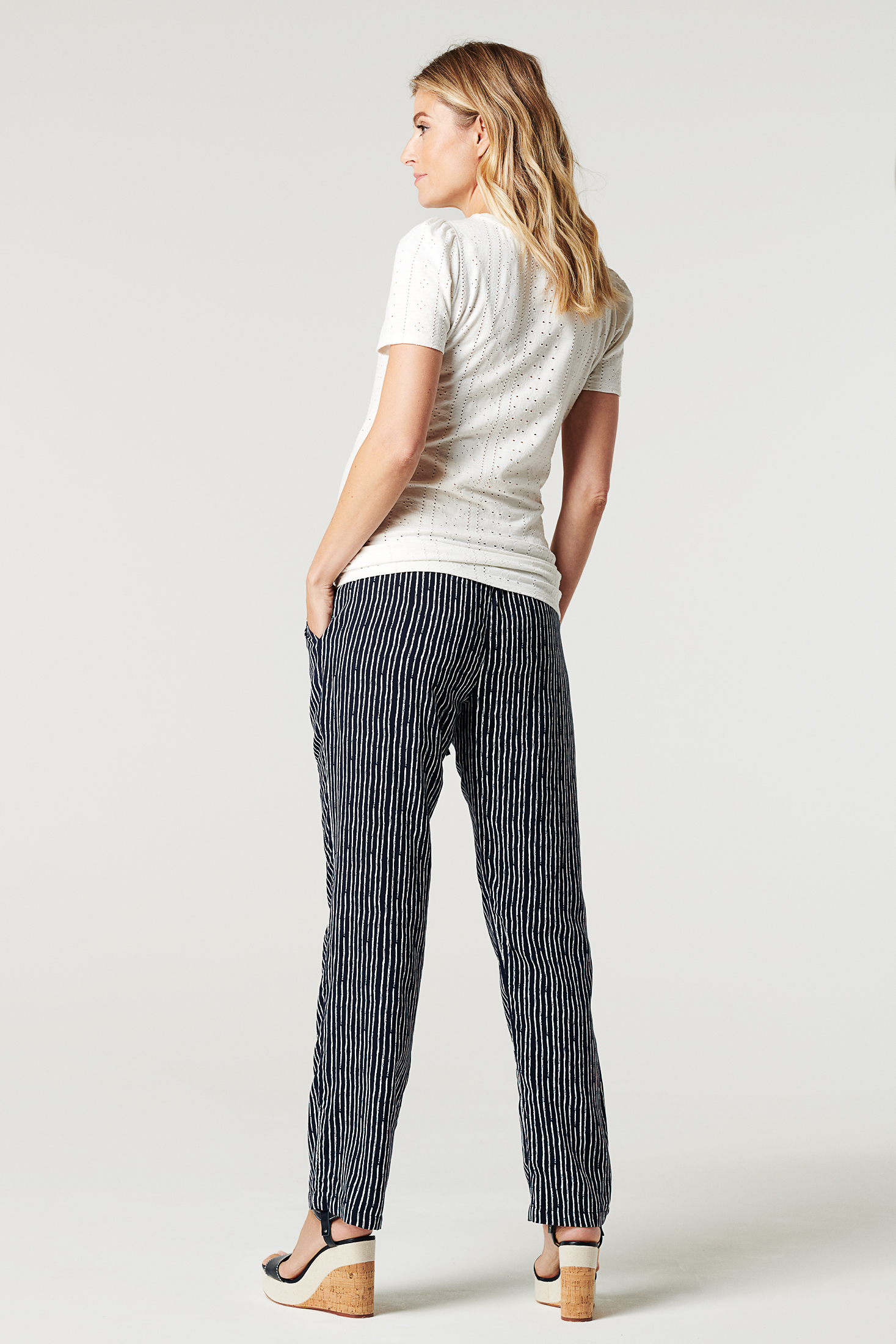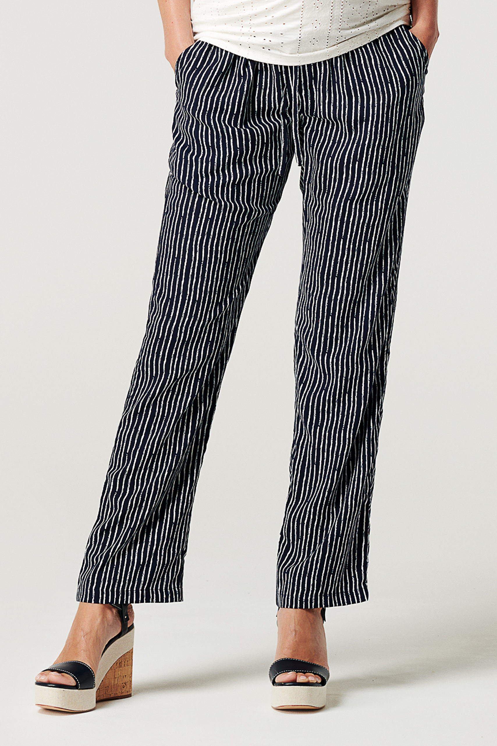 Sailor Umstandshose aus softem Viskose-Jersey mit Streifen-Muster. Der Bund der bequemen, sommerlichen Schwangerschaftshose lässt sich mit einem Kordelzug regulieren. So kannst du sie auch prima nach der Geburt noch weitertragen. Farbe: dunkelblau/weiß