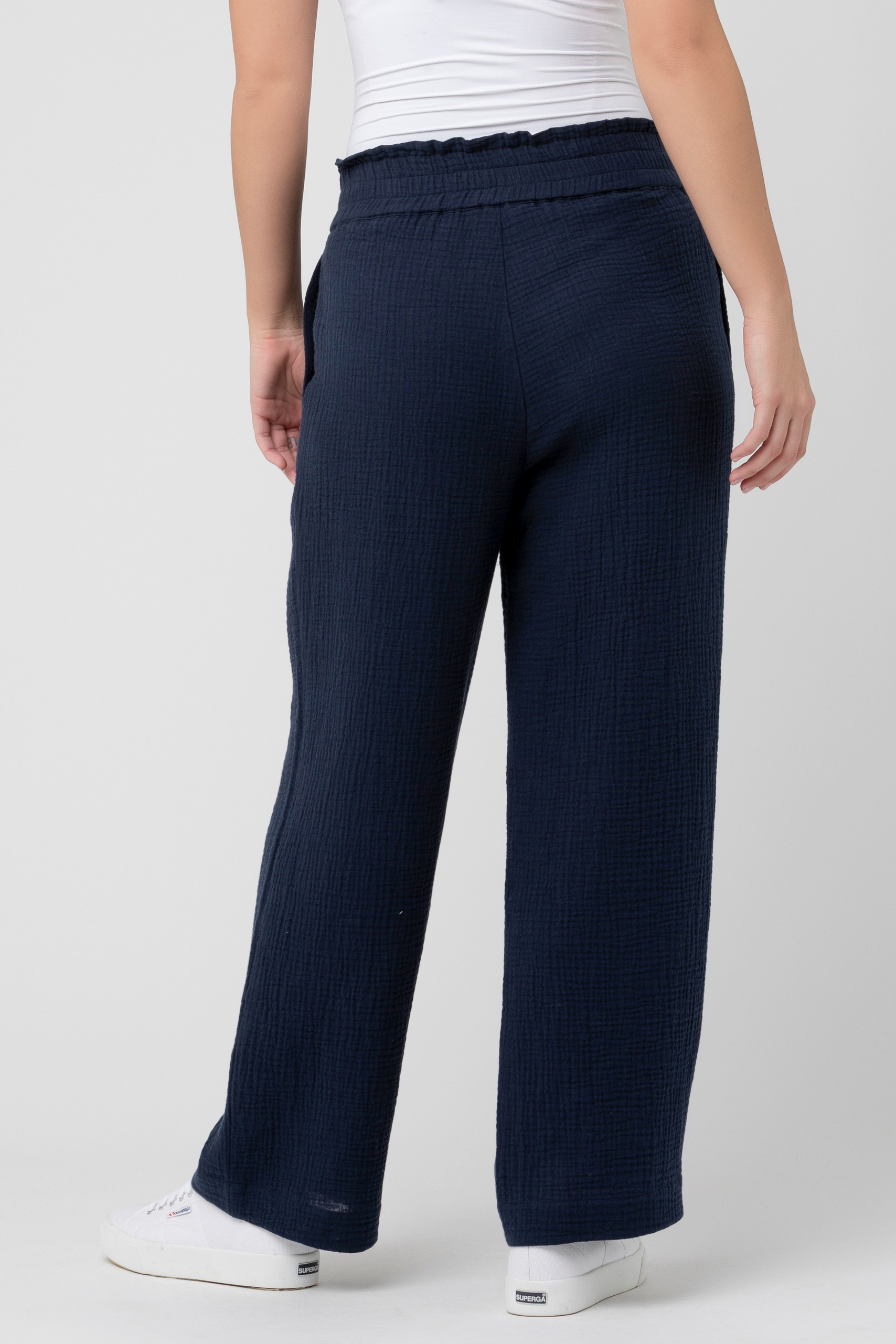 Wilde Leg Jersey Umstandshose aus luftiger Baumwolle mit breitem, elastischem Bund. Die Hose sitzt durch ihr weites Bein total bequem und verfügt über lässige Seitennahttaschen. Farbe: navy