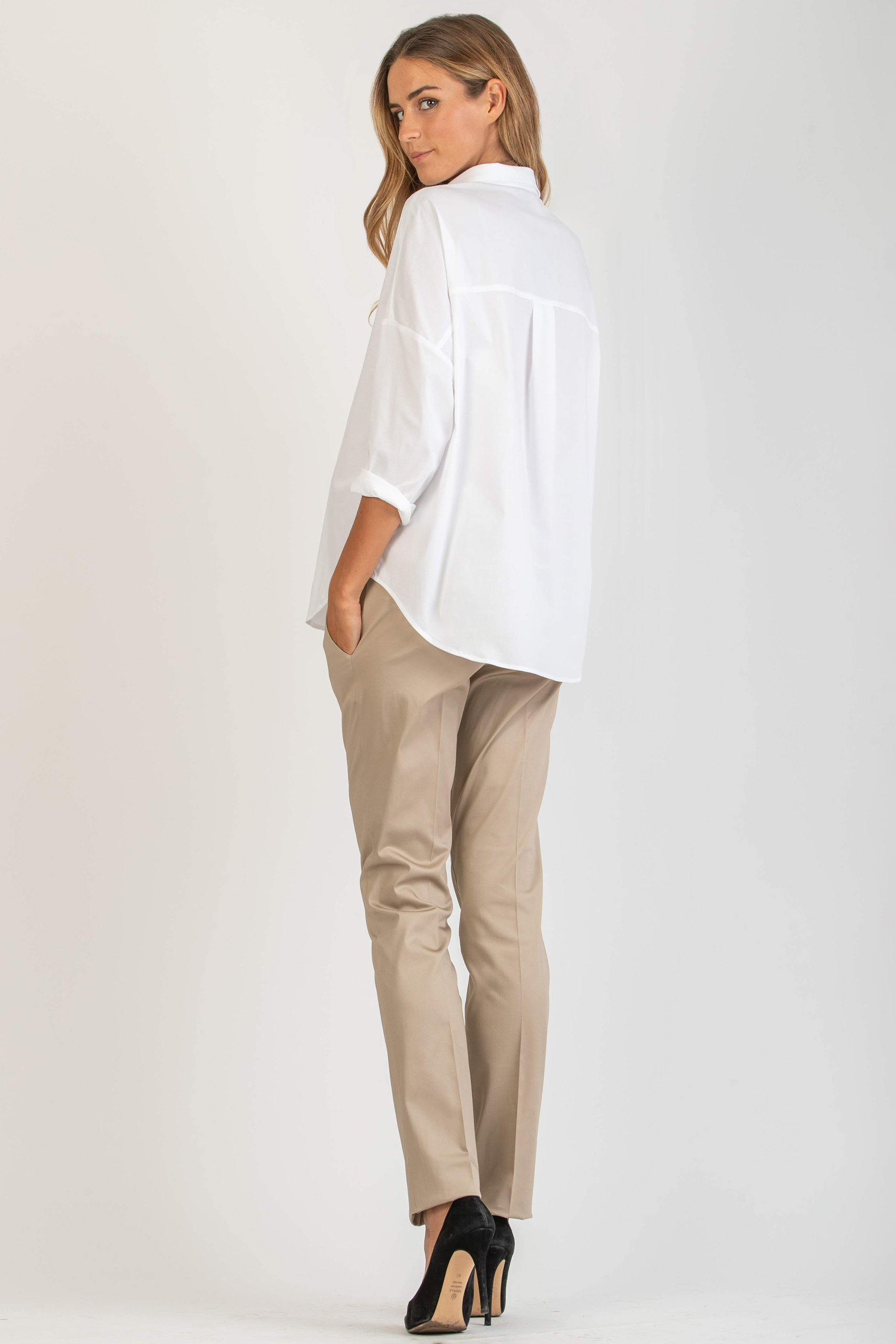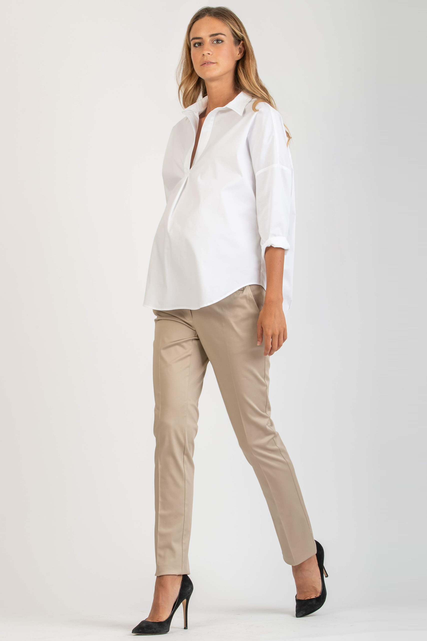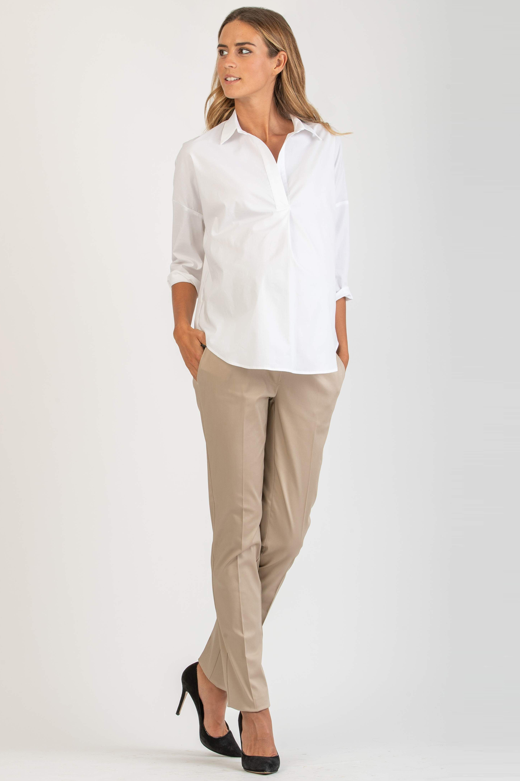 Umstandshose im Business-Look mit schmalem Schnitt, klassischer Bügelfalte und Eingrifftaschen und Gürtelschlaufen. Dank des elastischen Materials und dem weichen Bauchband kann dein Bauch problemlos darin wachsen und du erhältst den gesamten Tag über die perfekte Unterstützung. Farbe: beige