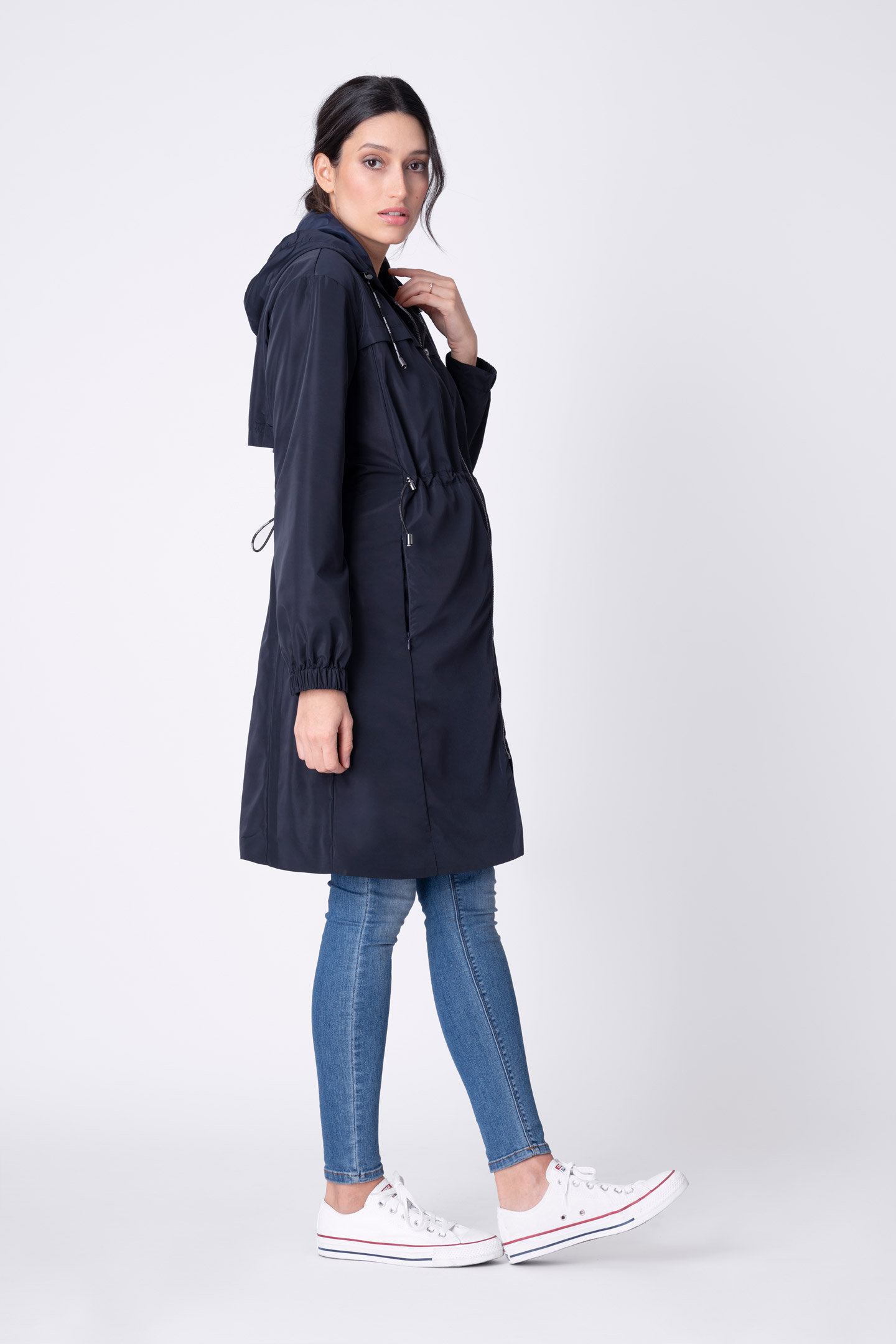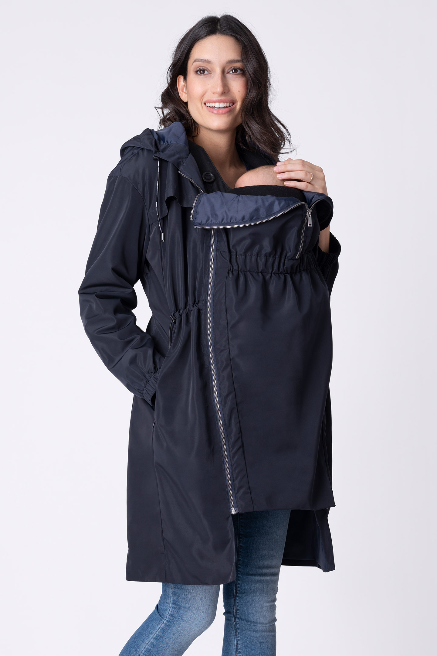 Umstandsjacke aus wasserabweisendem Material mit Kapuze, seitlichen Taschen mit Reißverschluss und flexibler Schnürung in der Taille. Die Jacke passt sich in der Schwangerschaft flexibel an deinen Bauch an. Später kannst du dein Baby dank des separaten Einsatzes in die Jacke integrieren. Perfekt für unterwegs: im Lieferumfang ist eine Tasche zur praktischen Aufbewahrung des Trage-Einsatzes enthalten. Farbe: navy