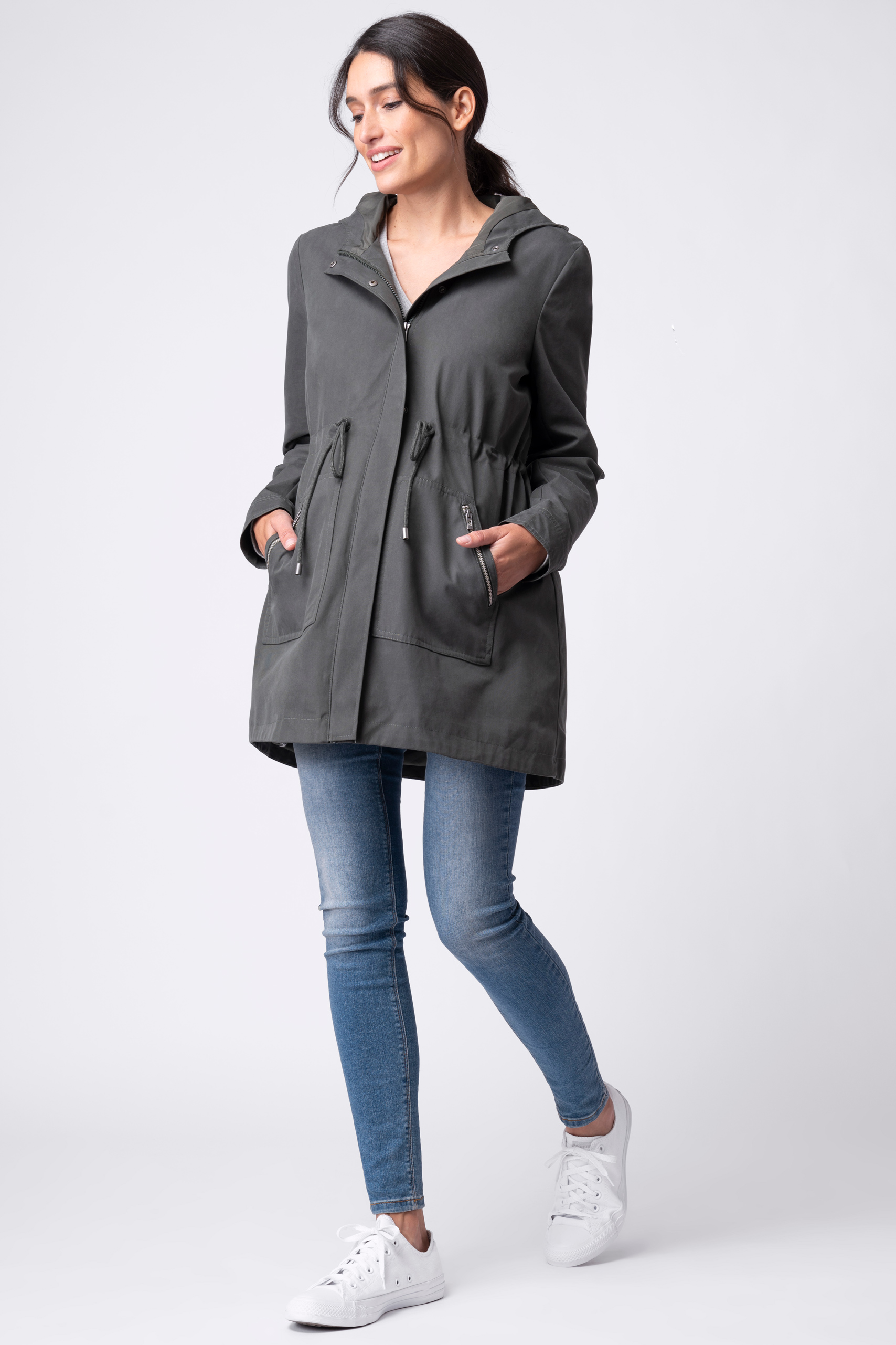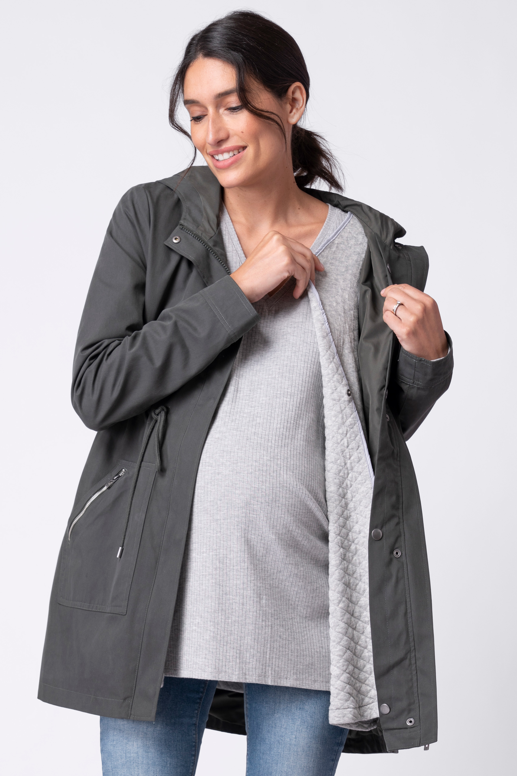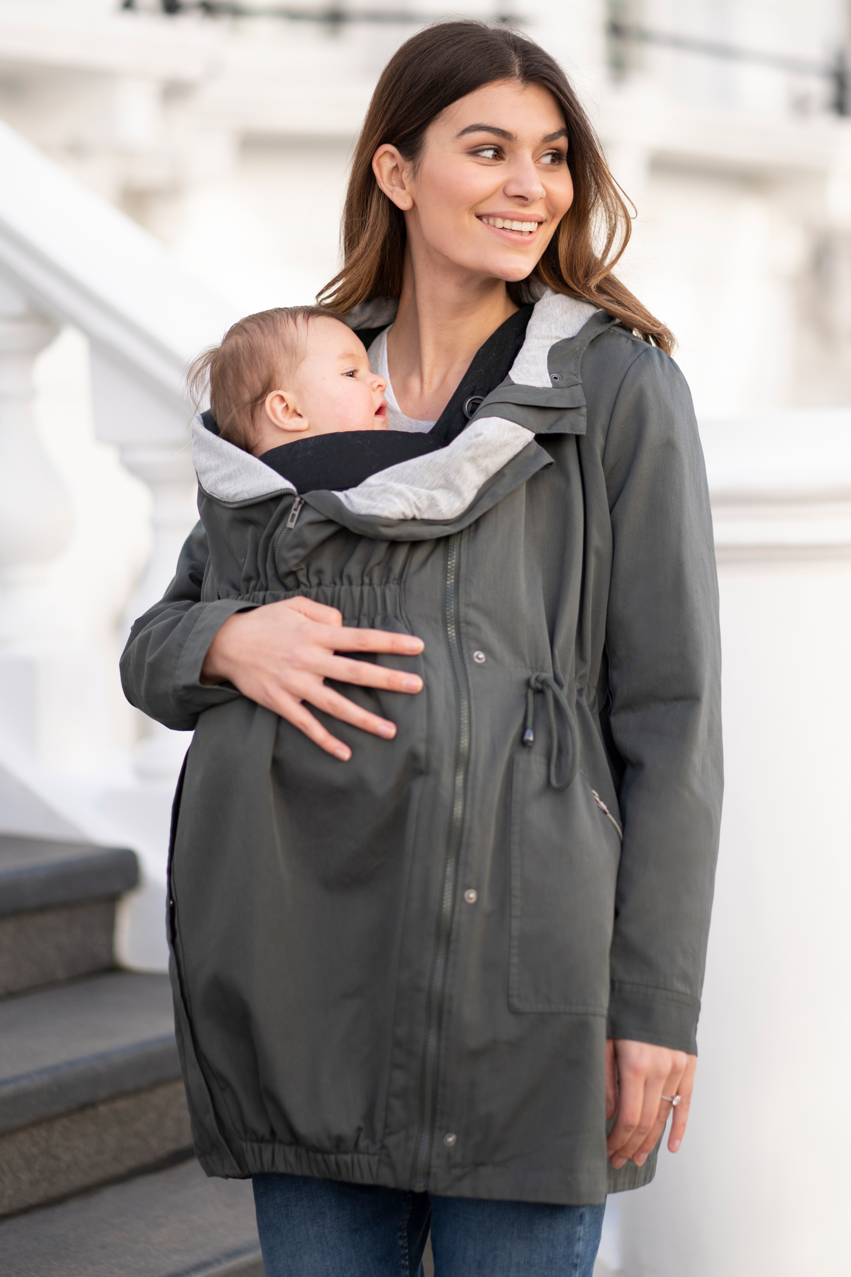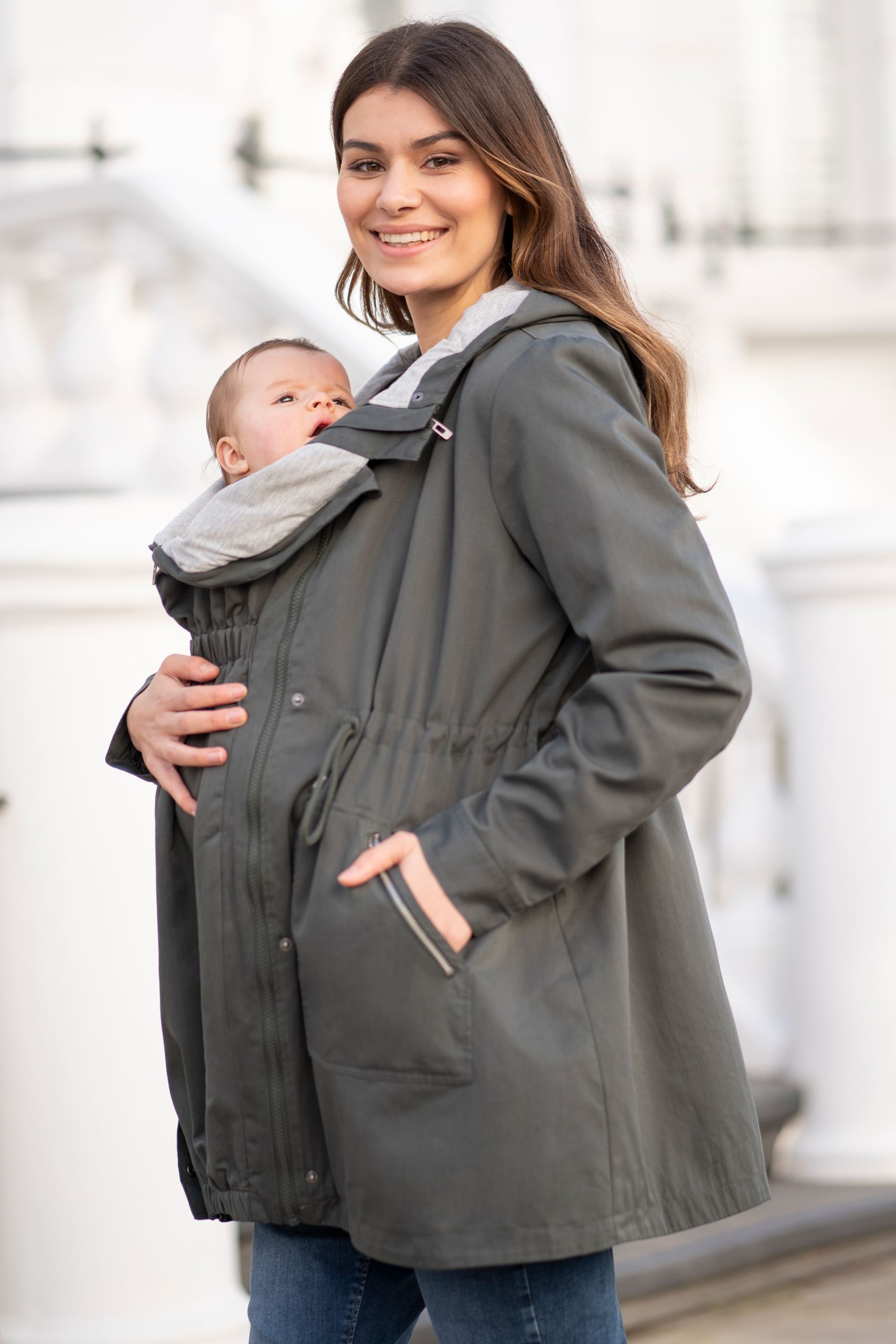 3 in 1 Utility Umstandsjacke mit Kapuze und aufgesetzten Taschen. Der Tunnelzug an der Taille ermöglicht es dir, die Jacke individuell an deine sich verändernde Figur anzupassen. So kann dein Babybauch bequem darin wachsen. Das Innenfutter aus gesteppten Jersey kannst du ganz einfach, dank praktischer Druckknöpfe herausnehmen und so die Jacke auch wunderbar bei wärmeren Temperaturen tragen. Nach der Geburt kannst du die Jacke um den beiliegenden Babyeinsatz erweitern und als Tragejacke nutzen. Das Kopfteil des Babyeinsatzes ist weich gesteppt und schützt dein Kleines vor Wind und Wetter. Später kannst du die Jacke auch ohne Babybauch und Babyeinsatz tragen. Farbe: khaki