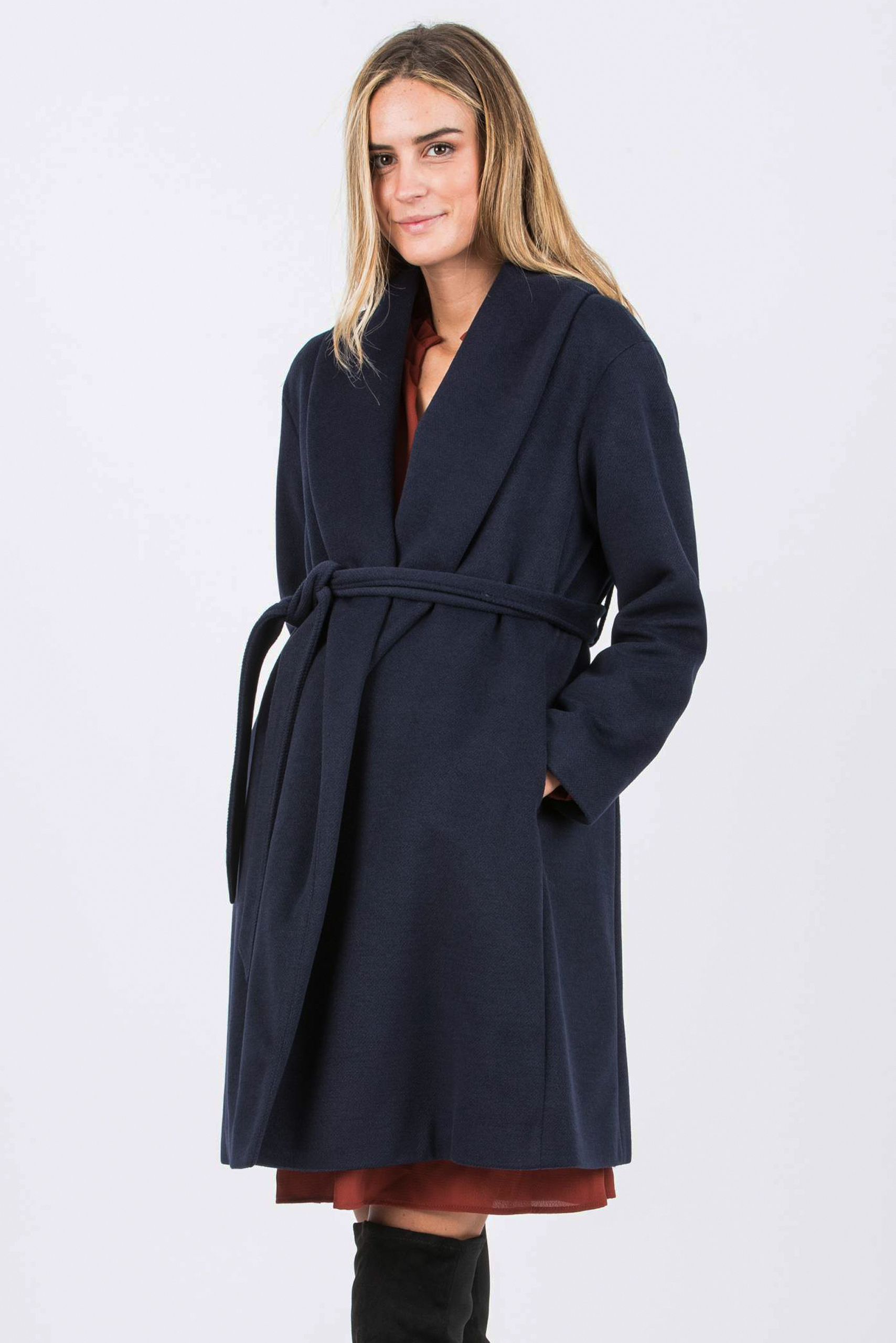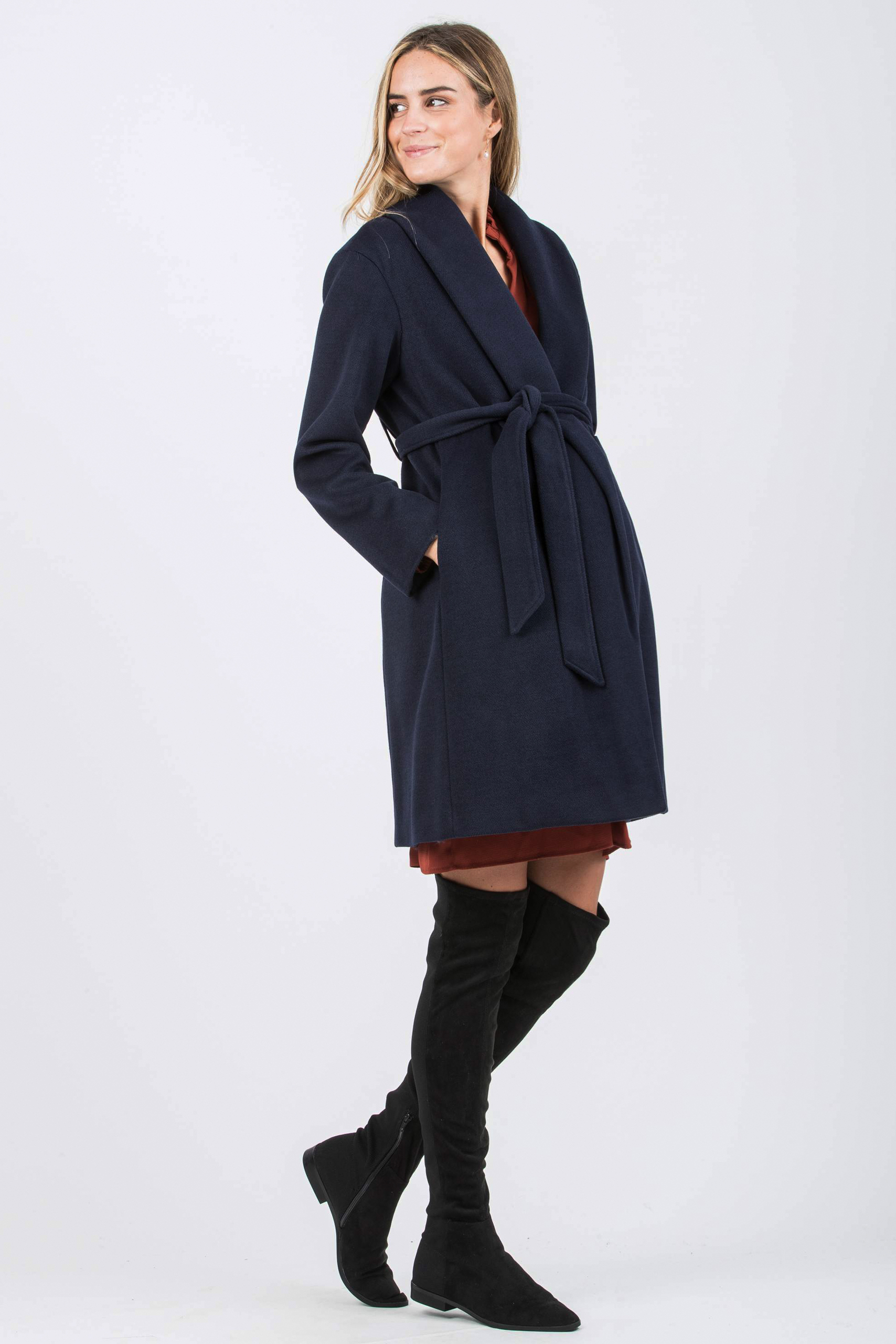Umstandsmantel mit breitem Schalkragen und Bindegürtel. Dein Babybauch hat darin viel Platz zum Wachsen. Auch nach der Geburt kannst du den weichen, wärmenden Mantel noch prima weitertragen. Farbe: navy