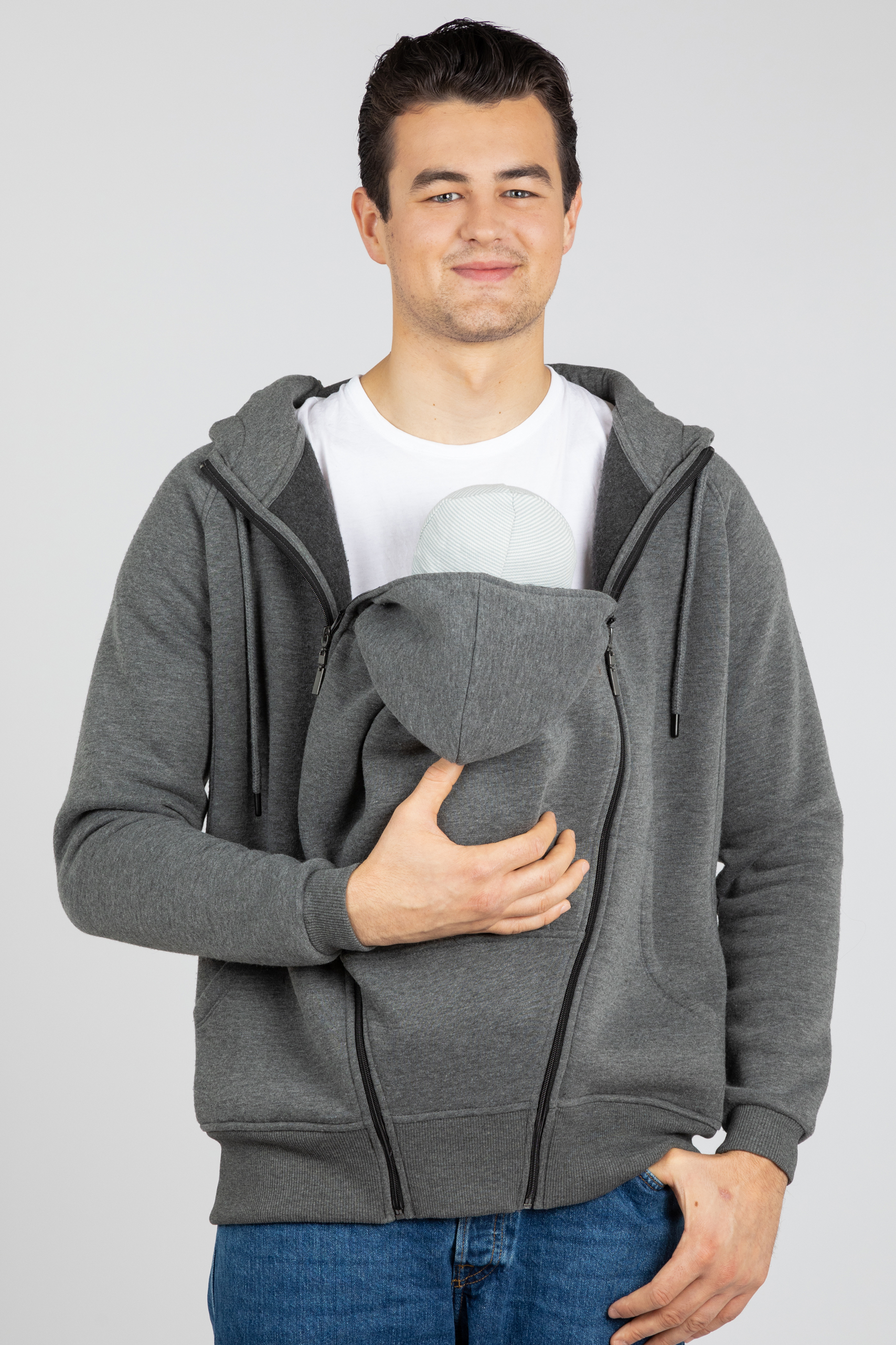Papa Hoodie und Tragejacke mit Kapuze und elastischen Bündchen aus weichem Material. Dank des einzippbaren Trageeinsatzes kannst du dein Baby ganz nah bei dir tragen, zudem hält euch der Hoodie angenehm warm. Durch den integrierten Reißverschluss wird dein Neugeborenes geschützt. Farbe: grau