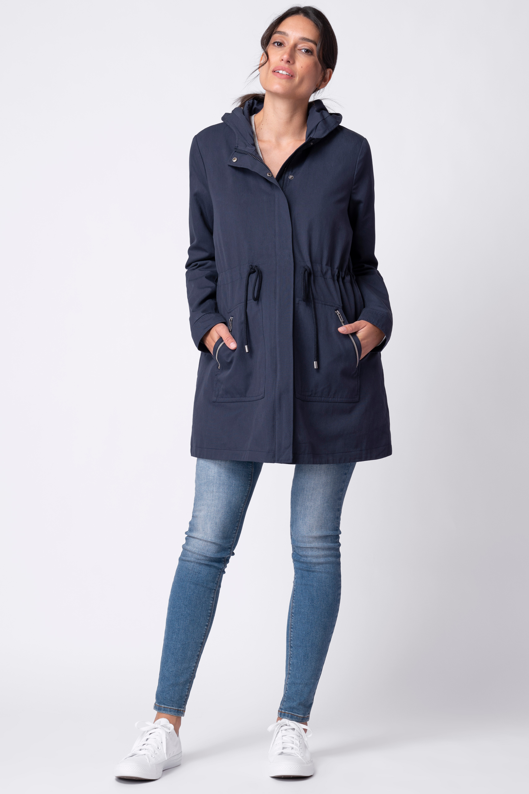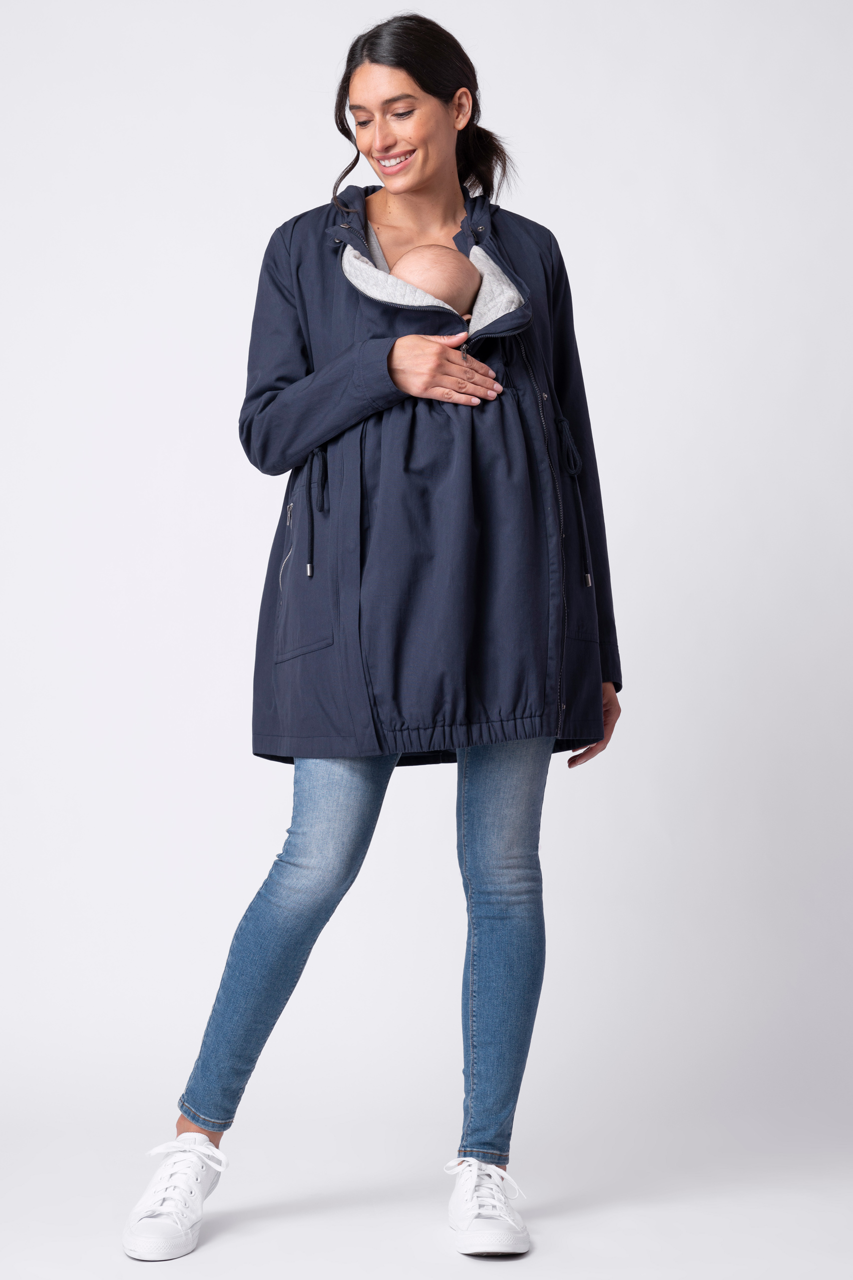 3 in 1 Utility Umstandsjacke mit Kapuze und aufgesetzten Taschen. Der Tunnelzug an der Taille ermöglicht es dir, die Jacke individuell an deine sich verändernde Figur anzupassen. So kann dein Babybauch bequem darin wachsen. Das Innenfutter aus gesteppten Jersey kannst du ganz einfach, dank praktischer Druckknöpfe herausnehmen und so die Jacke auch wunderbar bei wärmeren Temperaturen tragen. Nach der Geburt kannst du die Jacke um den beiliegenden Babyeinsatz erweitern und als Tragejacke nutzen. Das Kopfteil des Babyeinsatzes ist weich gesteppt und schützt dein Kleines vor Wind und Wetter. Später kannst du die Jacke auch ohne Babybauch und Babyeinsatz tragen. Farbe: navy