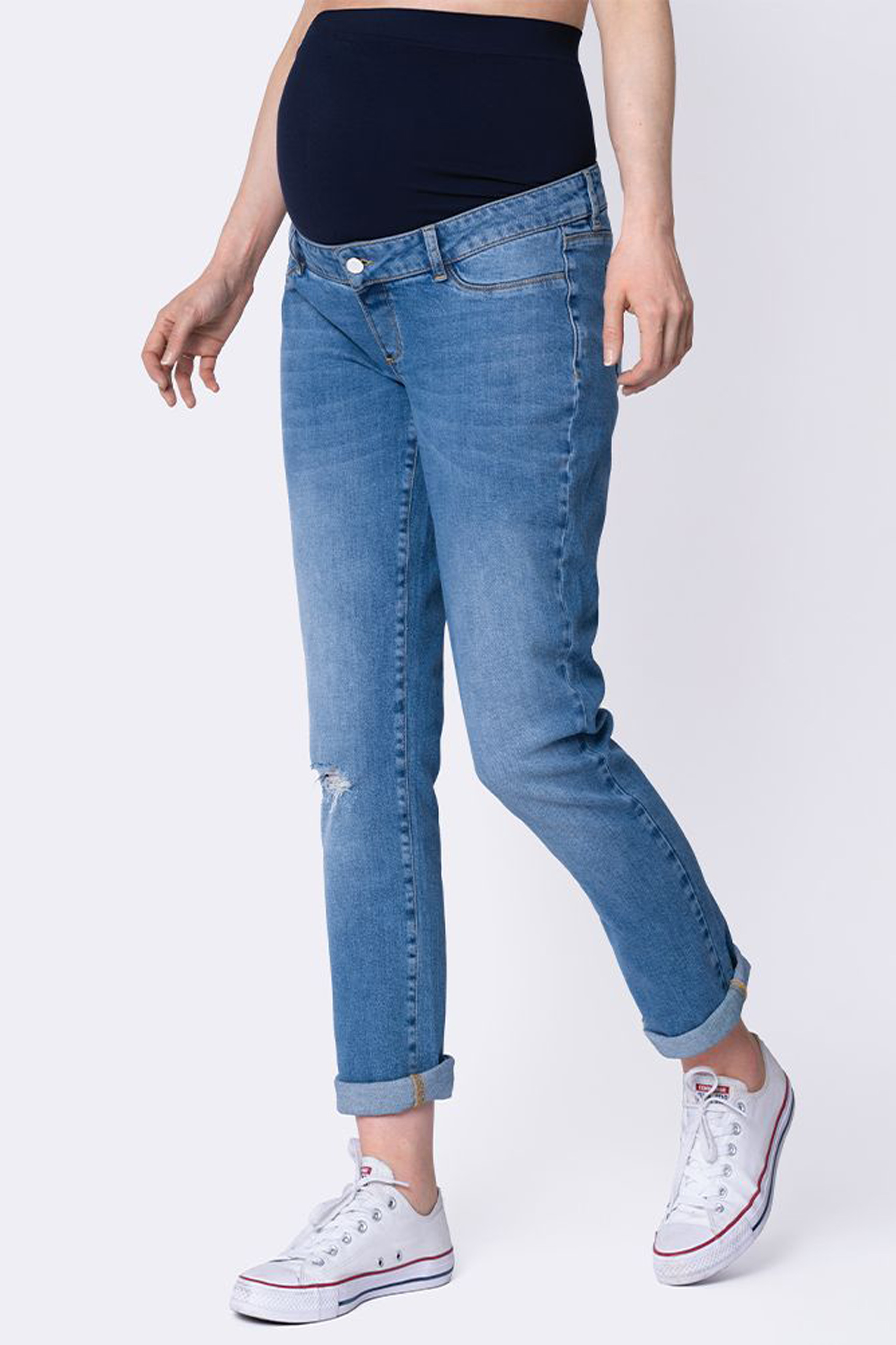 Boyfriend Umstandsjeans mit ripped Detail am Knie und elastischem Überbauchbund. Dein Babybauch hat in allen Trimester ausreichend Platz zum Wachsen. Auch in der Rückbildungsphase nach der Geburt kannst du die Jeans noch weitertragen. Das perfekte Basic für lässig-legere Looks in deiner Schwangerschaft. Farbe: denim