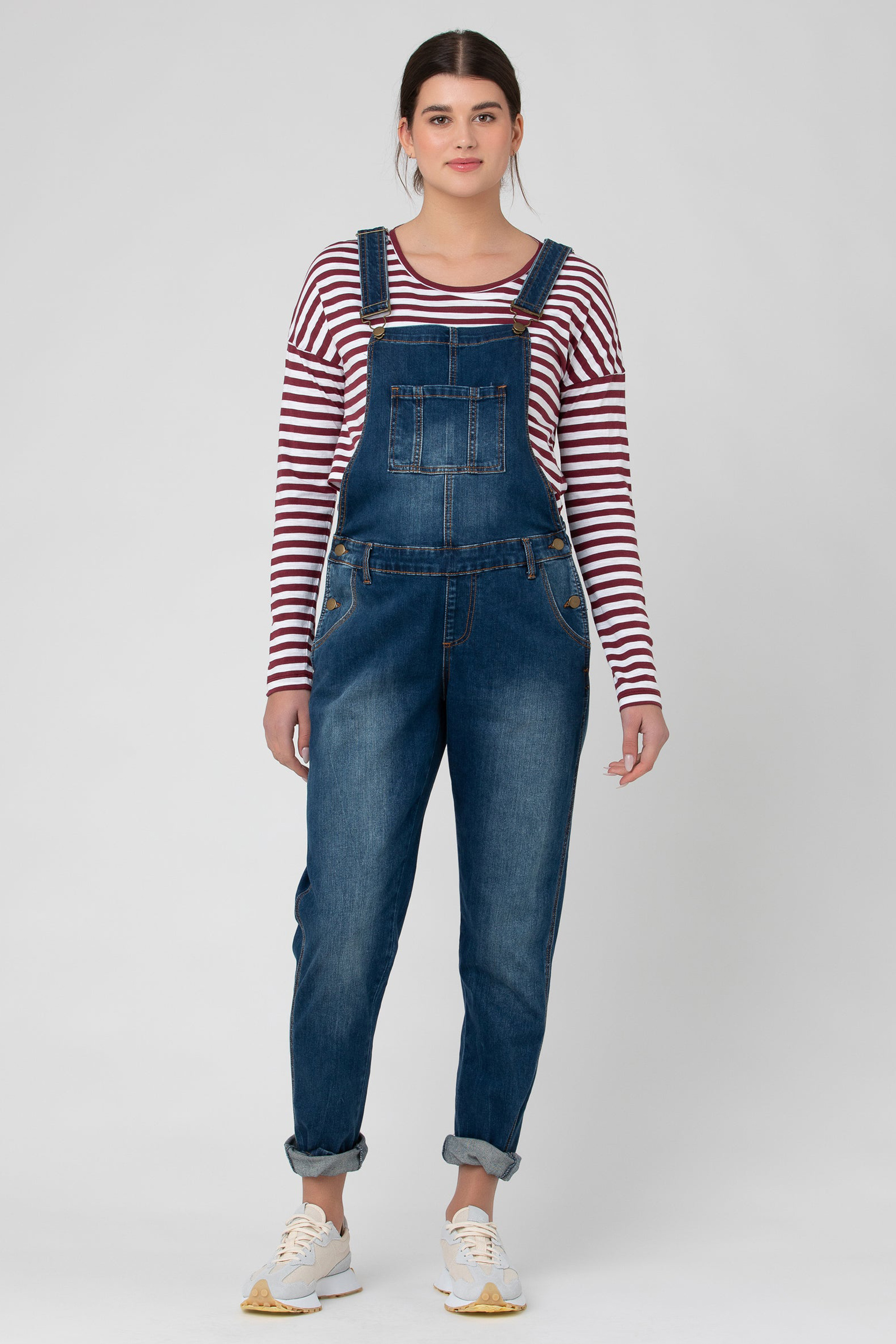 Umstands- und Still-Latzhose aus weichem, elastischem Denim. Die Hose gibt deinem wachsendem Bauch zu jeder Zeit ausreichend Platz und ist auch während der Stillzeit wunderbar geeignet. Hierzu trägst du einfach eines unserer Stillshirts darunter und öffnest einen Träger für einen diskreten Zugang zur Brust. Farbe: dark denim