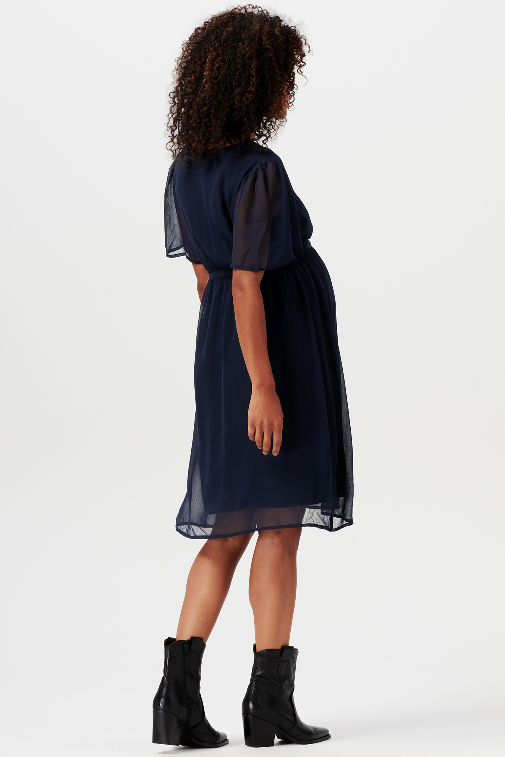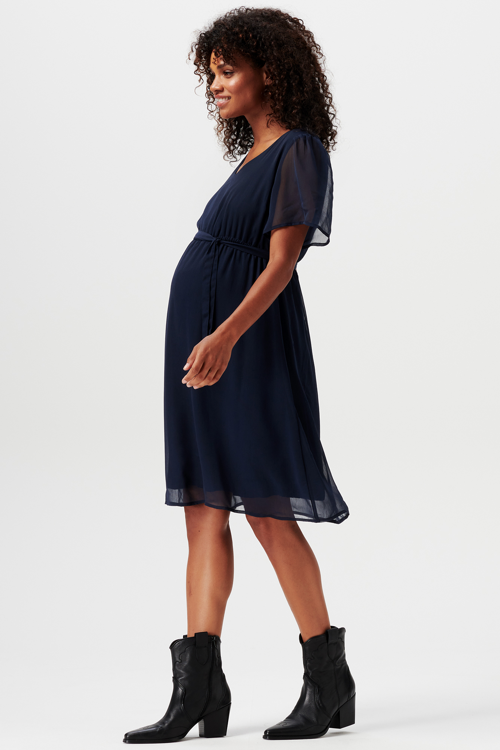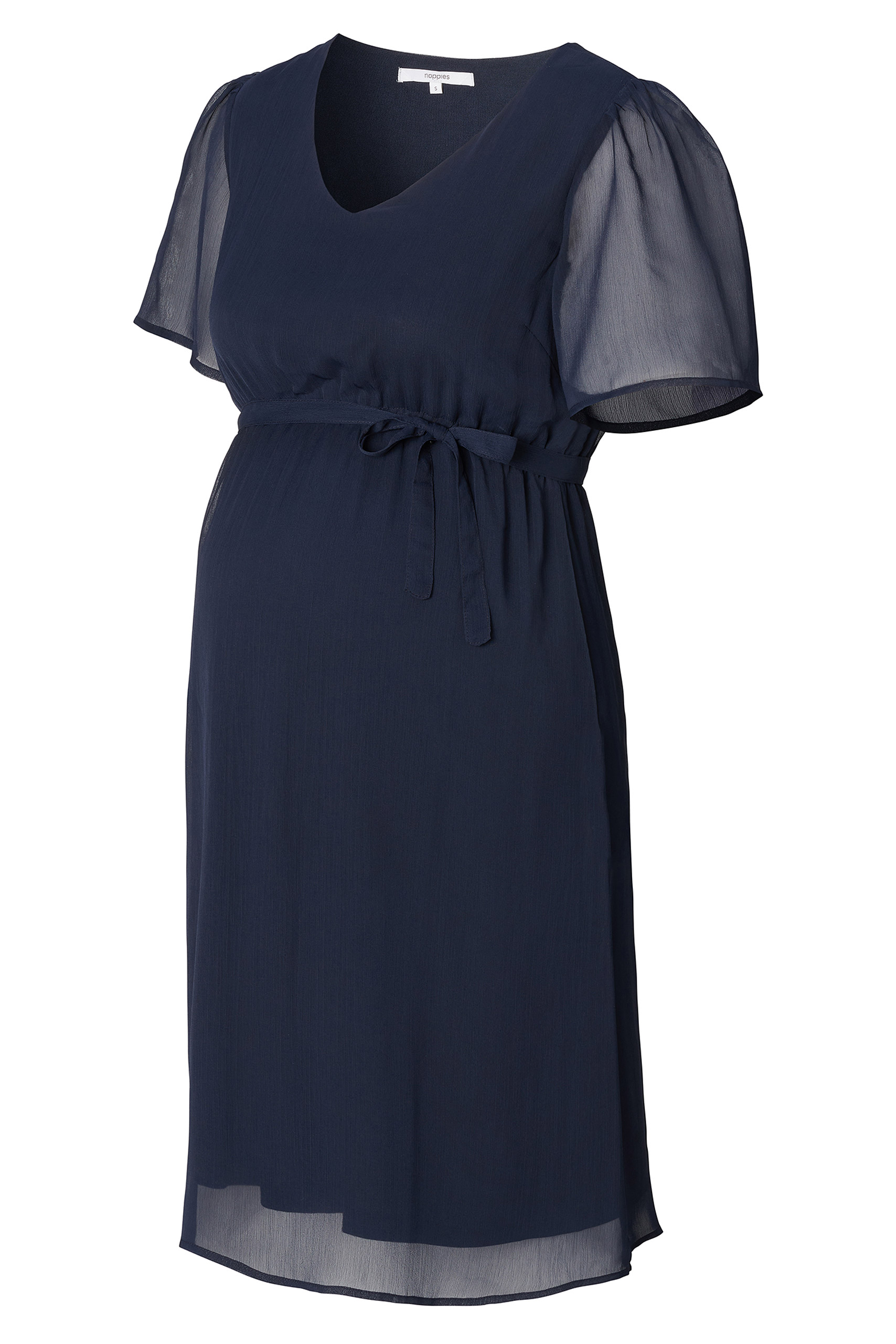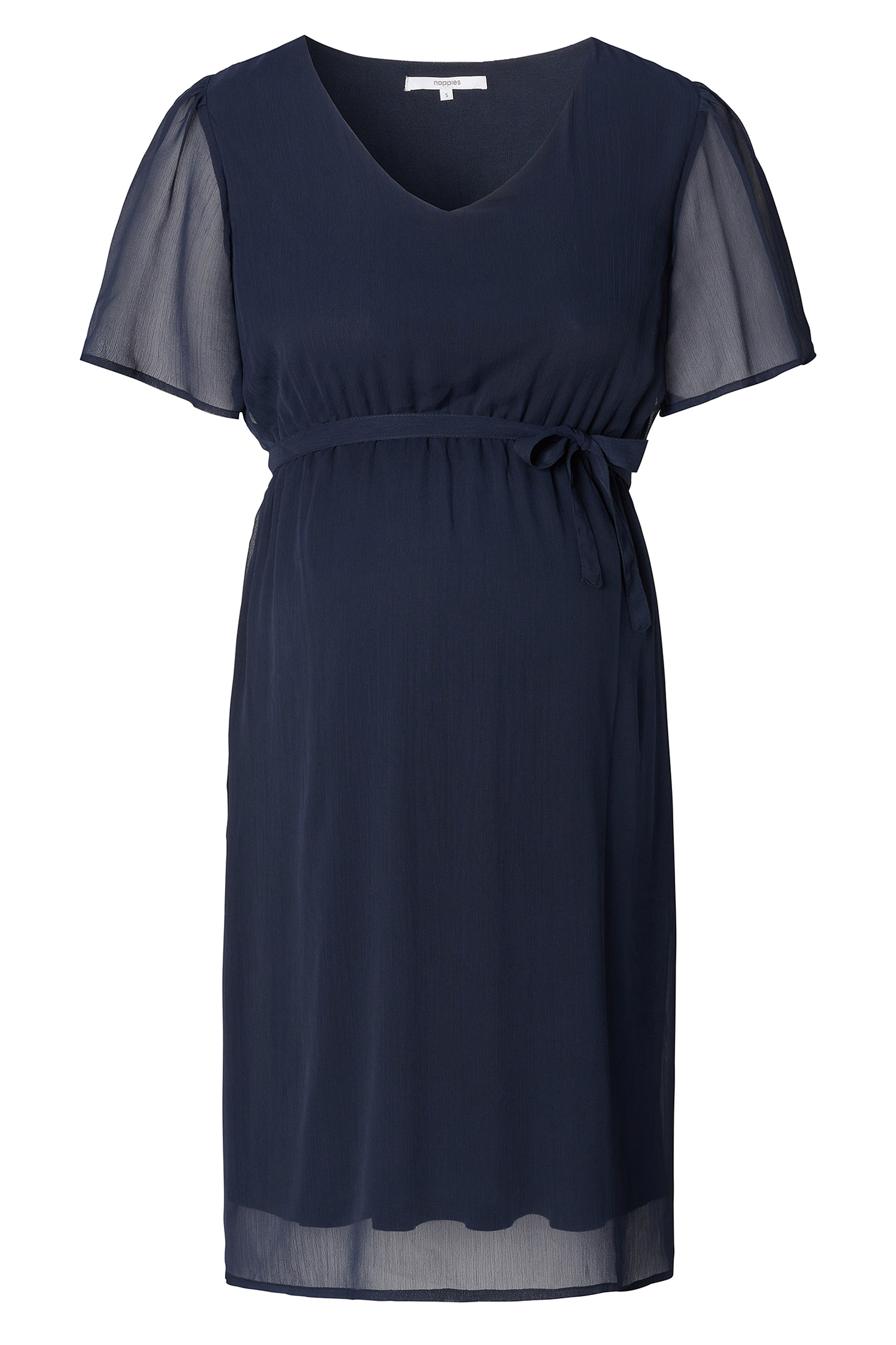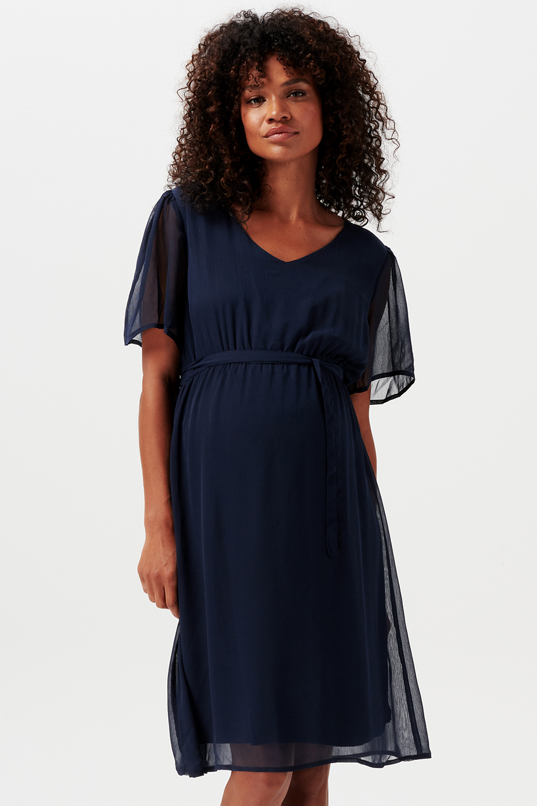 Doppellagiges Eco Umstandskleid aus recyceltem Material mit transparenten Flügelärmeln und Bindegürtel. Der transparente Stoff, welcher sich im Design durchgängig wiederfindet, macht das Kleid zu einem einzigartigen Eye-Catcher. Unterhalb der Brust befindet sich ein Bindegürtel, welcher vorne über deinem Babybauch gebunden werden kann. Dadurch erhältst du in deiner gesamten Schwangerschaft eine charmante Silhouette. Farbe: navy
