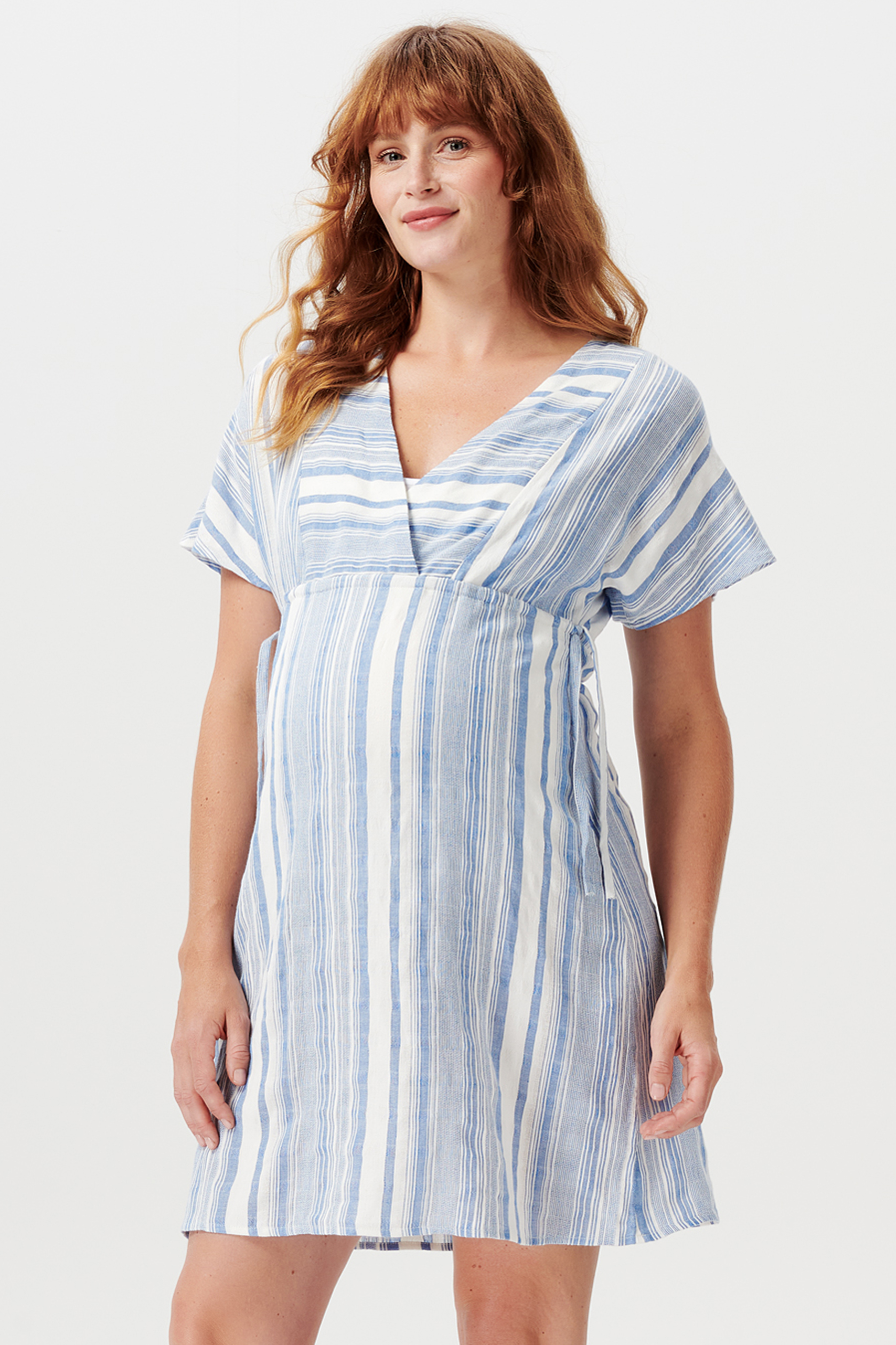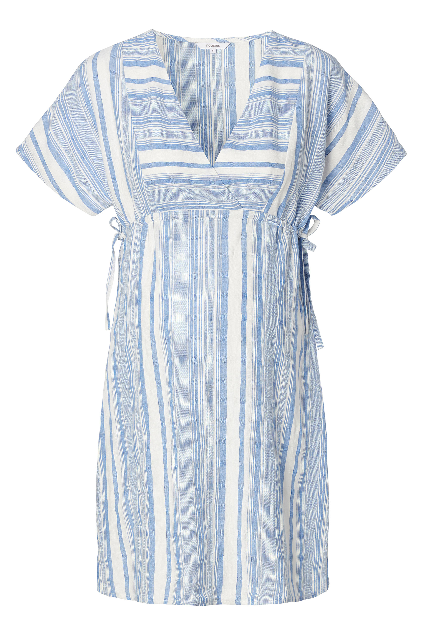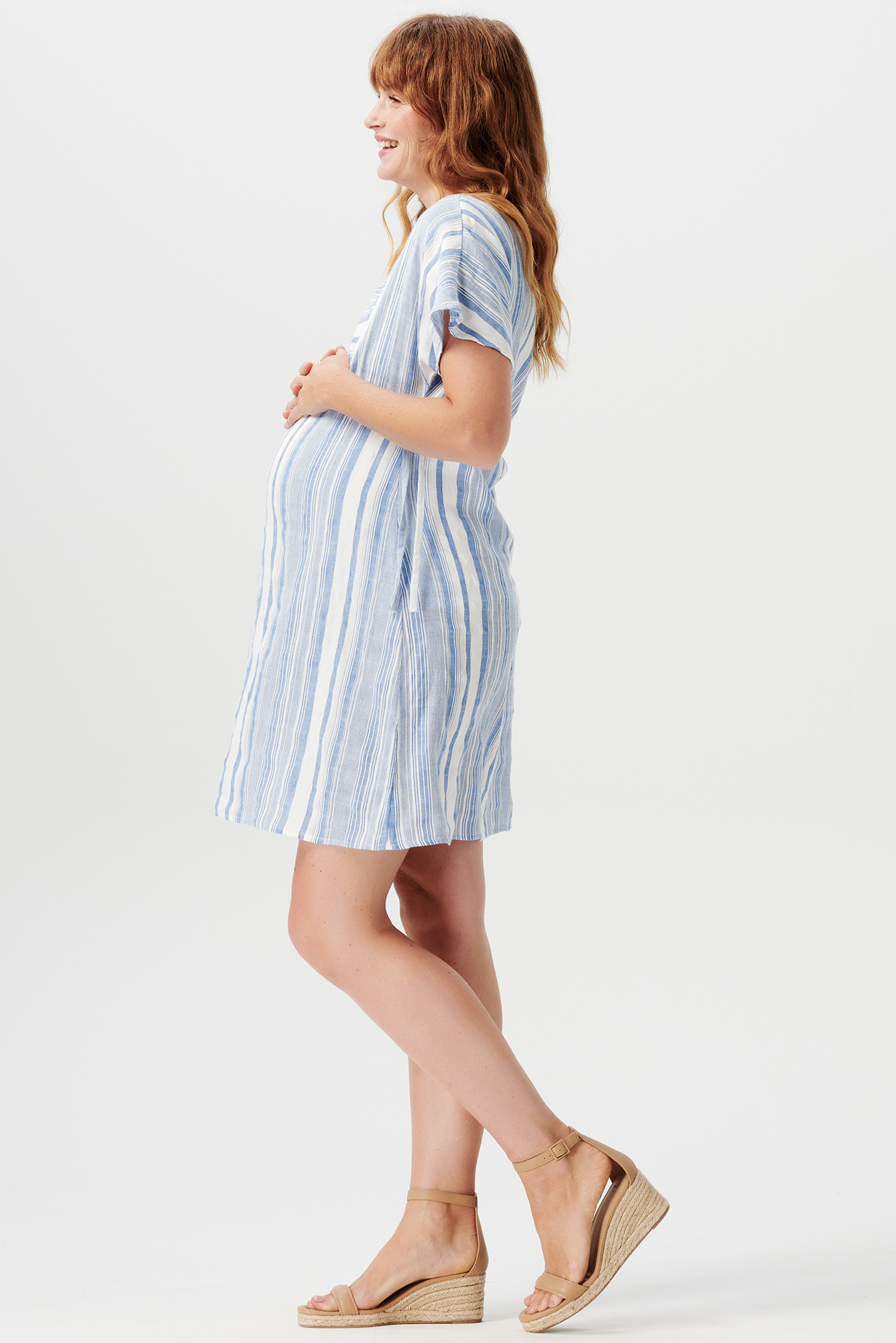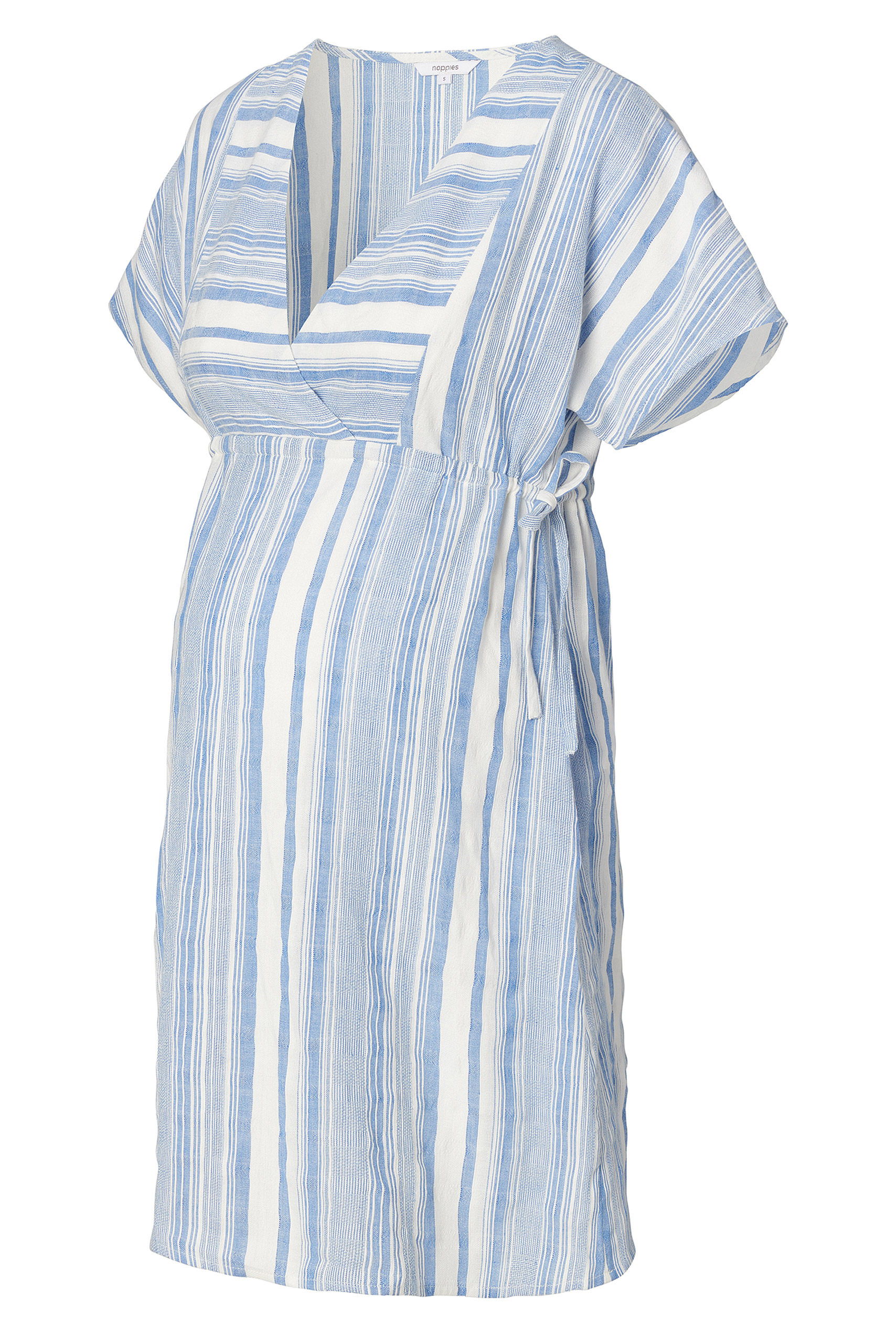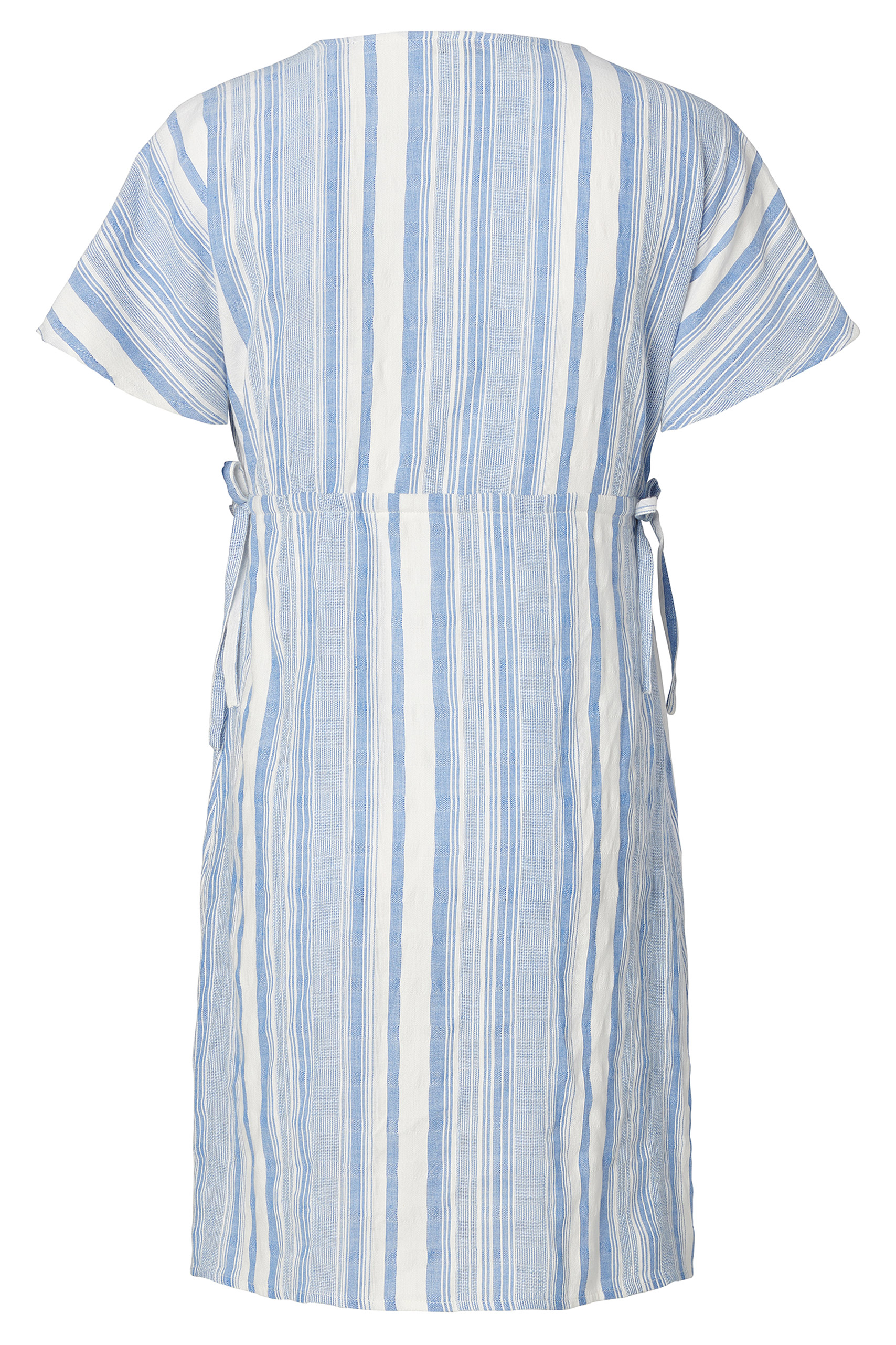 Gestreiftes Tunika- Umstandskleid mit kurzen Ärmeln aus weicher Viskose und Cross-Over Ausschnitt. Passe das Kleid perfekt an deiner Taille an, indem du die Bänder des integrierten Tunnelzugs seitlich bindest. Farbe: hellblau