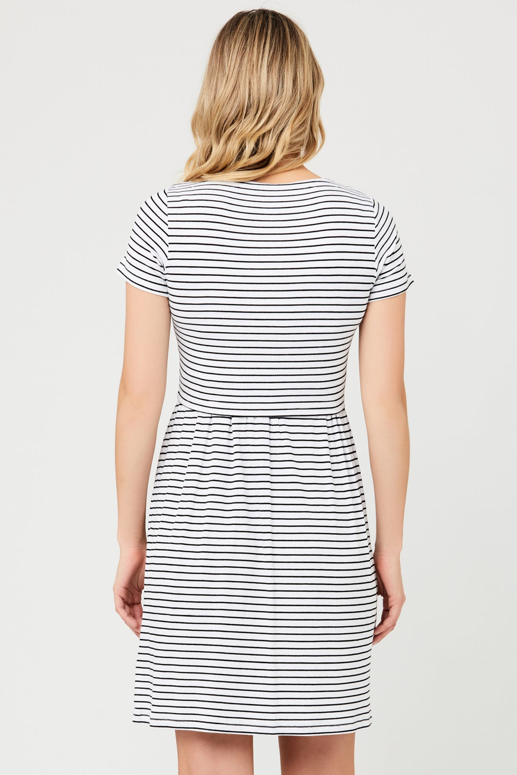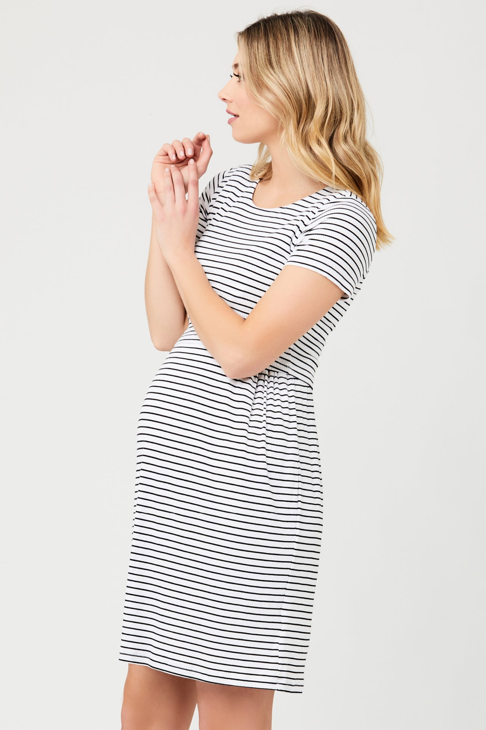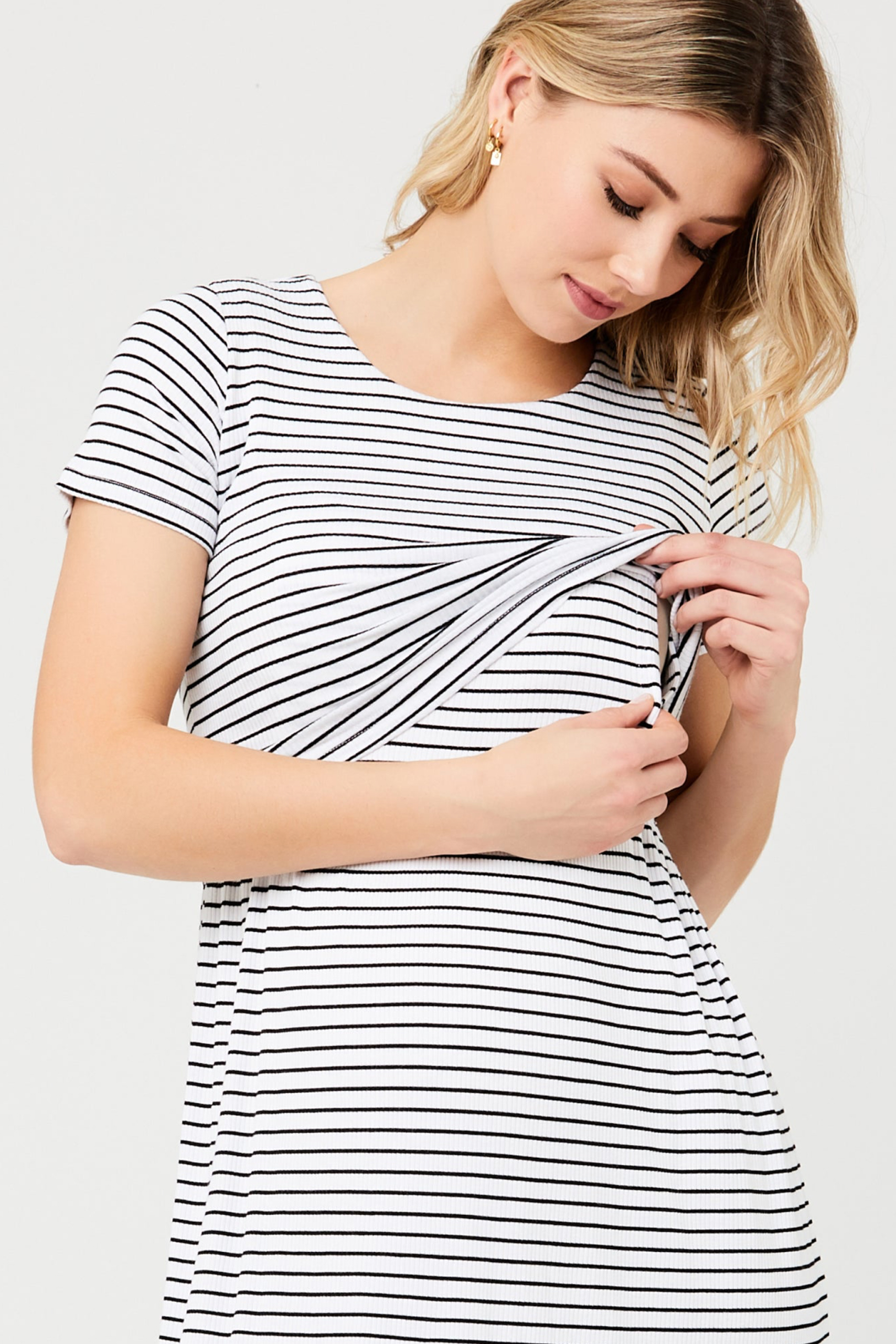 Umstands- und Stillkleid mit Querstreifen, kurzen Ärmeln und versteckter Stillöffnung. Das Kleid passt sich durch das taillierte Oberteil und die Raffungen an der Hüfte perfekt an deine Silhouette an. Durch den doppellagigen Ausschnitt kannst du dein Baby jederzeit ganz schnell und einfach stillen. Farbe: schwarz/weiß
