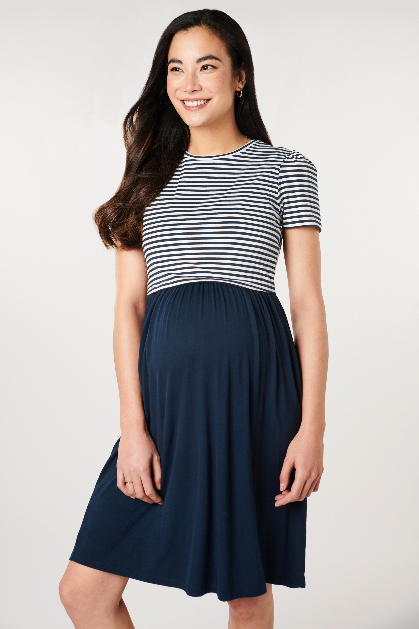 Umstands- und Stillkleid mit Rundhalsausschnitt und leichten Puffärmeln aus weicher Bio-Baumwolle. Dein Babybauch kann dank speziellem Schnitt und Betonung der Empire Linie bequem darin wachsen. Zum Stillen schiebst du das doppellagige Oberteil nach oben. Nachhaltigkeit durch langes Tragen: Das Material und der Schnitt des Kleides wurden so entwickelt, dass du das Kleid auch prima ohne Babybauch weitertragen kannst. Farbe: navy/streifen
