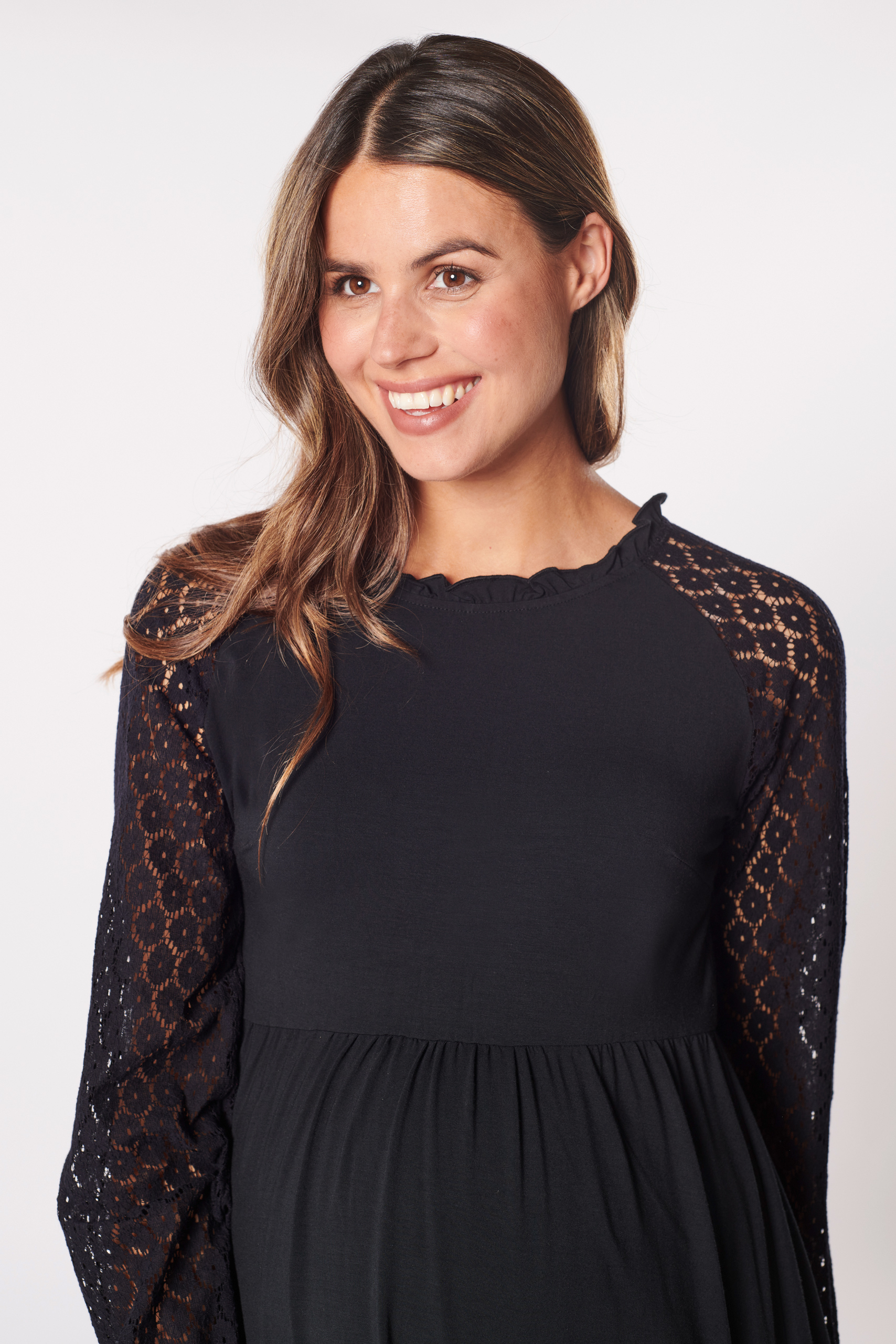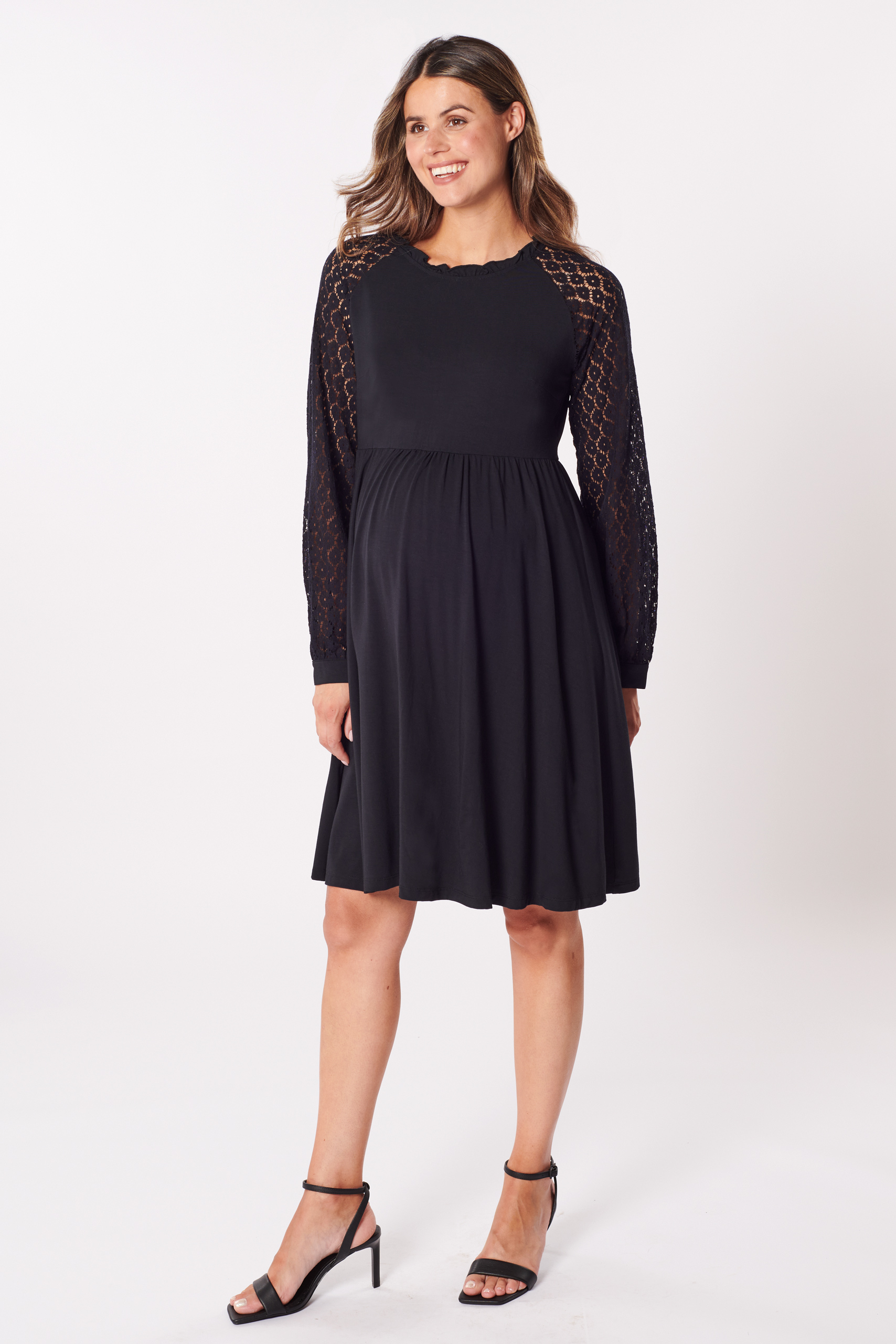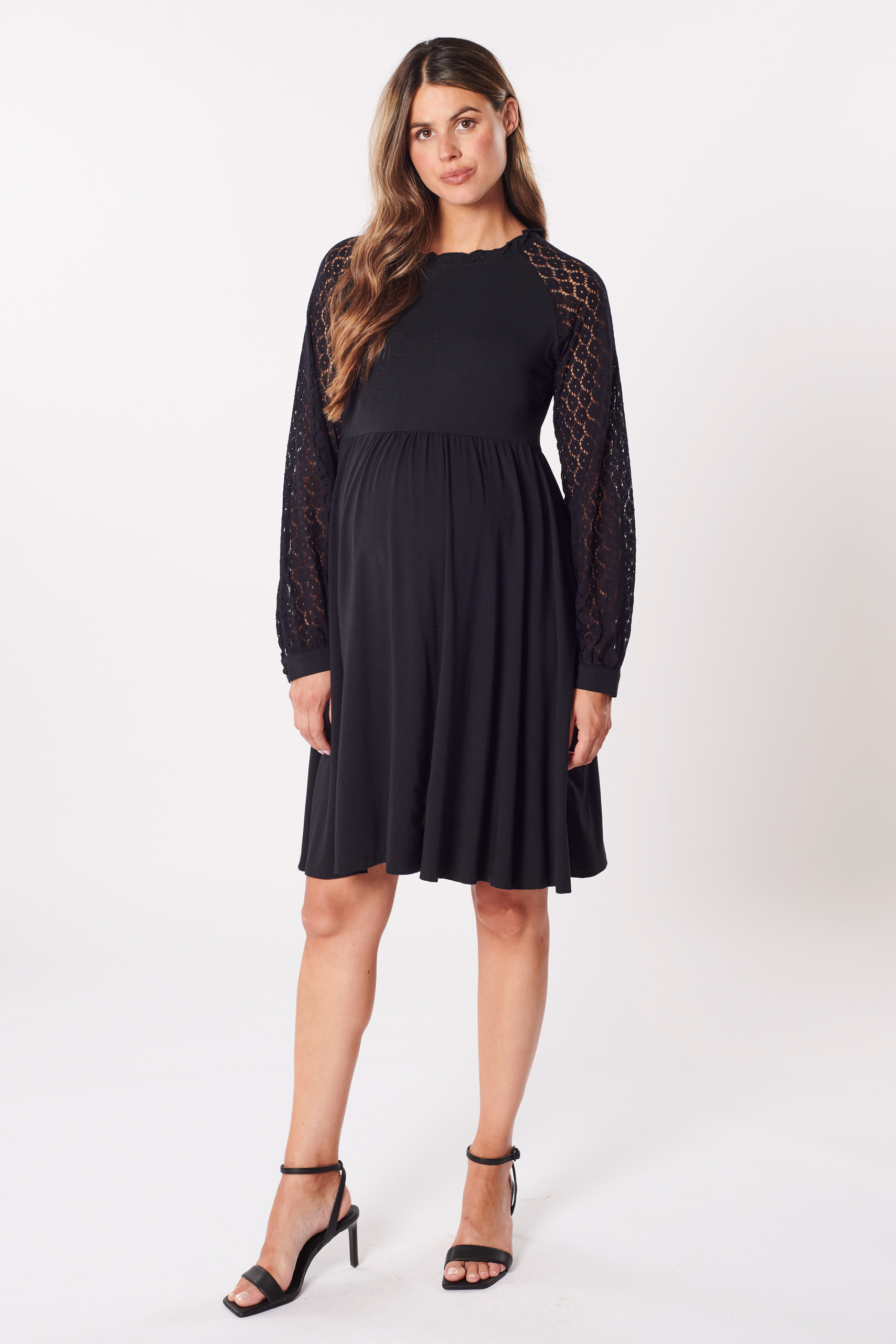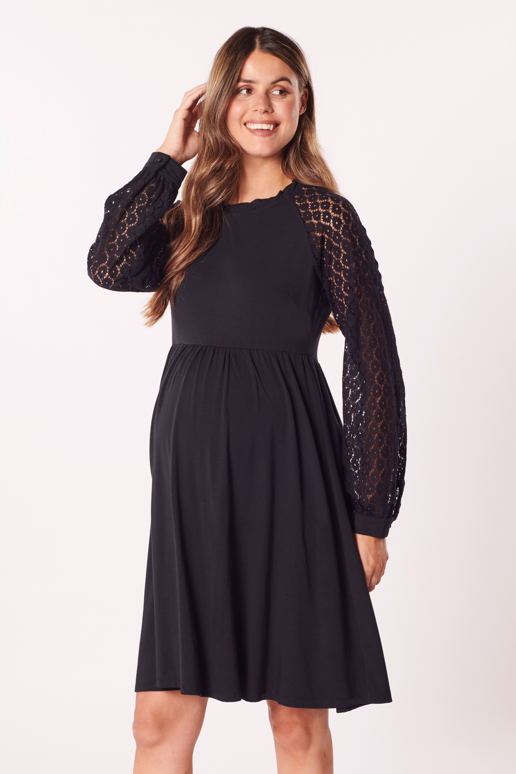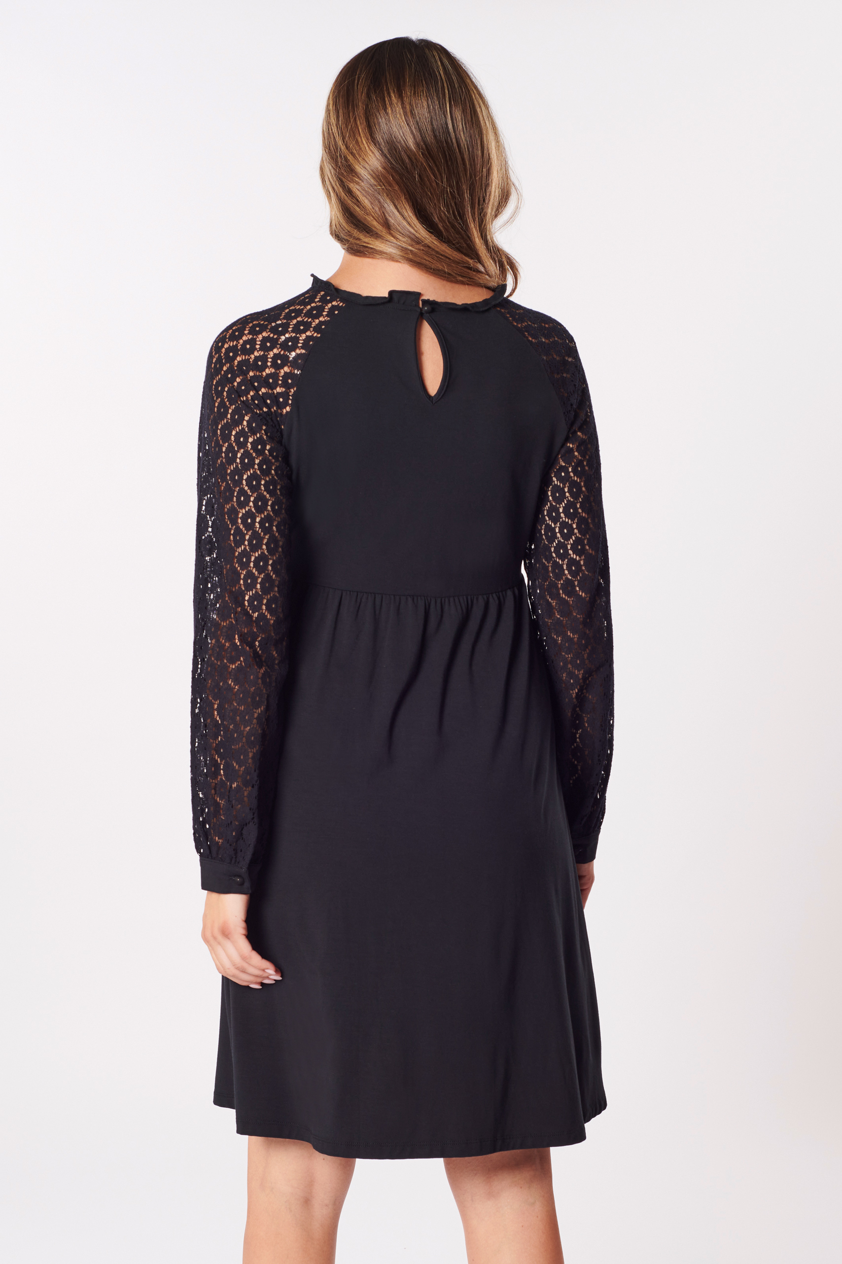 A-Linie Umstandskleid mit Spitzenärmeln aus angenehmer, weicher Bambus-Viskose. Das Kleid ist mit wunderschönen Raglan-Spitzenärmeln gestaltet, die dem Design und deinem Look eine romantische Note verleihen. Das Schlüsselloch-Detail am Rücken sorgt für einen eleganten Akzent, während die charmante A-Linie deine Silhouette sanft betont. Farbe: schwarz