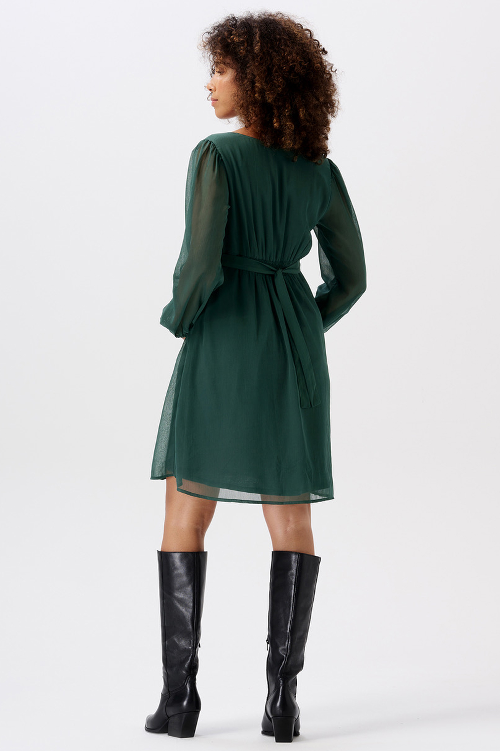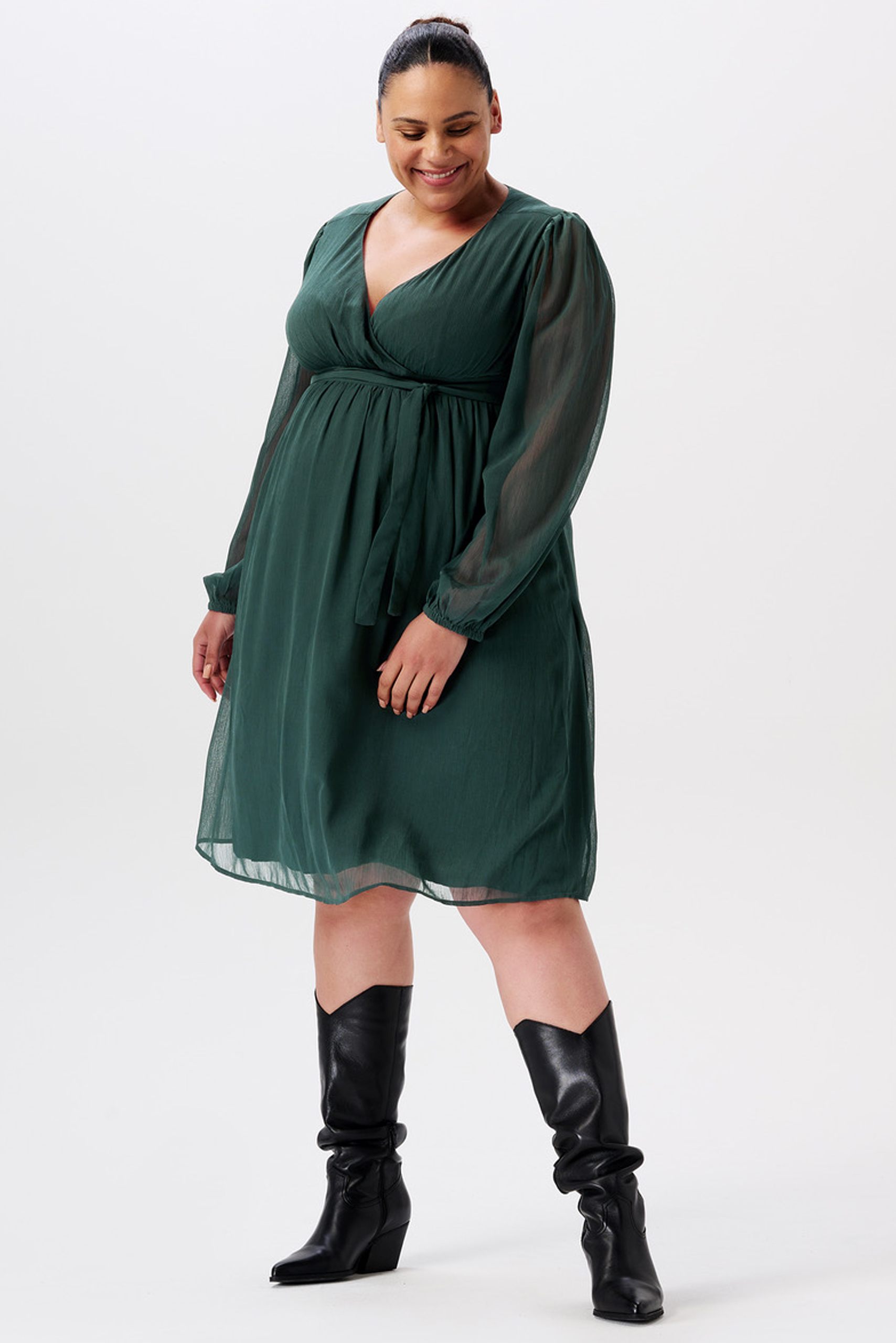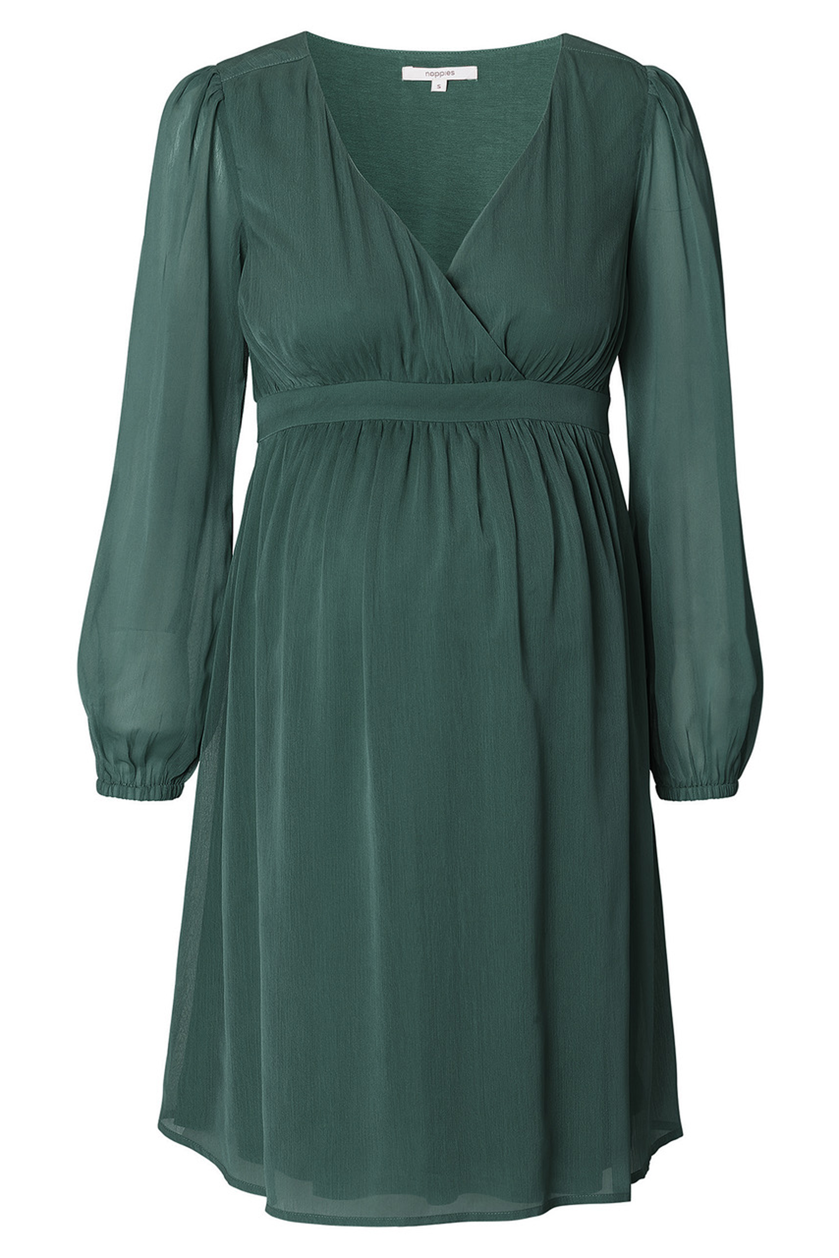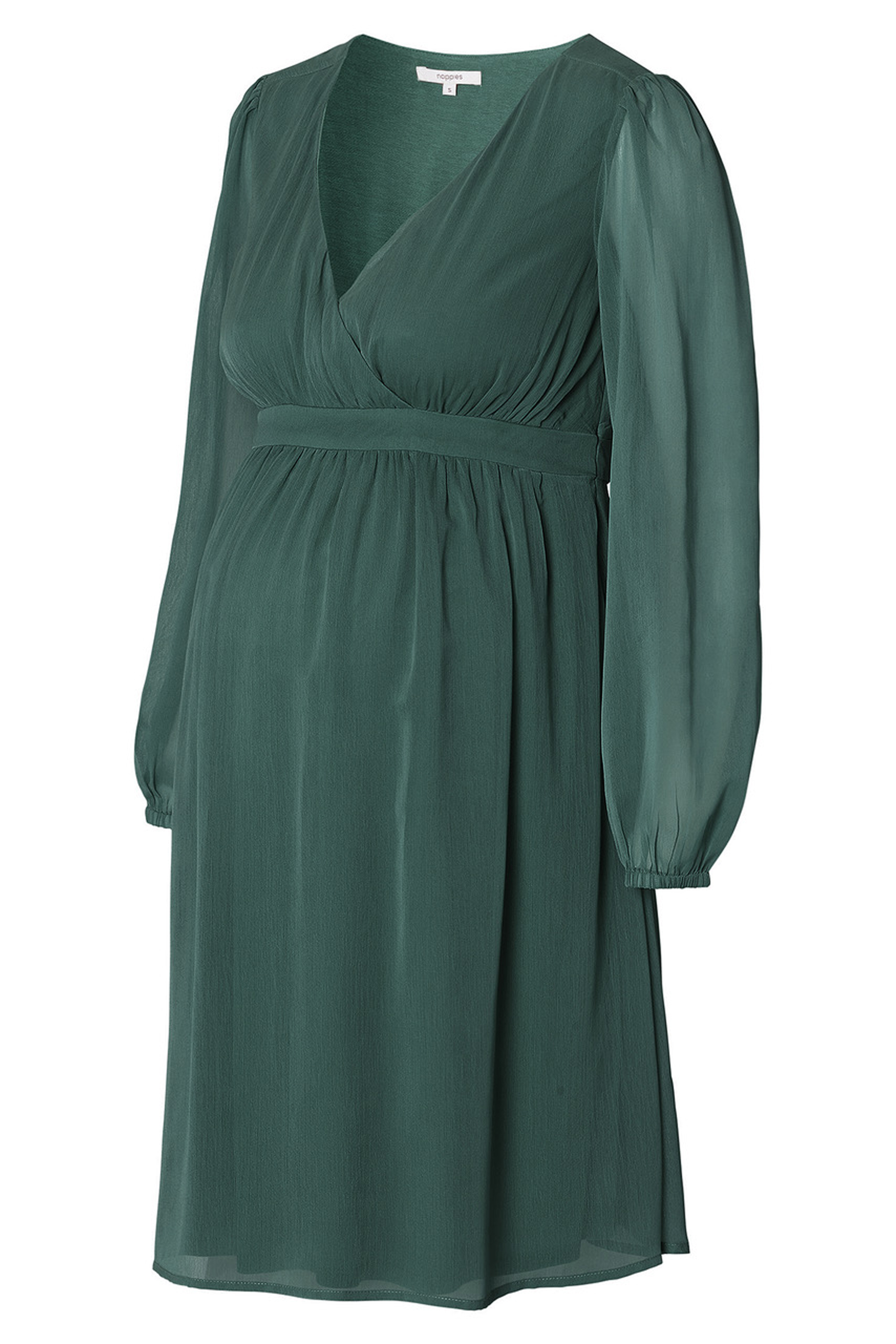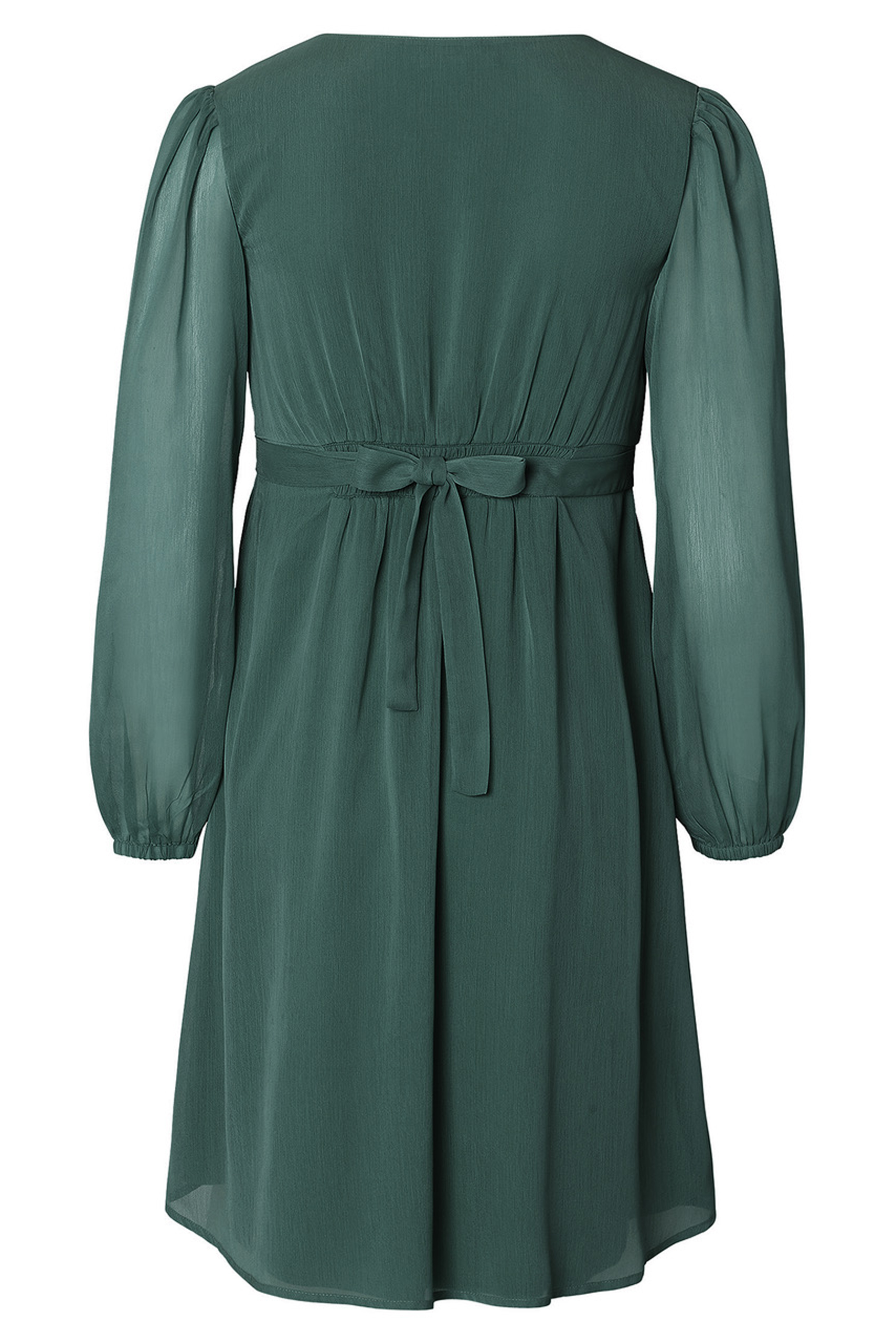 Eco Chiffon Umstandskleid aus weichem Material. Der elegante V-Ausschnitt und die langen, transparenten Puffärmel verleihen dem Kleid einen festlichen und romantischen Look. Das Bindedetail an der Empire Linie betont deinen wachsenden Babybauch und sorgt für eine schöne Passform. Der Chiffon Rock verleiht dem Kleid eine luftige und leichte Note, die dich an besonderen Anlässen zum Strahlen bringt. Farbe: dunkelgrün