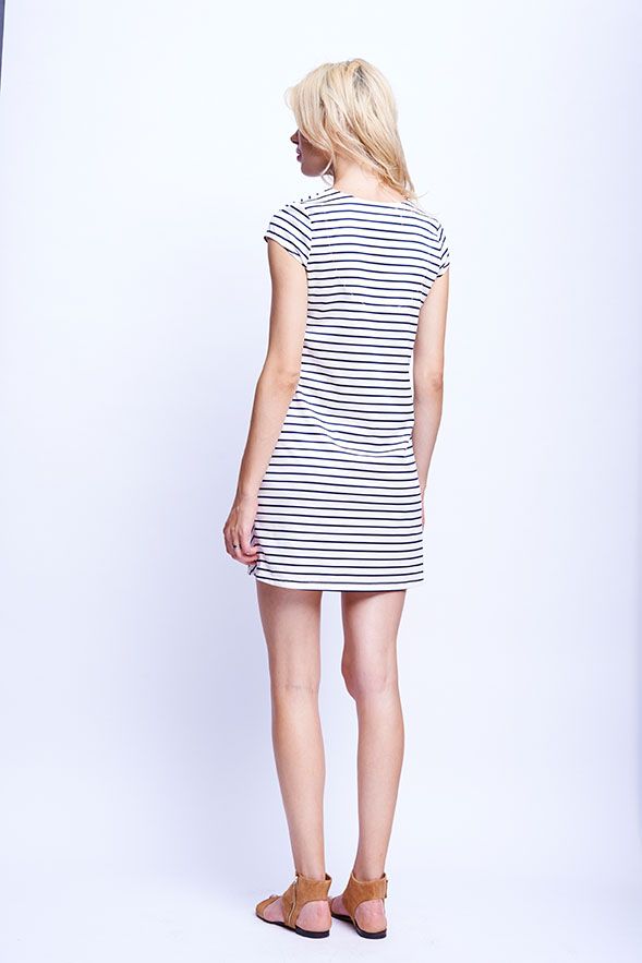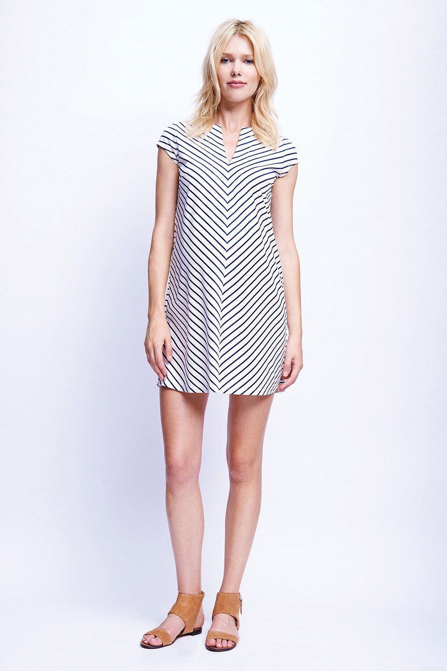 Umstandskleid mit schmalem V-Ausschnitt und zusammenlaufendem Streifen-Muster. Farbe: schwarz/weiß