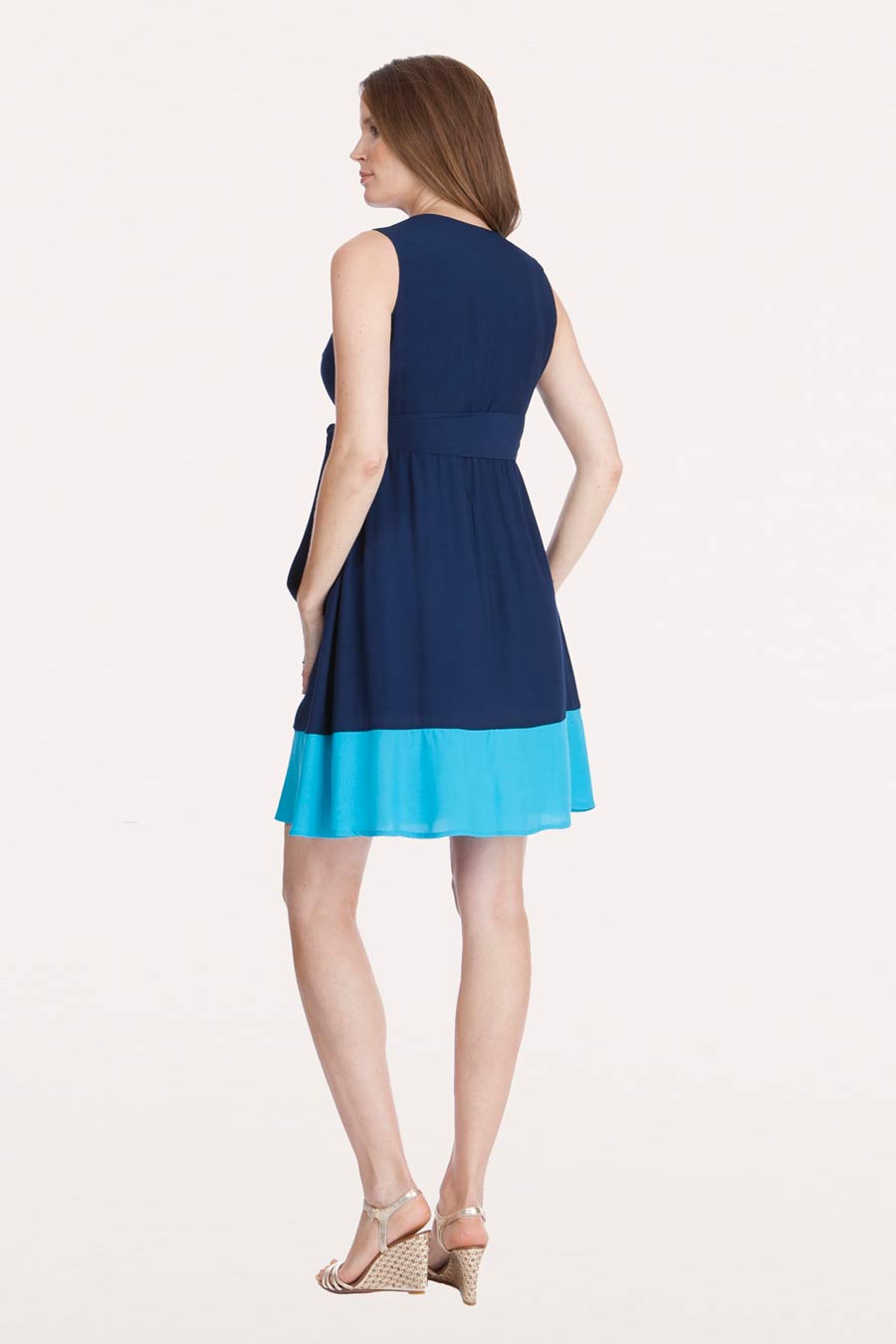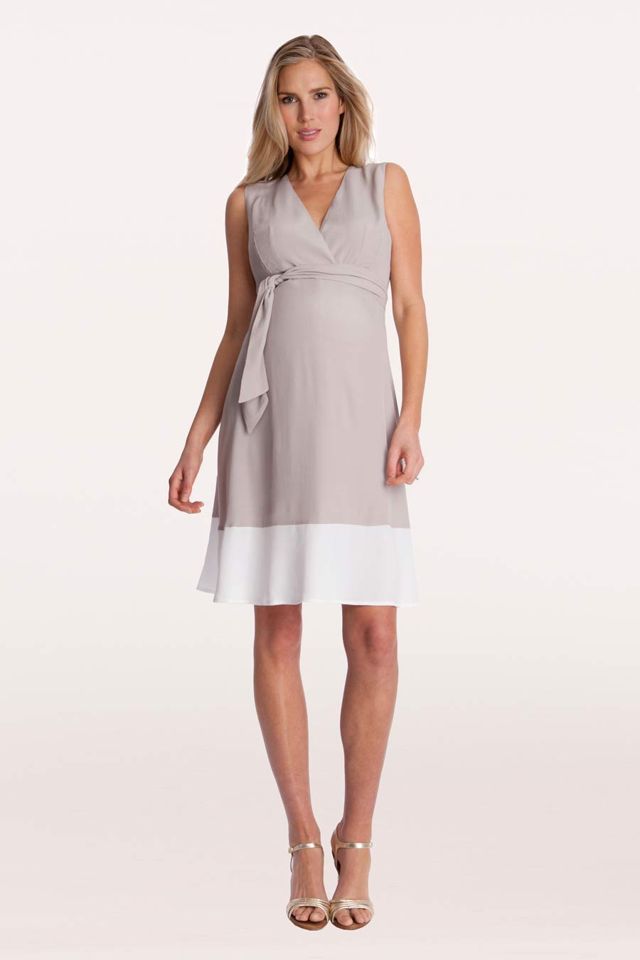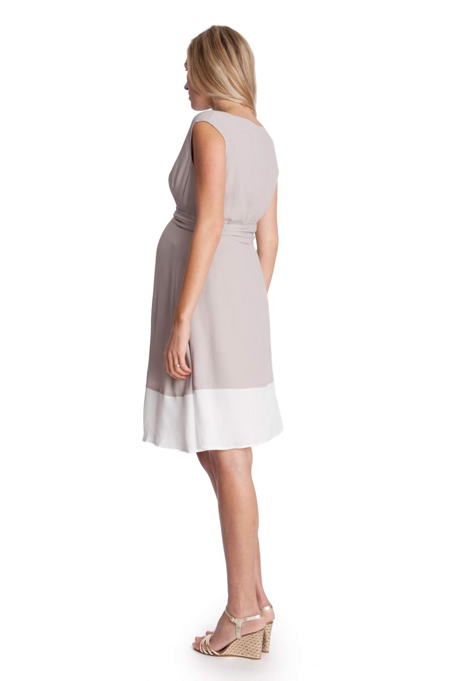 Umstandskleid im Colour Block Design mit Cache-Coeur-Ausschnitt und Bindegürtel. Farben: taupe/creme, blau/türkis