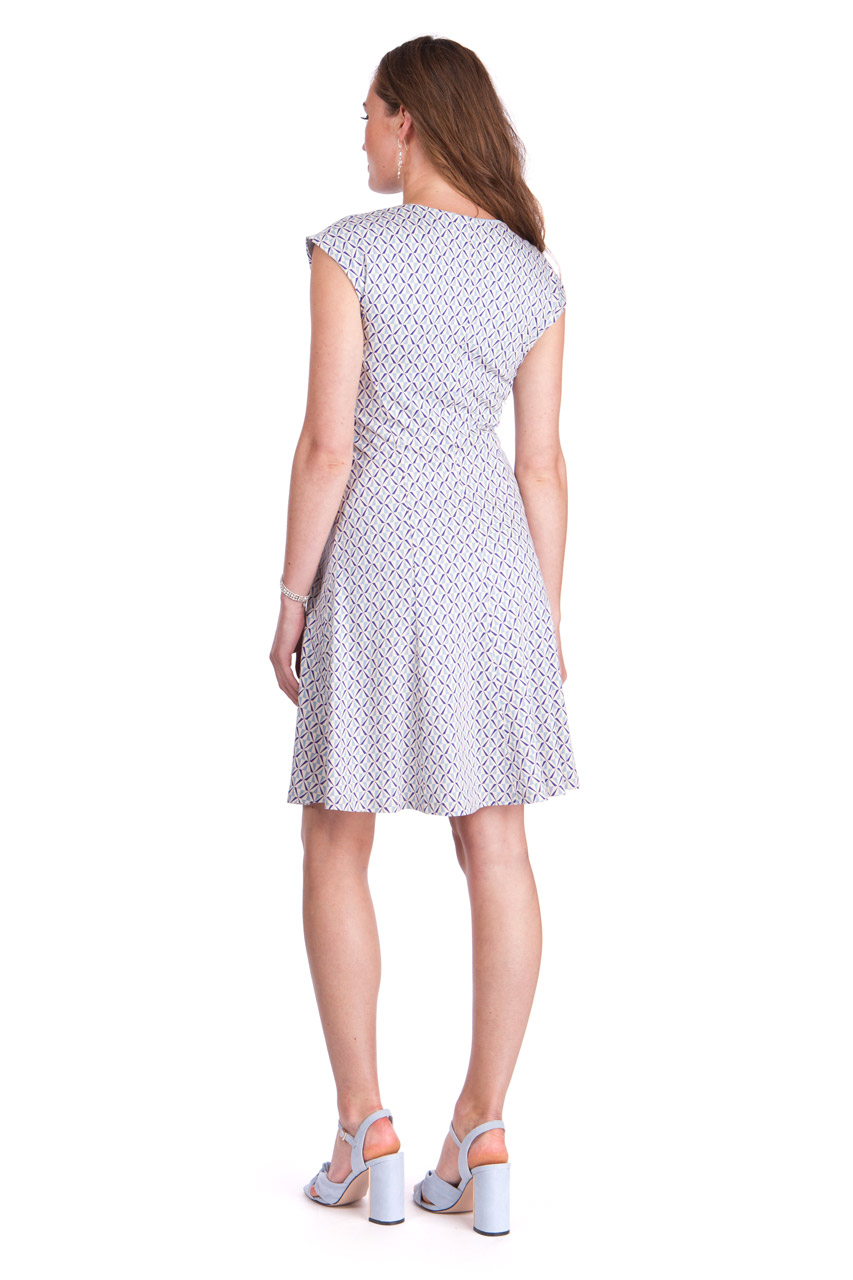 Umstandskleid in A-Linie aus weichem Stretch Jersey mit geometrischem Print, das sich in der Schwangerschaft bequem an deinen Bauch anpasst. Besonderes Highlight ist das Knotendetail an der Brust für eine schöne Betonung der Empire Linie. Farbe: blau/print