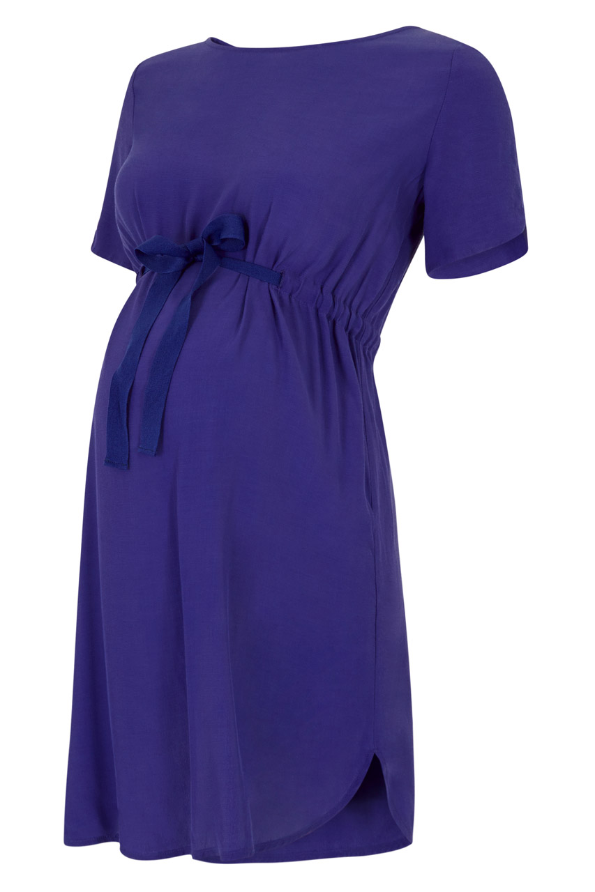 Umstandskleid mit Rückenausschnitt, abgerundetem Saum und flexiblem Tunnelzug an der Empire Line. Besonders trendig: am Rücken hat das Kleid einen auffälligen Ausschnitt. Farbe: blau