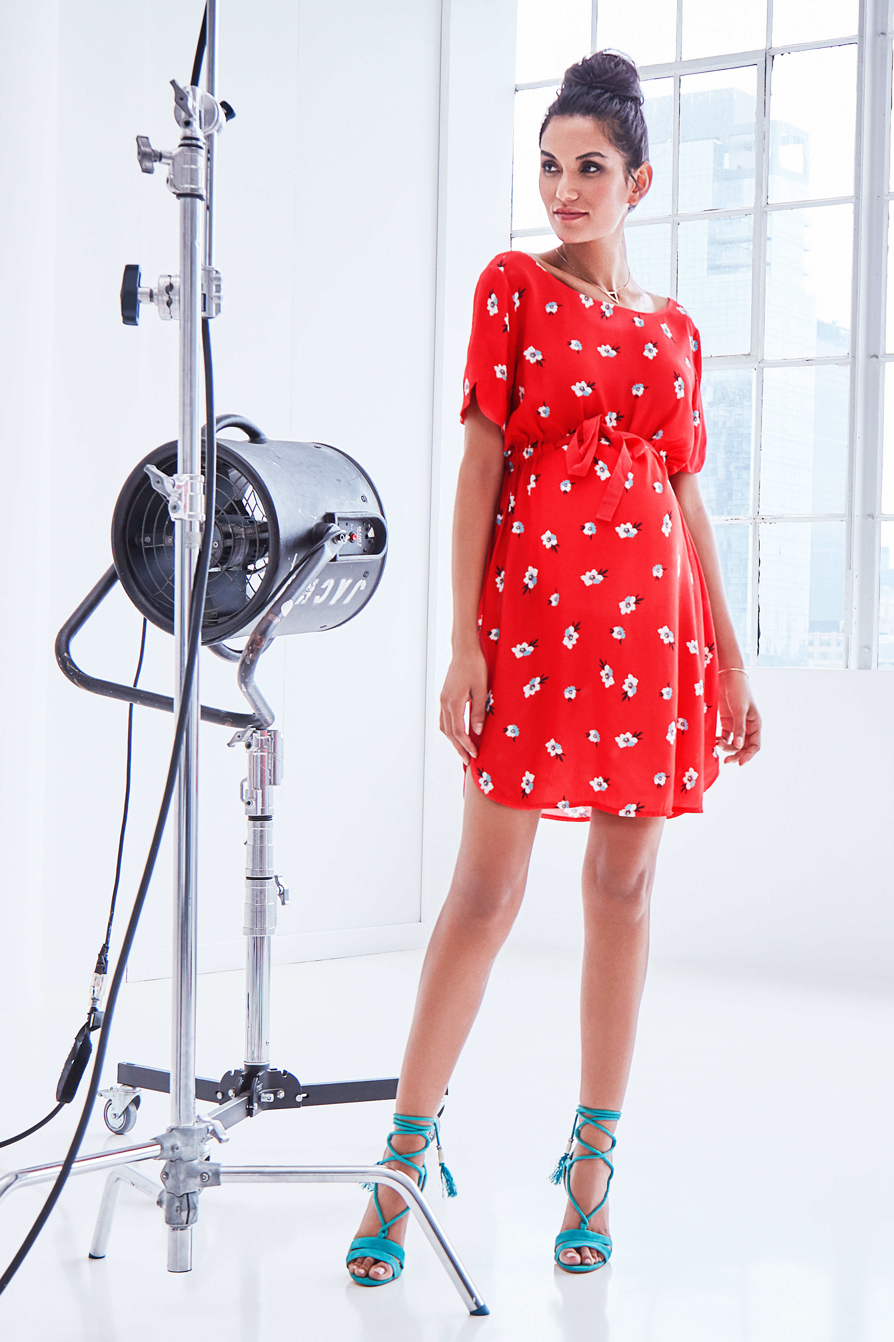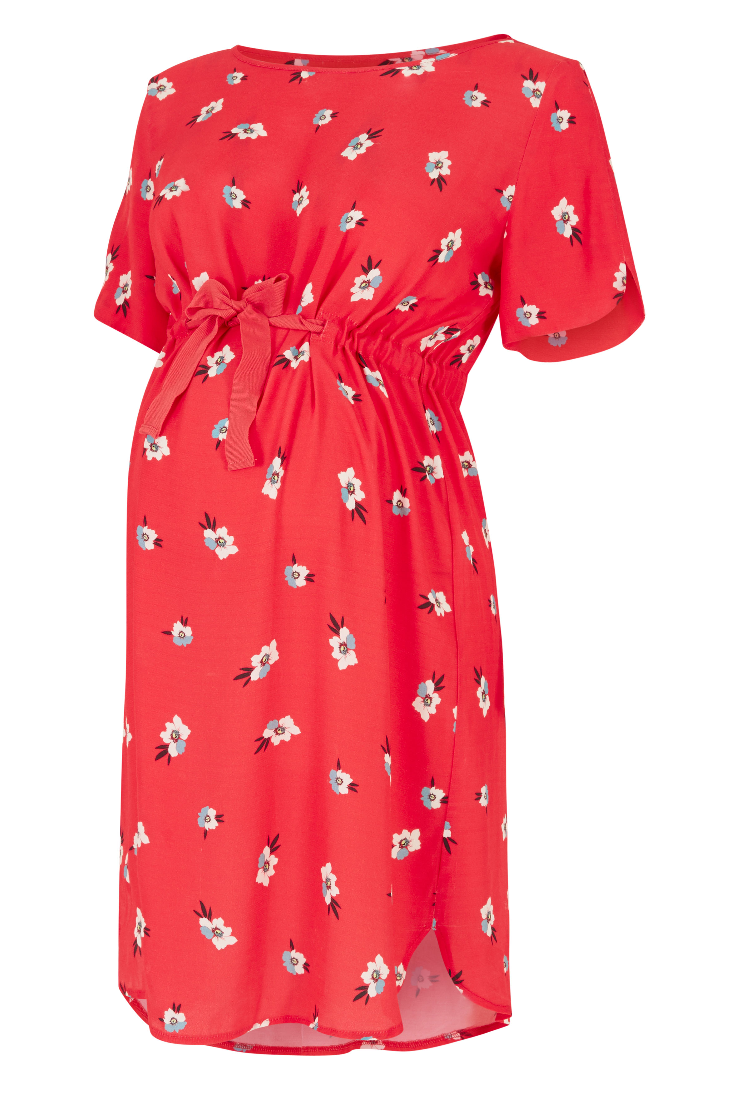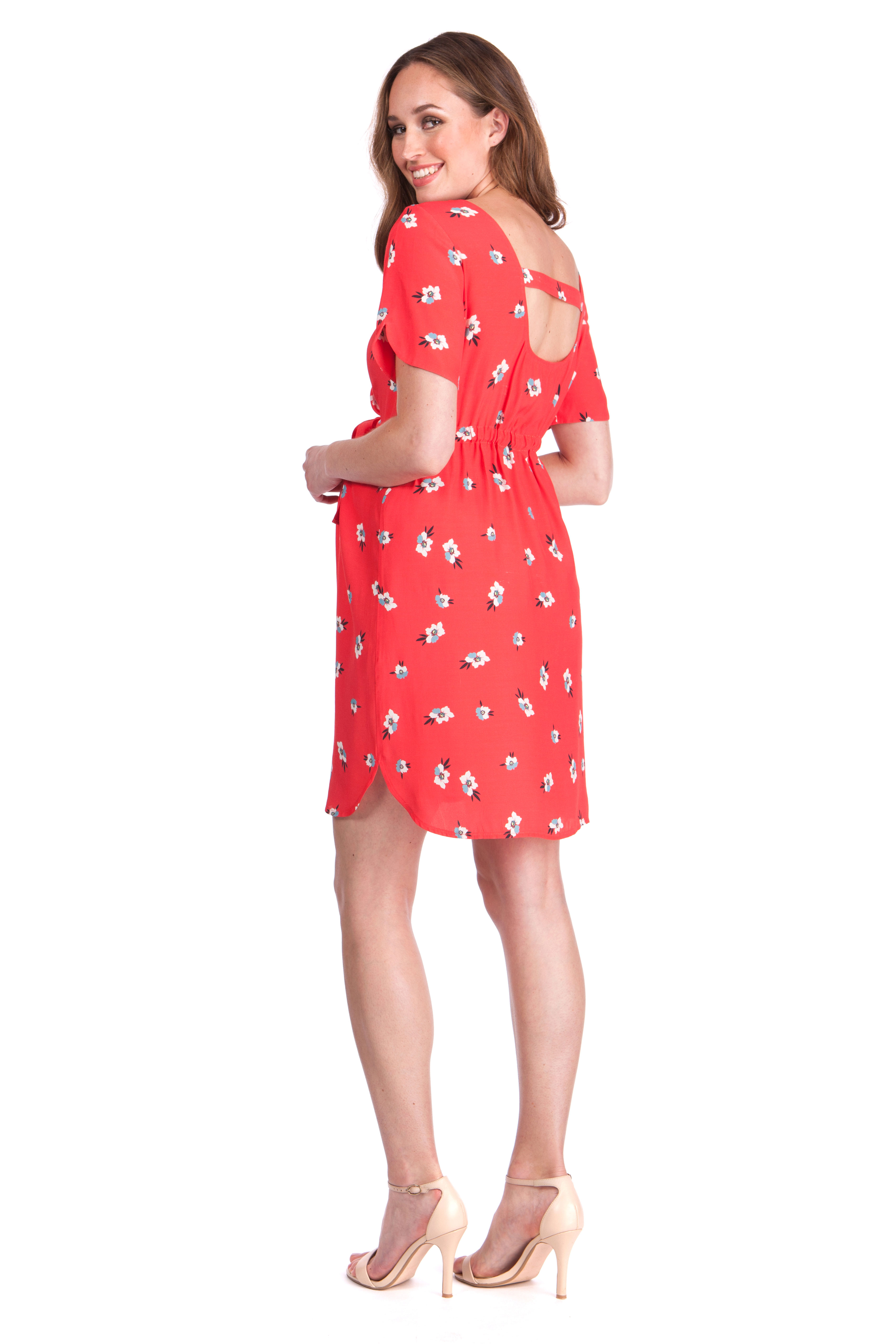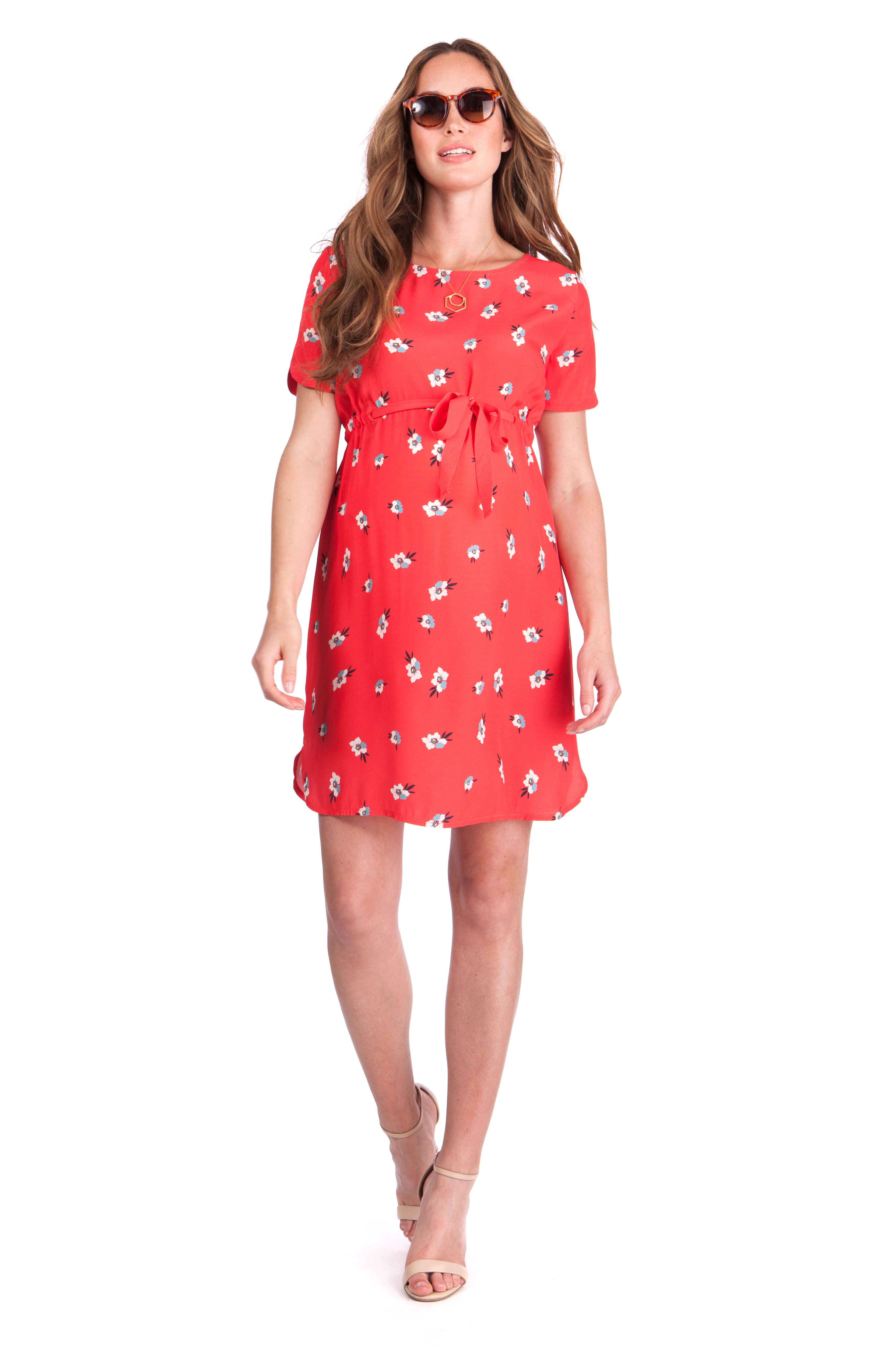 Umstandskleid mit trendigem Rückenausschnitt, Blümchenprint und Tunnelzug zur Betonung der Empire Line. Farbe: rot/print