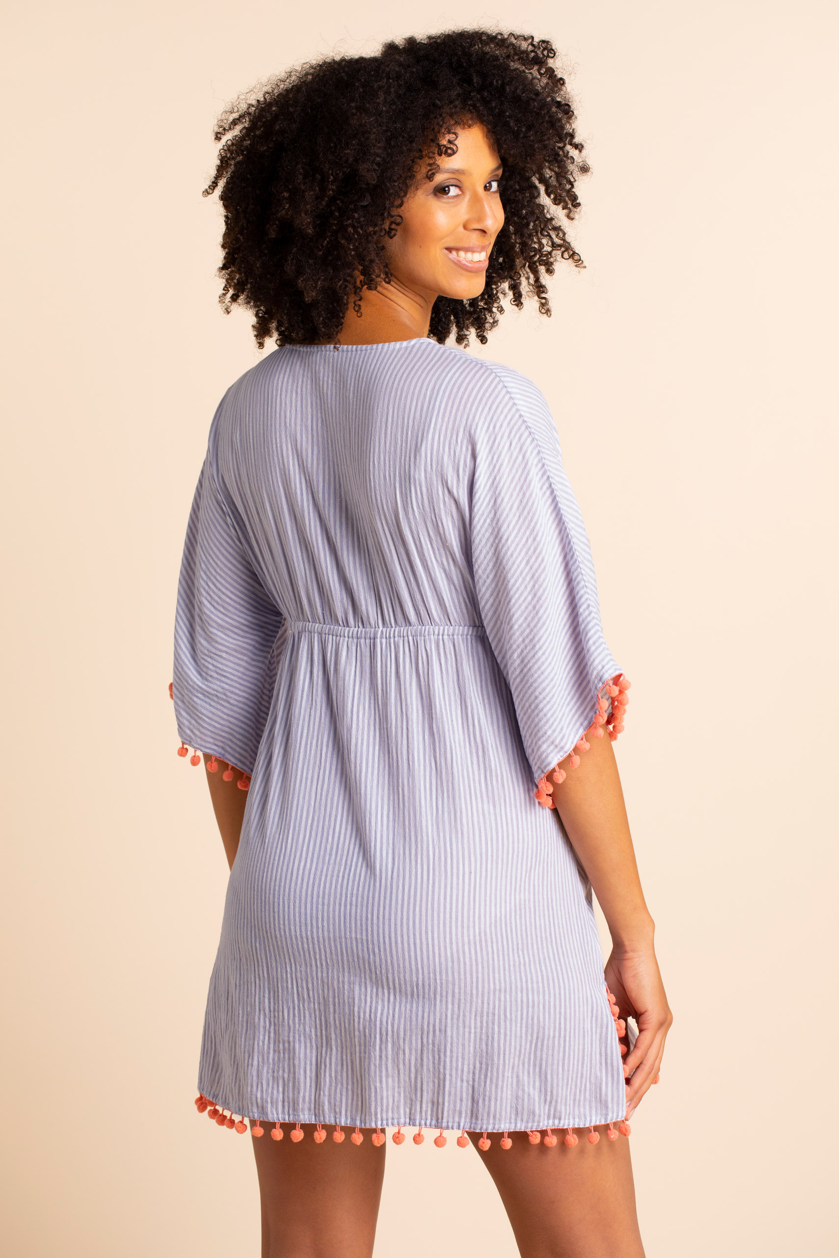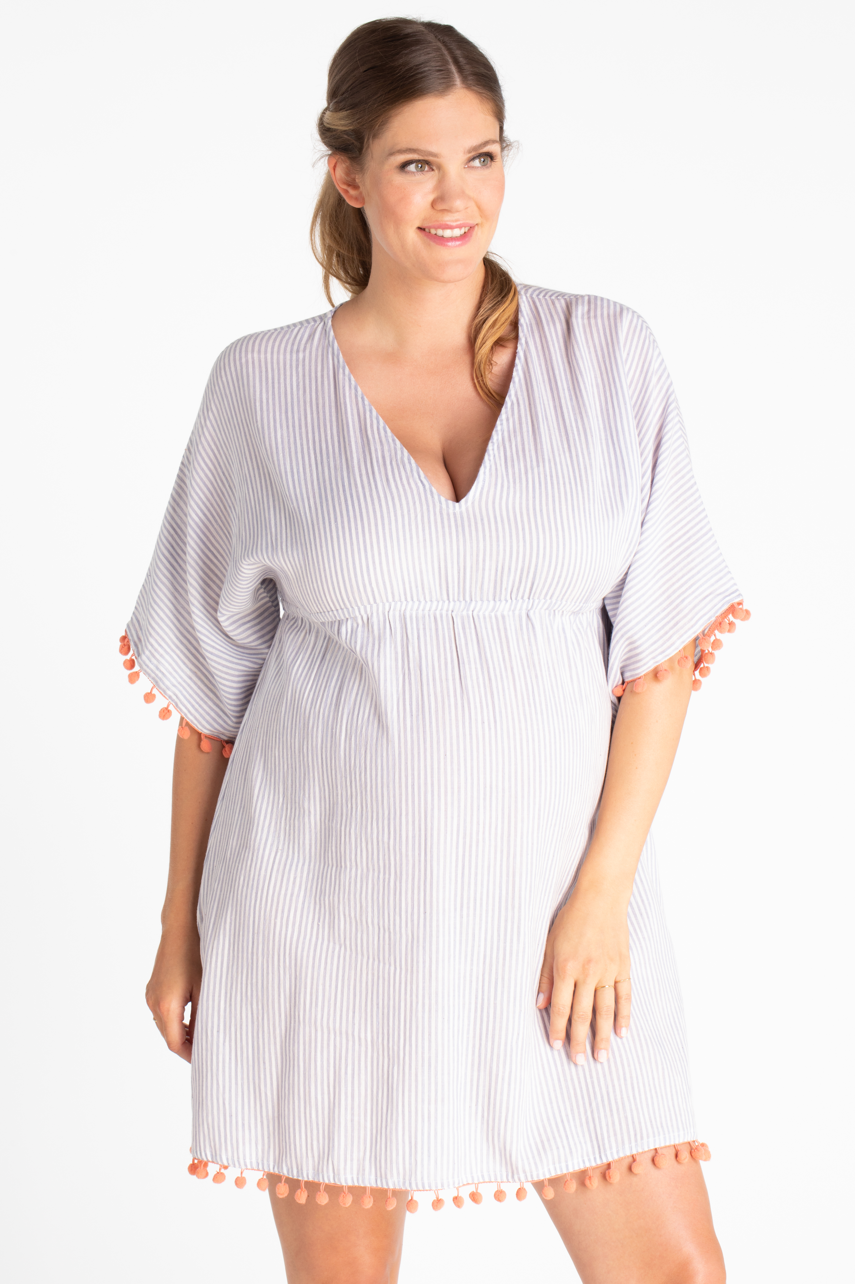 Kurzer Umstands-Kaftan aus reiner Baumwolle mit V-Ausschnitt, seitlichen Schlitzen und korallfarbener Pompomborte an den Bündchen und am Saum. Eine elastische Naht unterhalb der Brust sorgt für eine vorteilhafte Silhouette, egal in welchem Schwangerschafts-Trimester du dich gerade befindest. Auch nach der Geburt kannst du das sommerliche Dress noch prima weitertragen. Das perfekte Piece für deine Urlaubsreise: Ziehe es ganz einfach über deinen Bikini oder Badeanzug für den Weg zum oder Spaziergänge am Strand. Ein Must Have für deinen Sommer mit oder später ohne Babybauch! Farbe: weiß/blau