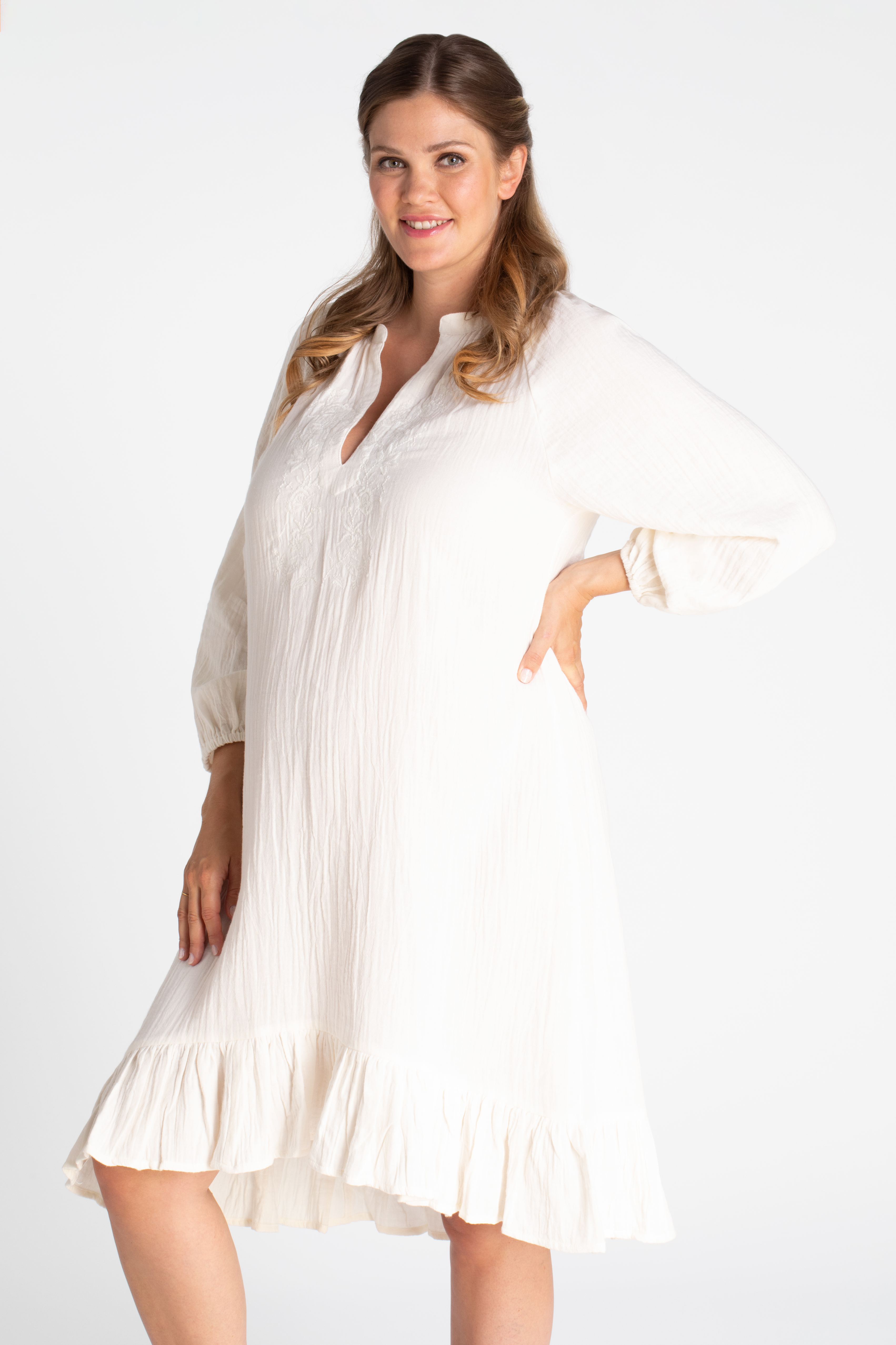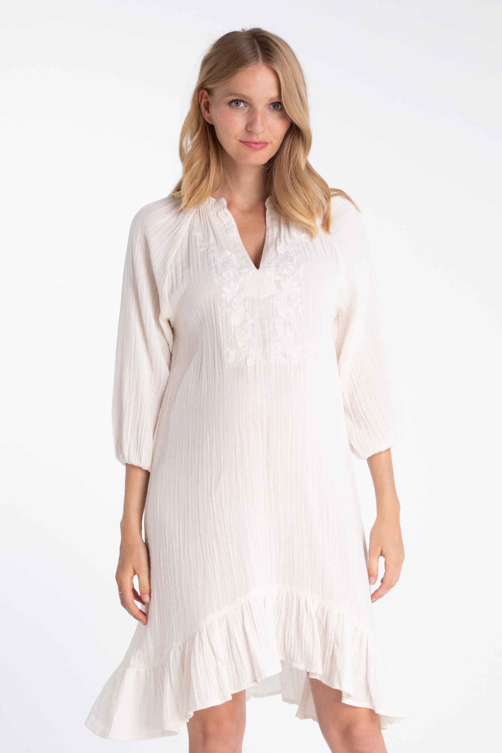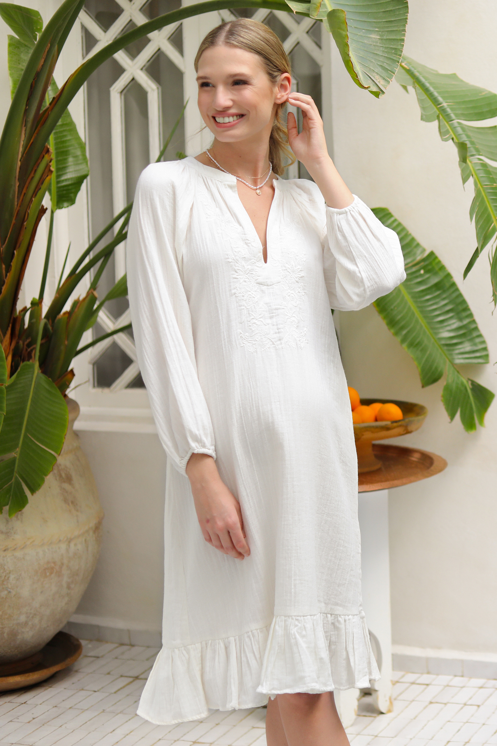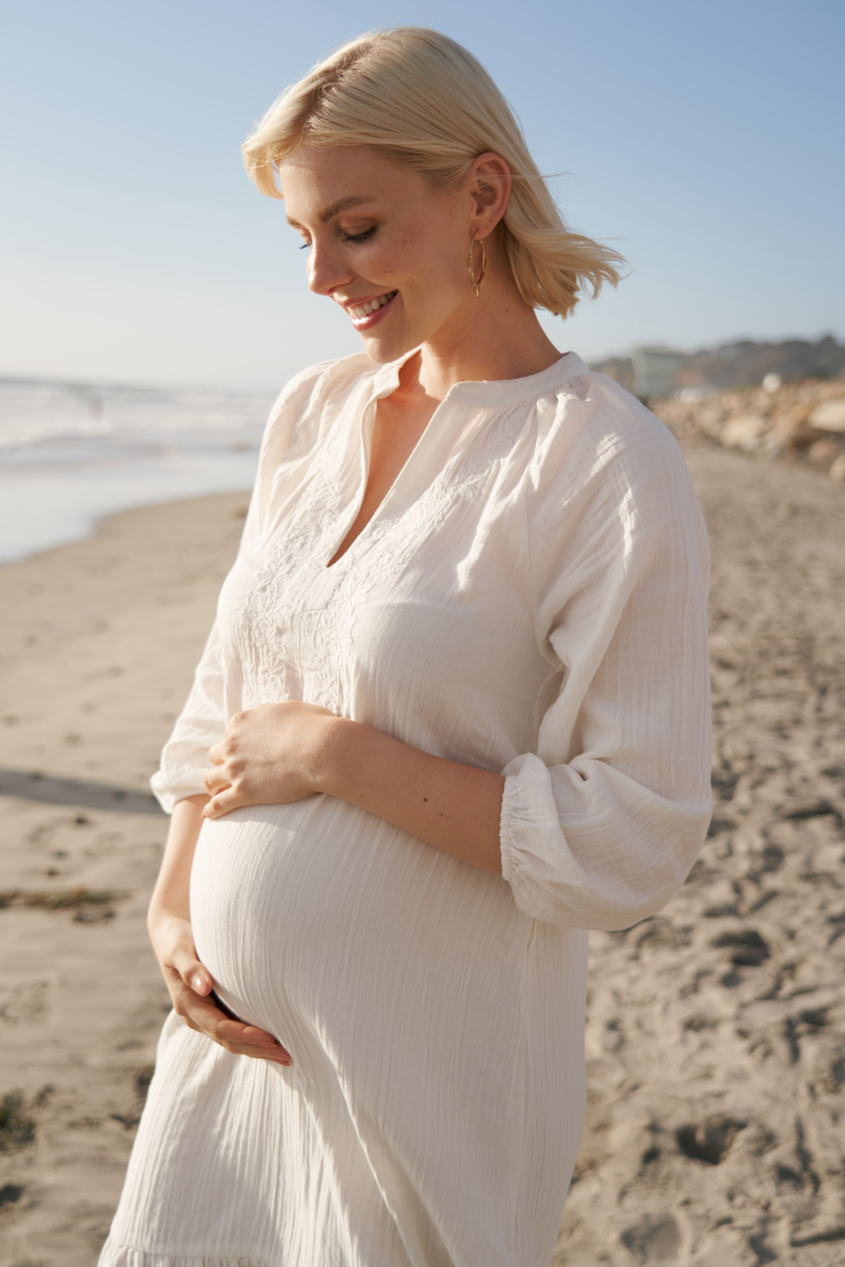 Kurzes Umstandskleid aus reiner Baumwolle mit V-Ausschnitt, halblangen Ärmeln und Volantsaum. Stickereien am Ausschnitt verleihen dem Dress einen sommerlichen Boho Style. Das softe Material trägt sich super angenehm und das Kleid fällt wegen des weiten Schnitts wunderbar leicht über deinen wachsenden Babybauch. Ein absolutes Essential für deine Sommergarderobe, übrigens auch noch später nach der Geburt. Farbe: weiß