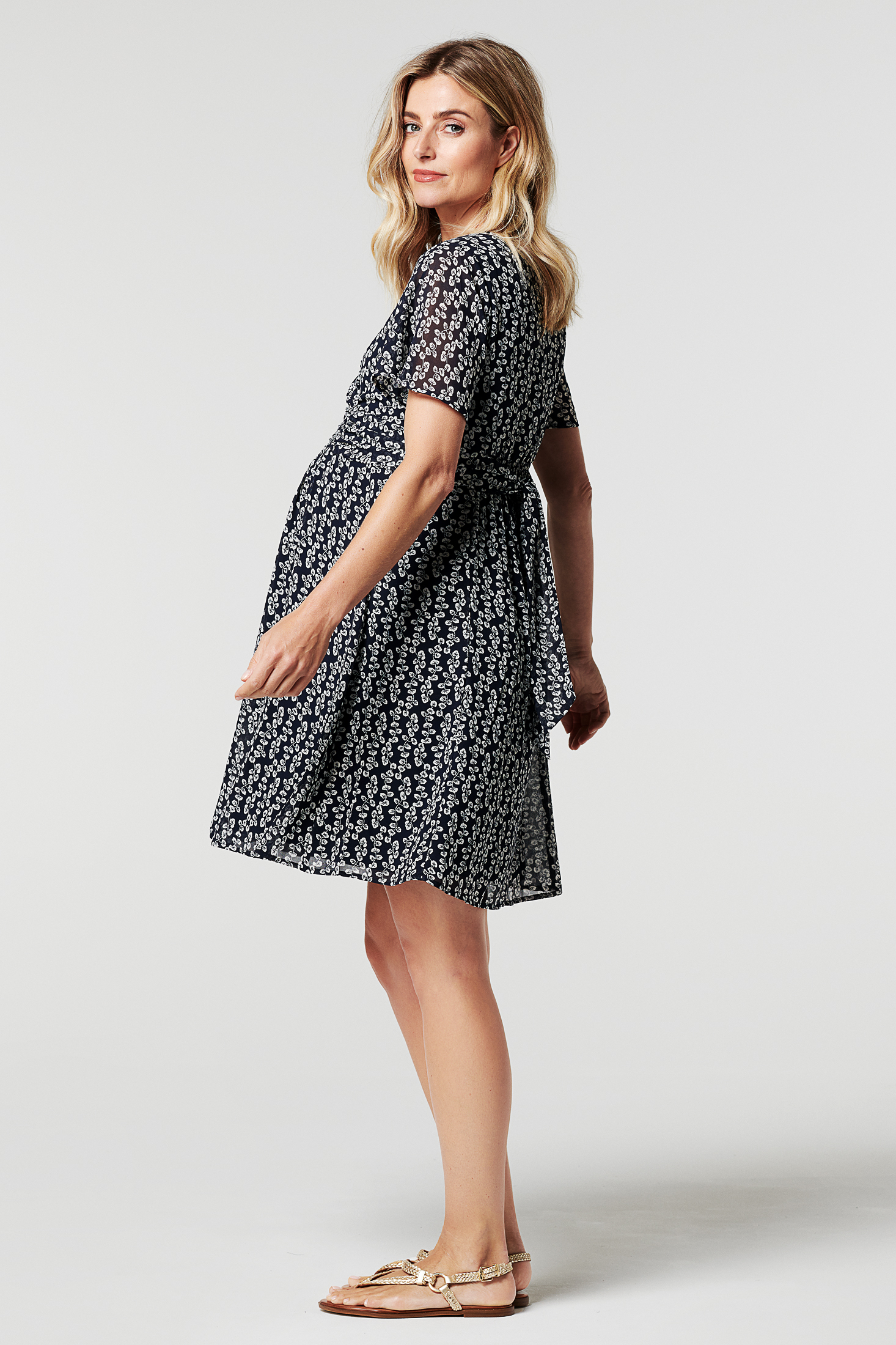 Chiffon Umstandskleid mit Cross-Over Ausschnitt und kurzen, halbtransparenten Flügelärmeln. Raffungen am Ausschnitt und unter der Brust stellen sicher, dass dein wachsender Bauch jederzeit genügend Spielraum hat. Ein breites Band an der Empirelinie schafft eine schöne Silhouette und betont deinen Babybauch besonders. Farbe: navy/weiß