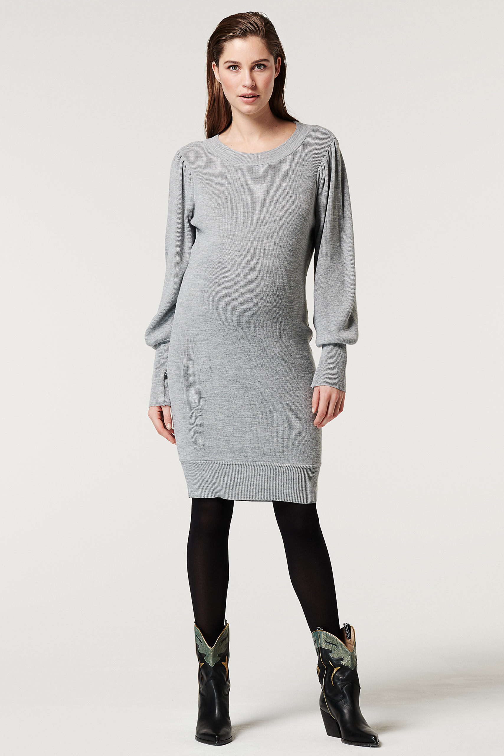 Umstandsstrickkleid mit Rundhalsausschnitt und langen Ballonärmeln, die dem Dress einen besonders modernen und femininen Look verleihen. Das gerade geschnittene Kleid bietet bis zur Geburt genügend Platz für deinen Babybauch. Farbe: grau